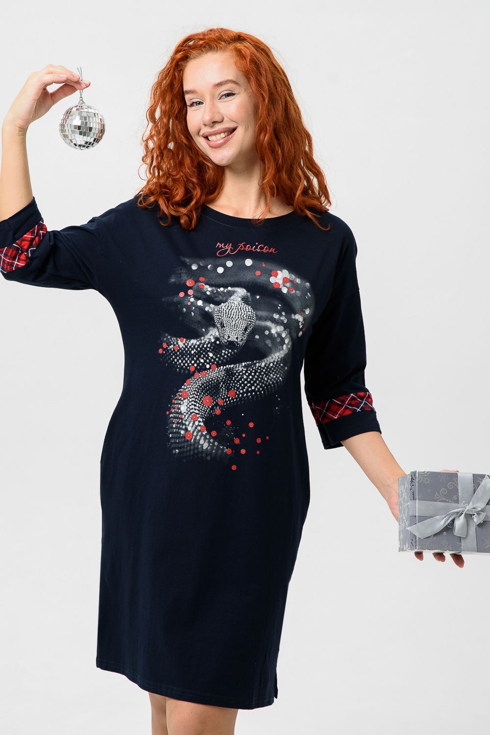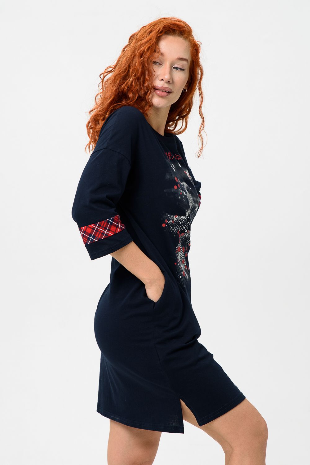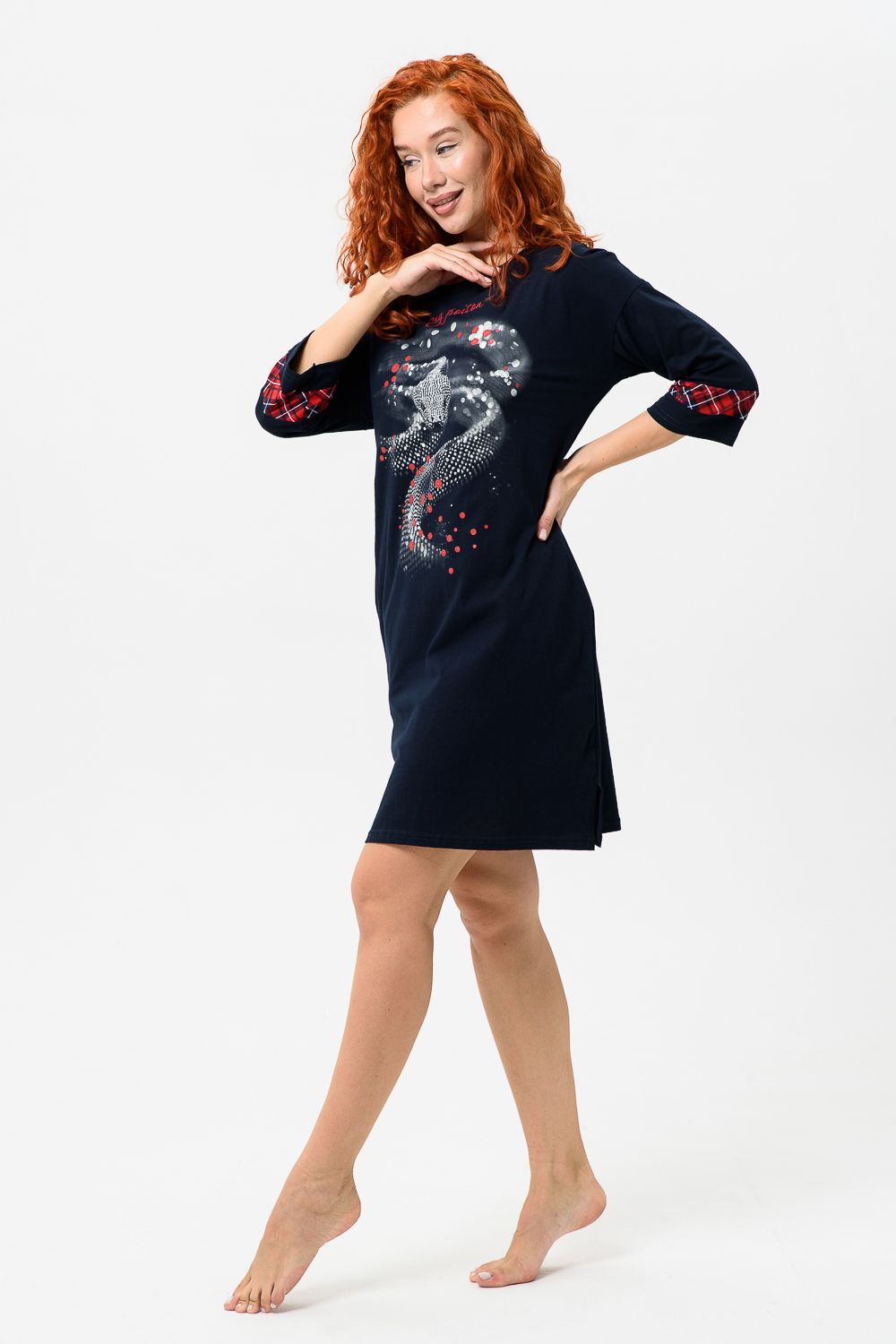 Туника прямого силуэта, длиной выше колена, с округлой горловиной, с карманами в боковых швах. Рукав длиной 3/4. С разрезами в нижней части боковых швов. Горловина обработана обтачкой из основного полотна.