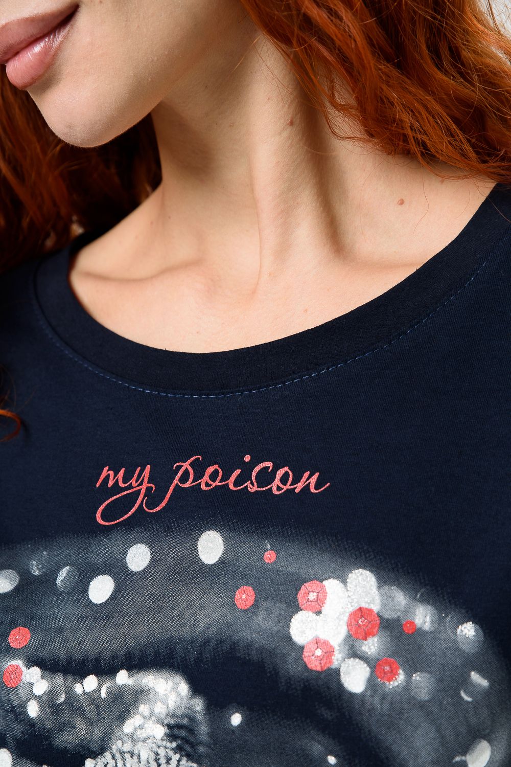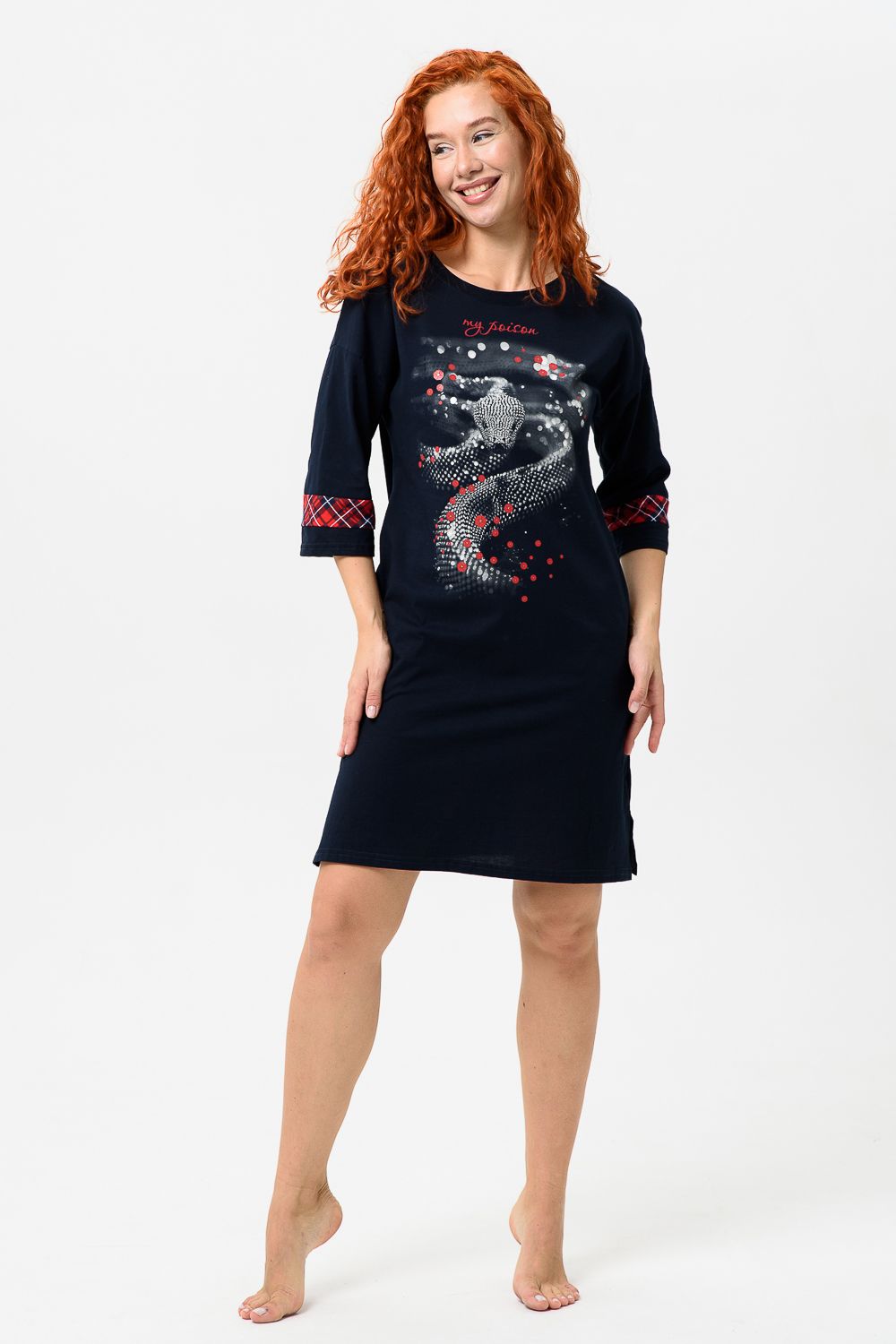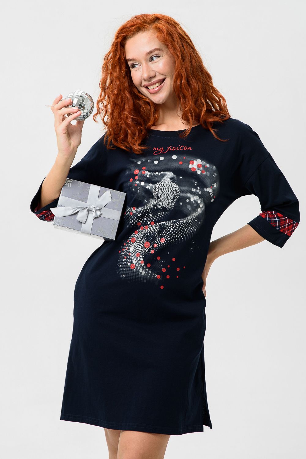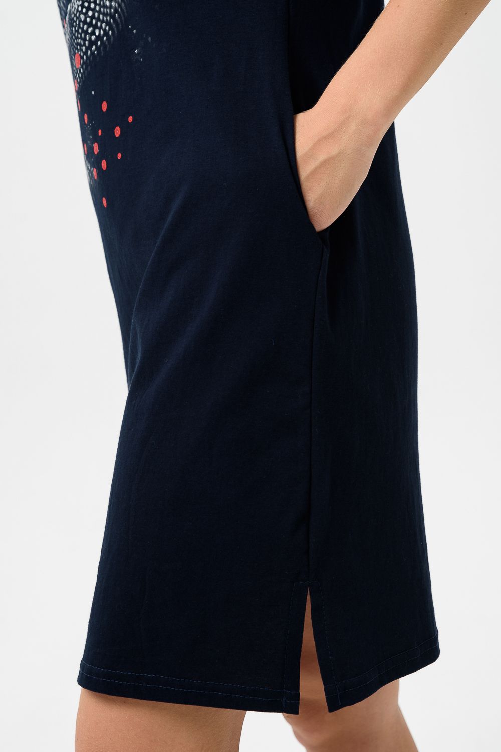Туника прямого силуэта, длиной выше колена, с округлой горловиной, с карманами в боковых швах. Рукав длиной 3/4. С разрезами в нижней части боковых швов. Горловина обработана обтачкой из основного полотна.