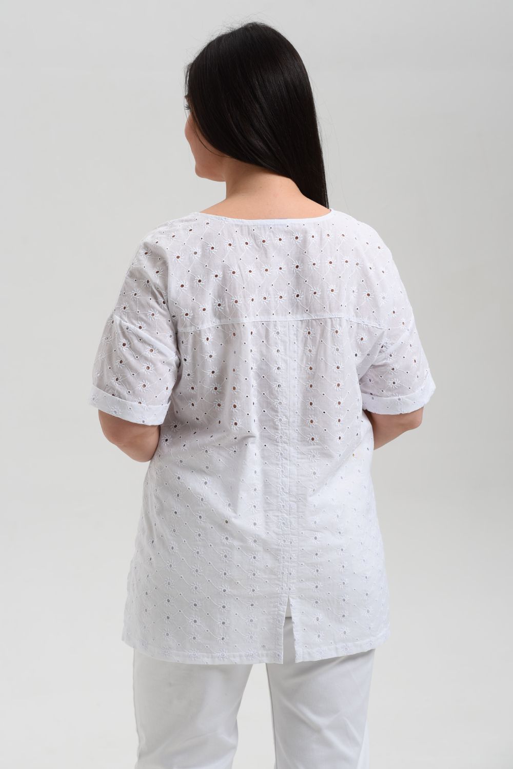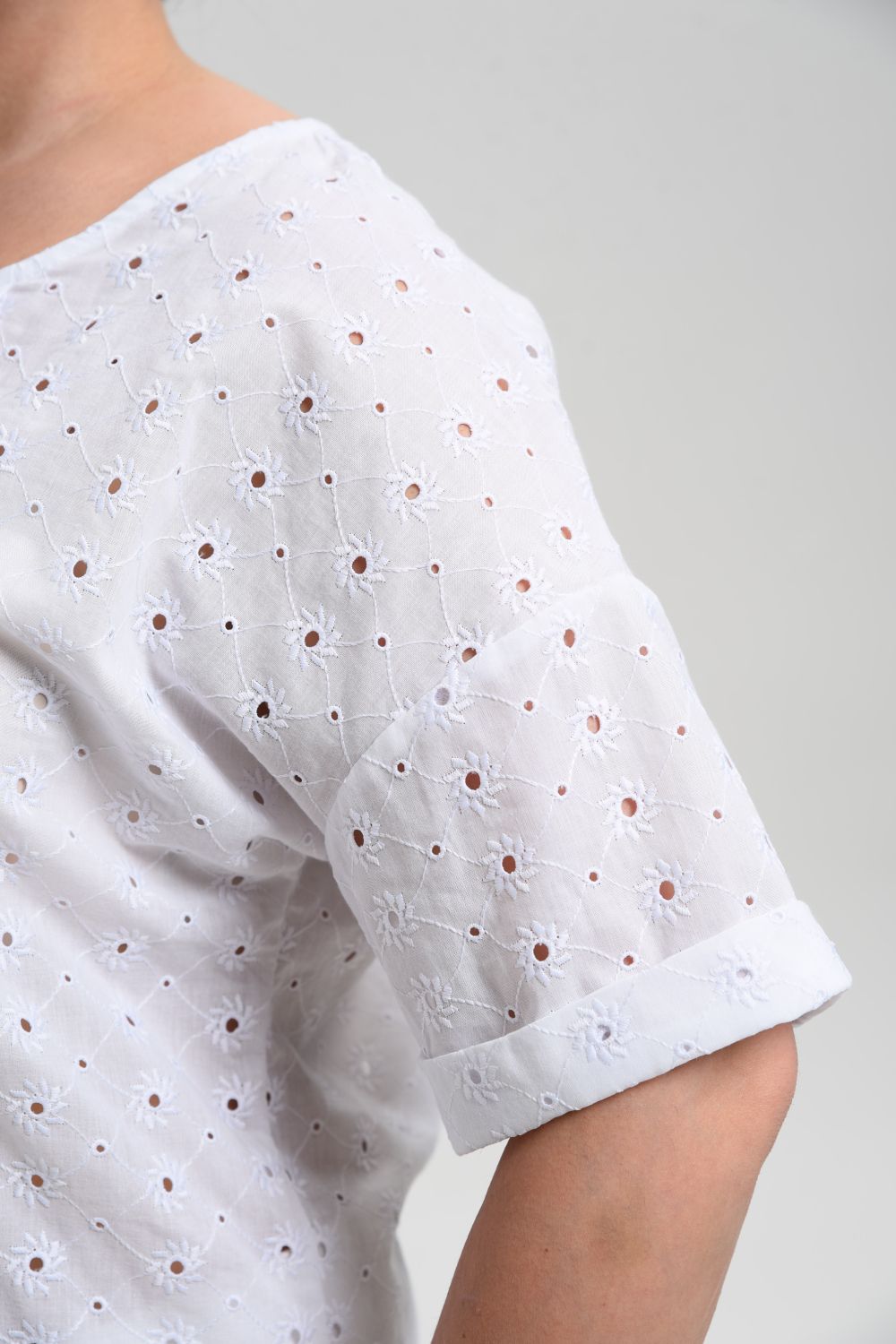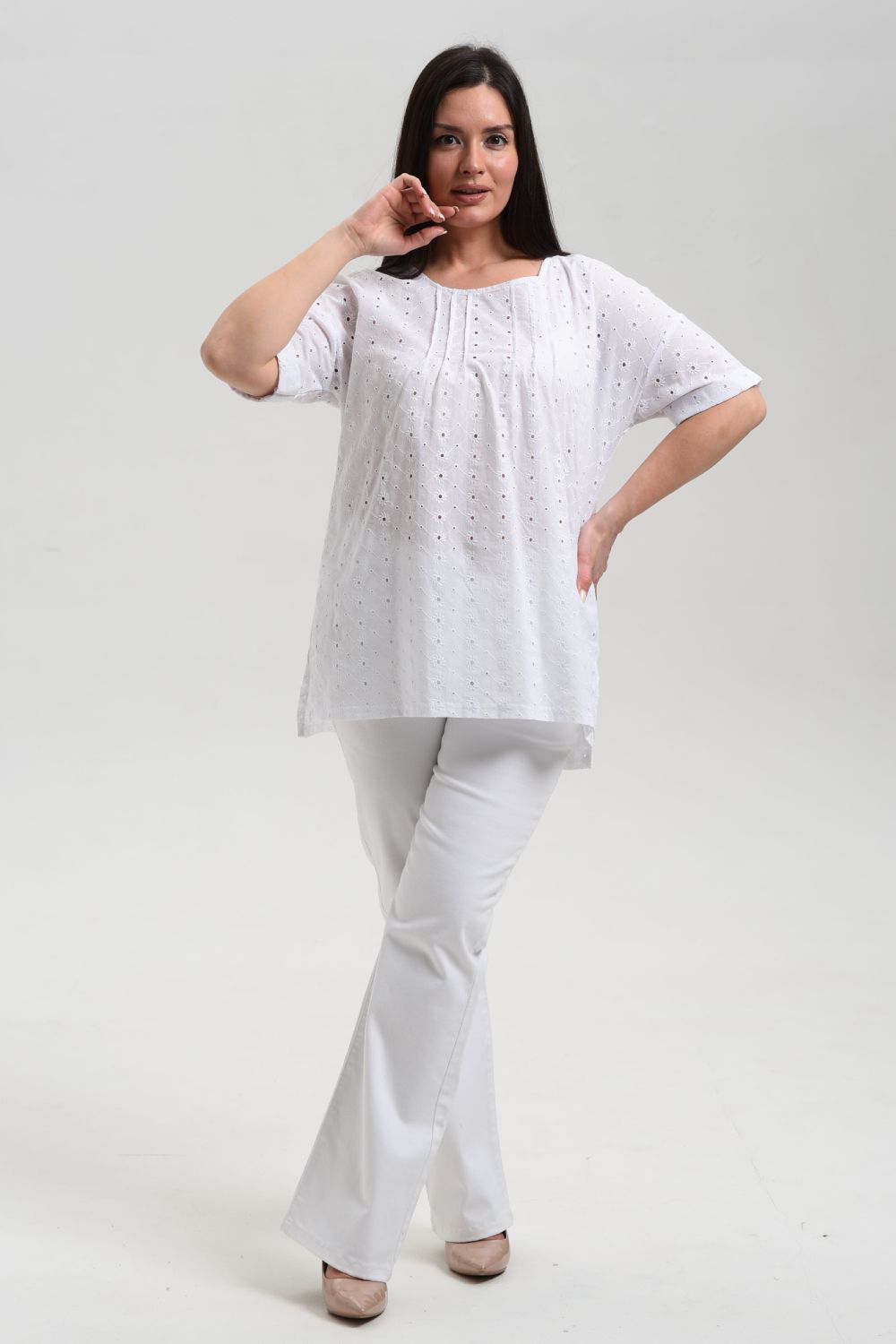Туника прямая, свободная, с округлой горловиной, с удлиненной спинкой. Рукав короткий, с манжетом. В верхней части полочки обработаны декоративные защипы. Спинка с кокеткой. В нижней части боковых швов расположены разрезы. Горловина обработана бейкой из основного полотна.