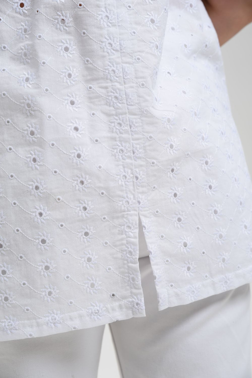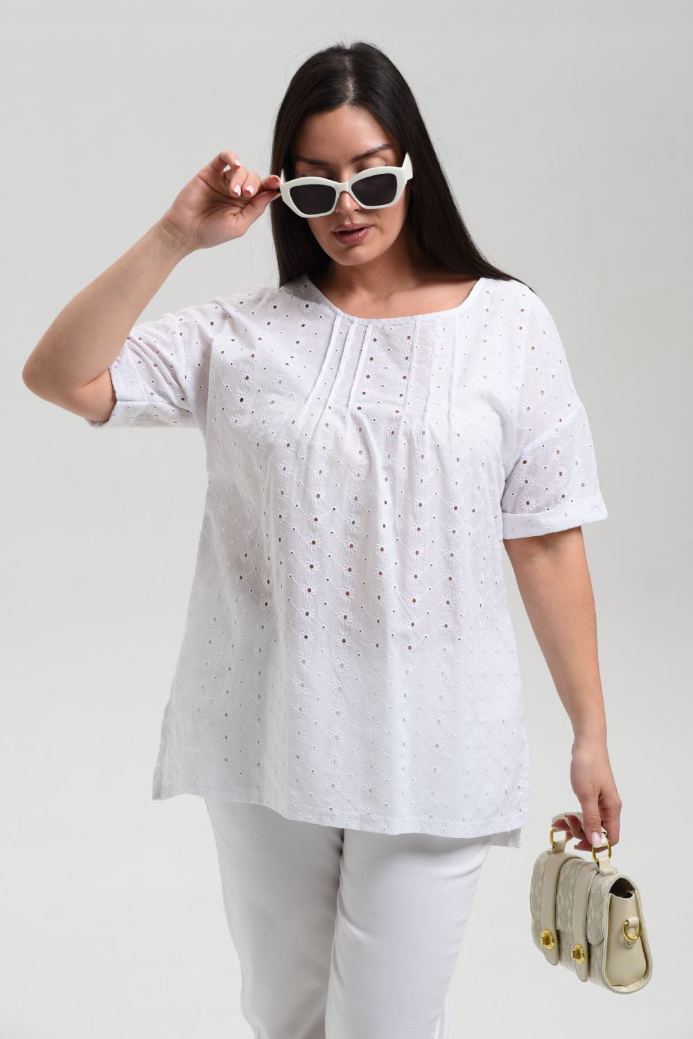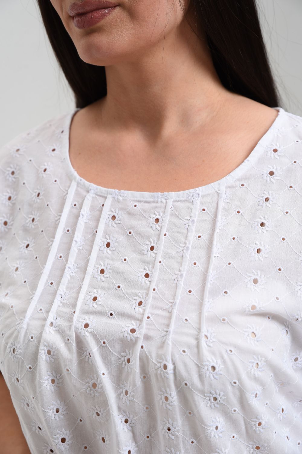 Туника прямая, свободная, с округлой горловиной, с удлиненной спинкой. Рукав короткий, с манжетом. В верхней части полочки обработаны декоративные защипы. Спинка с кокеткой. В нижней части боковых швов расположены разрезы. Горловина обработана бейкой из основного полотна.