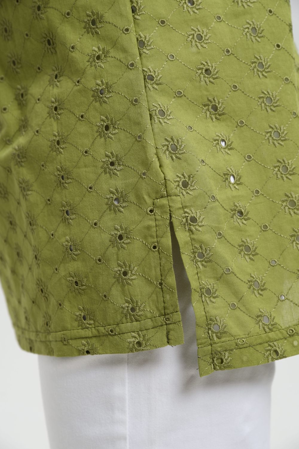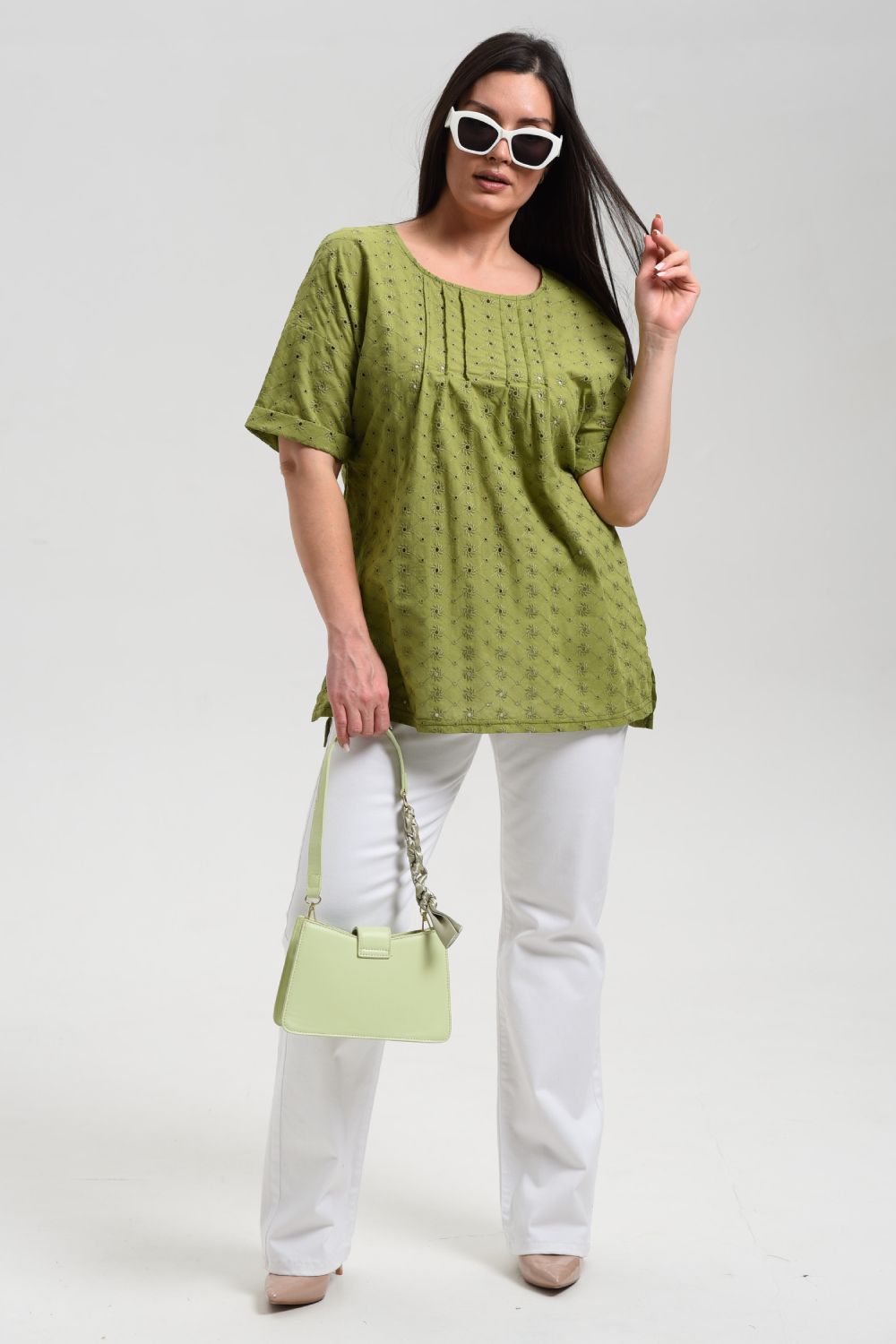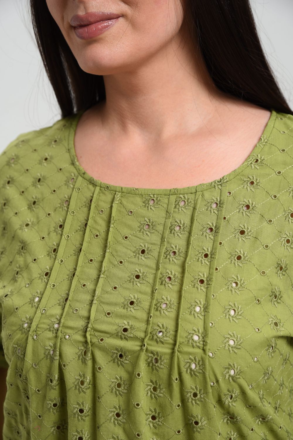 Туника прямая, свободная, с округлой горловиной, с удлиненной спинкой. Рукав короткий, с манжетом. В верхней части полочки обработаны декоративные защипы. Спинка с кокеткой. В нижней части боковых швов расположены разрезы. Горловина обработана бейкой из основного полотна.