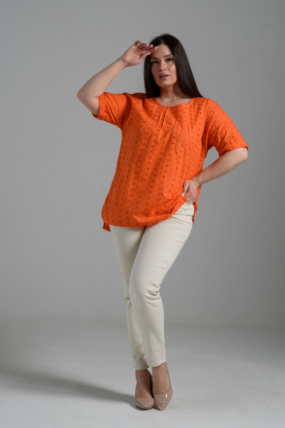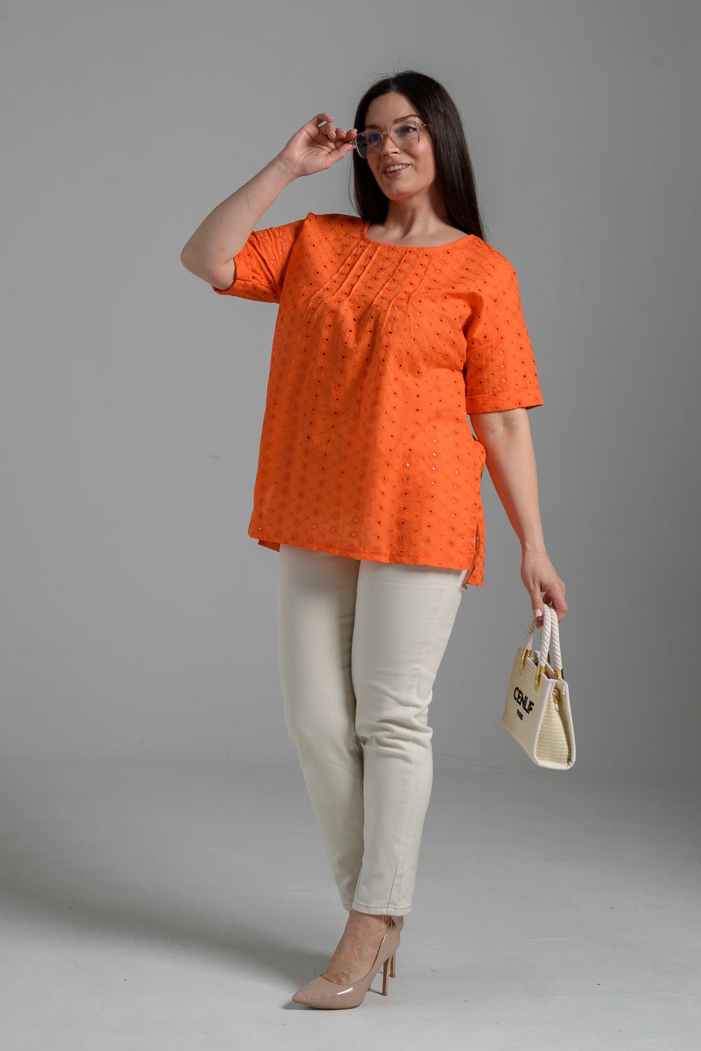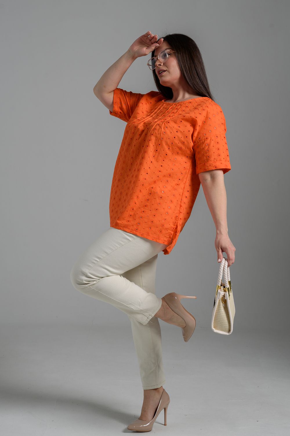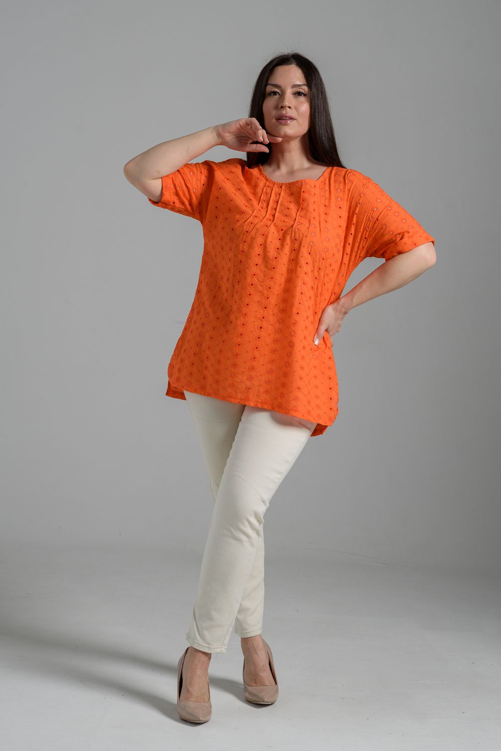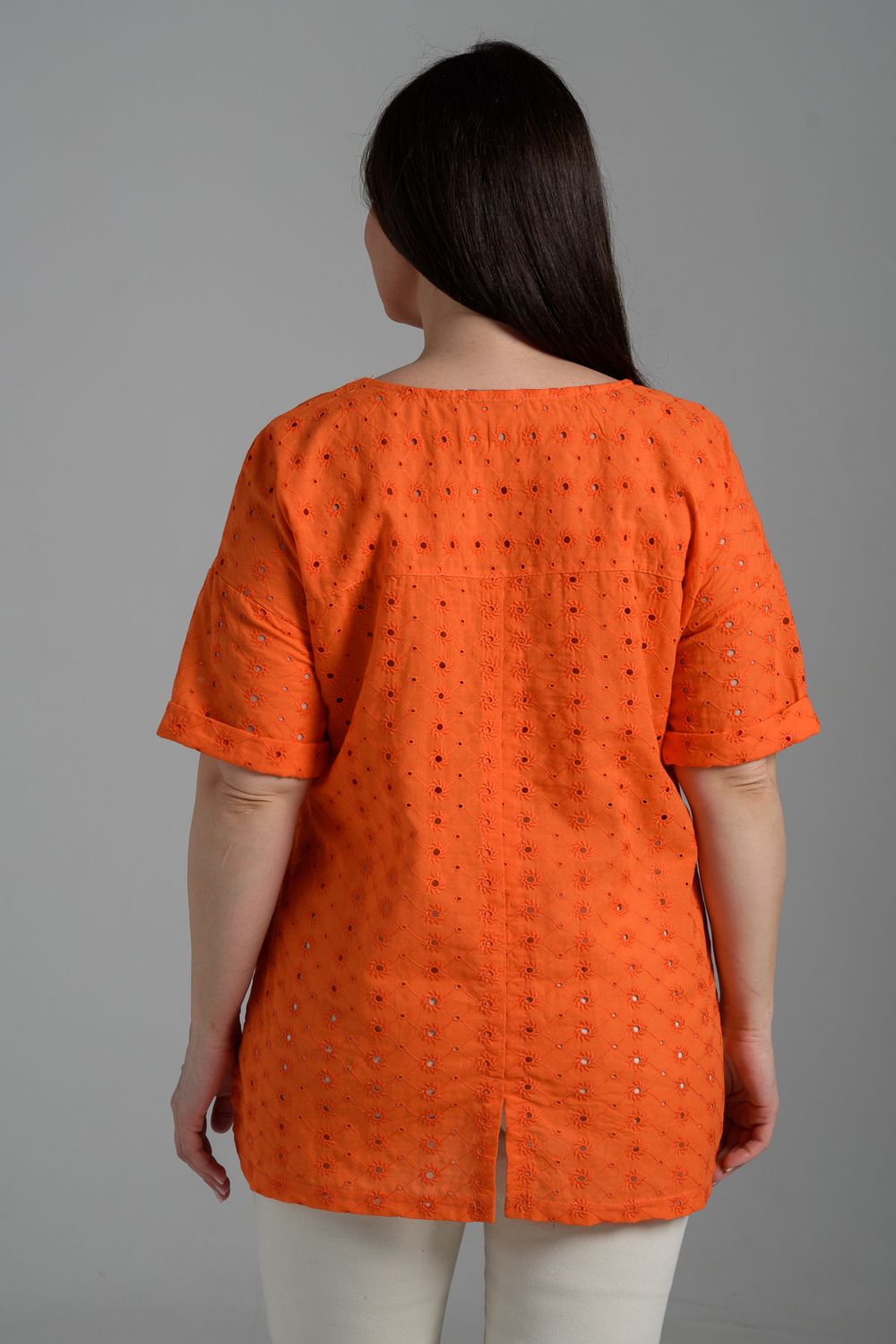 Туника прямая, свободная, с округлой горловиной, с удлиненной спинкой. Рукав короткий, с манжетом. В верхней части полочки обработаны декоративные защипы. Спинка с кокеткой. В нижней части боковых швов расположены разрезы. Горловина обработана бейкой из основного полотна.