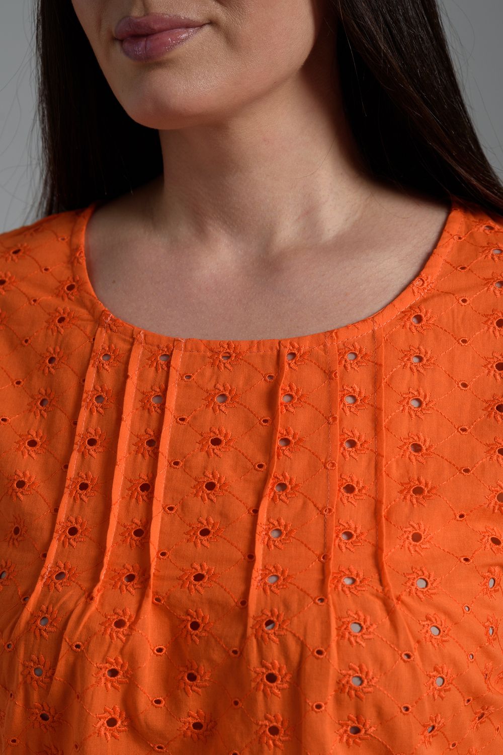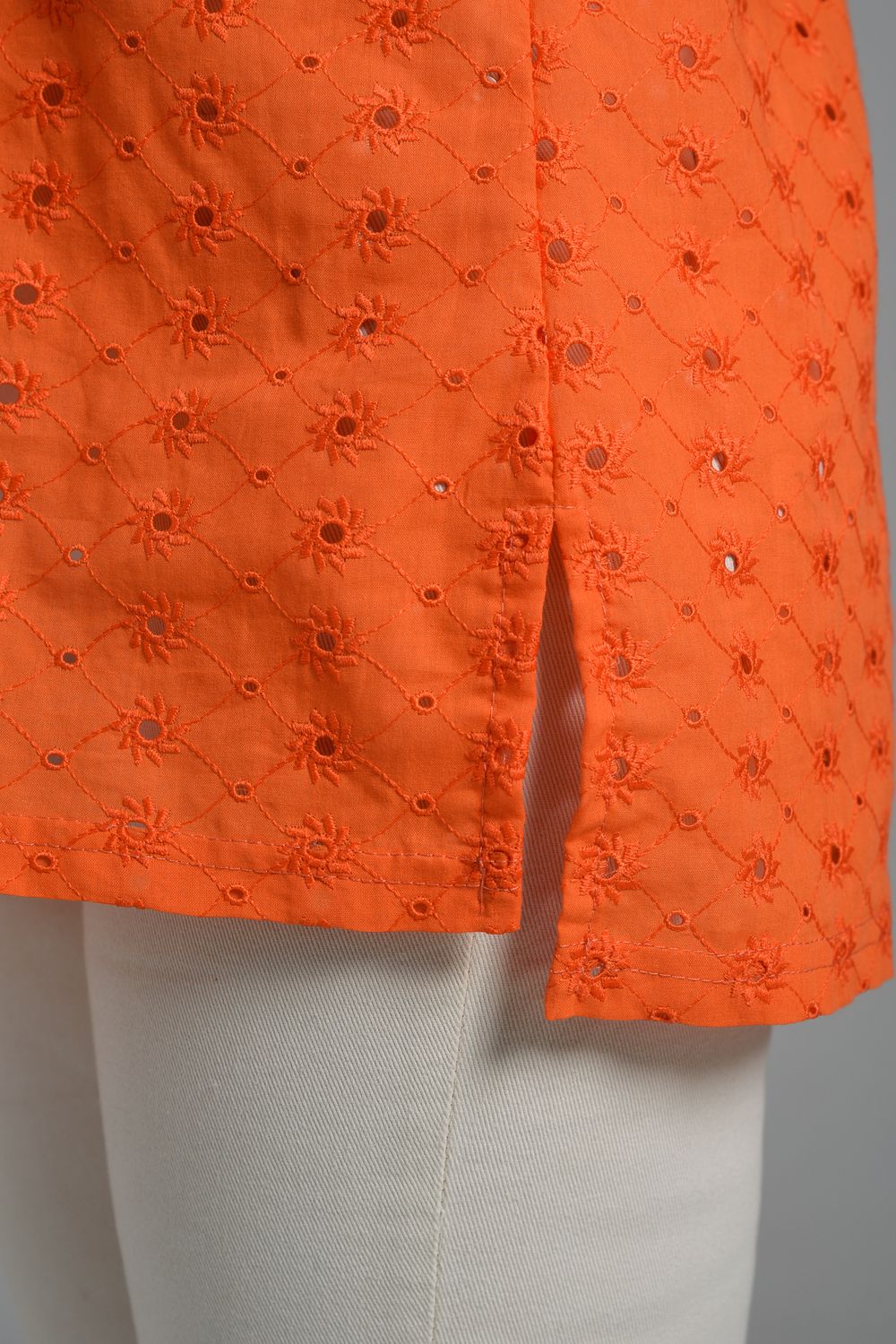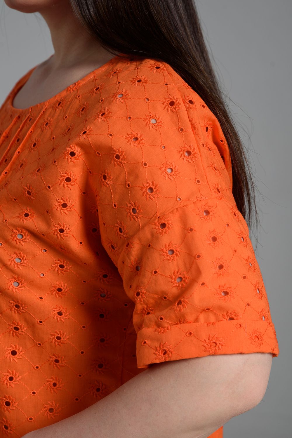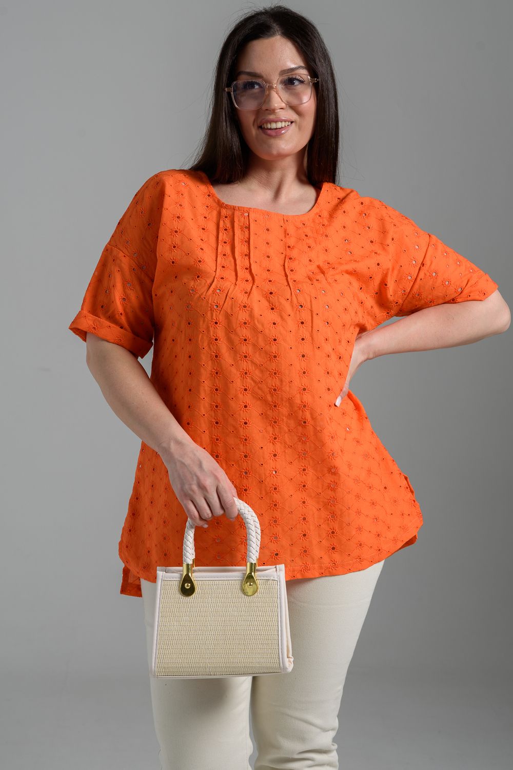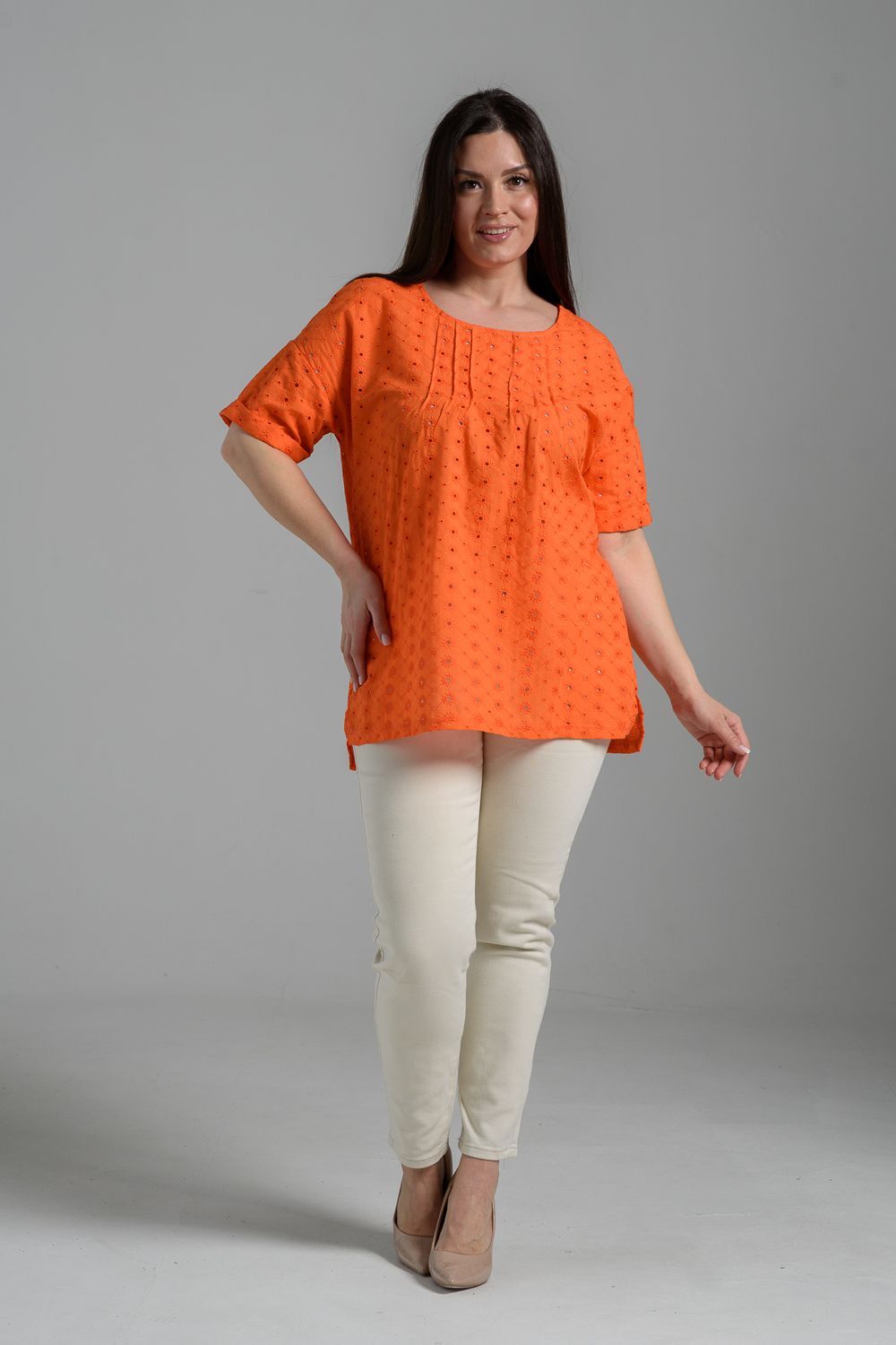 Туника прямая, свободная, с округлой горловиной, с удлиненной спинкой. Рукав короткий, с манжетом. В верхней части полочки обработаны декоративные защипы. Спинка с кокеткой. В нижней части боковых швов расположены разрезы. Горловина обработана бейкой из основного полотна.