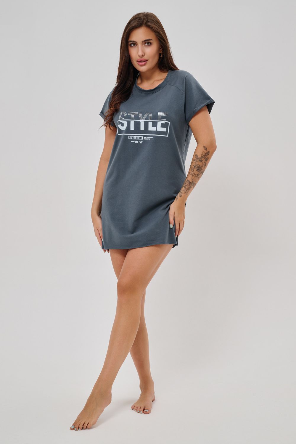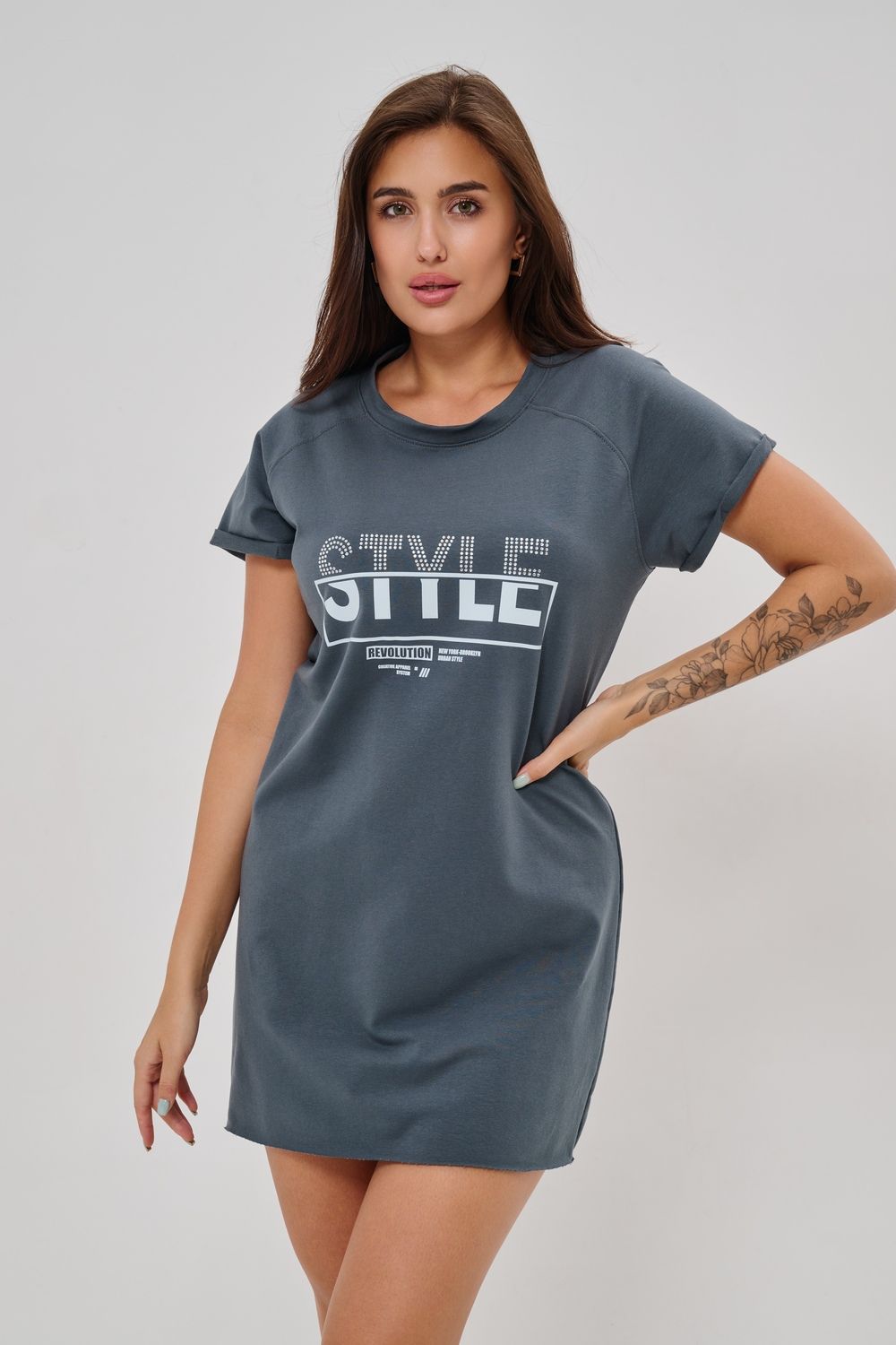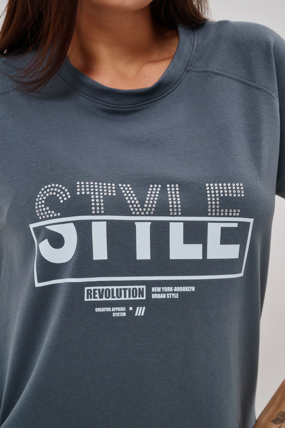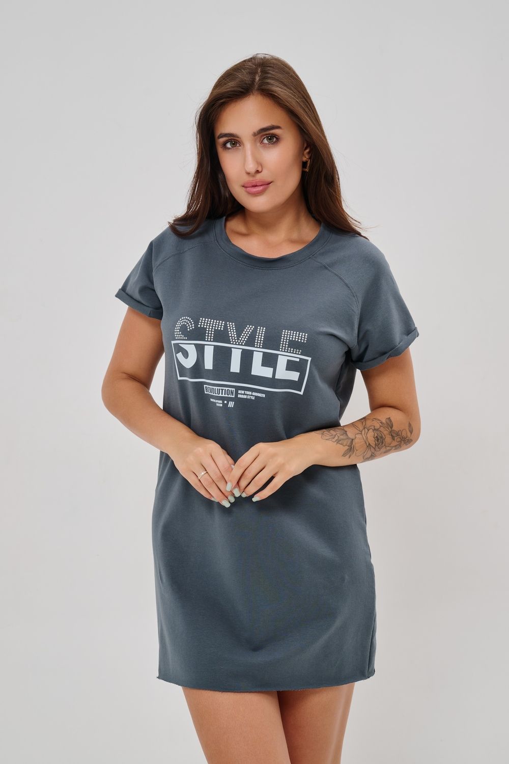 Женская туника-футболка выполнена в лаконичном стиле с прямыми линиями кроя. Ее отличает удобный фасон, подчеркивающий женственность фигуры. Модель оснащена круглым вырезом горловины и короткими рукавами типа реглан, обеспечивающими свободу движений и комфорт. Особенностью изделия является оригинальная отделка — низ туники оставлен с необработанными краями, создавая эффект легкой небрежности и современности. Центральное внимание привлекает стильный принт на груди с выразительной надписью "STYLE", украшенный сверкающими стразами, придающий образу дополнительную яркость и шарм.
