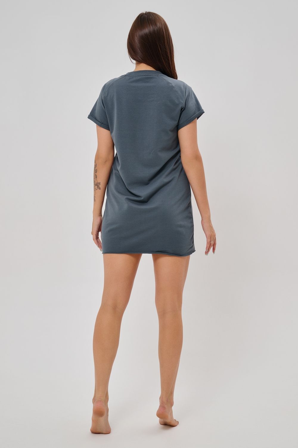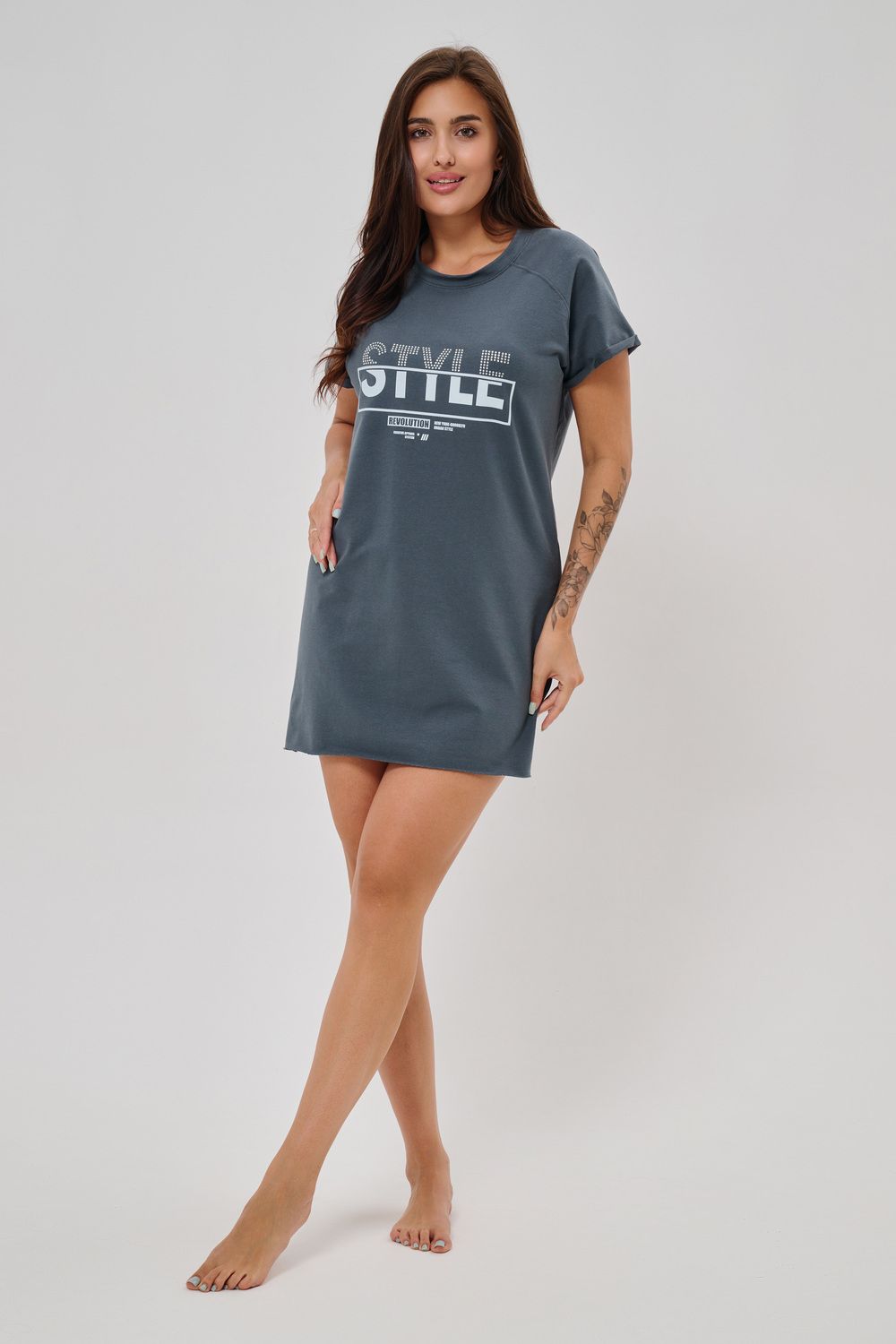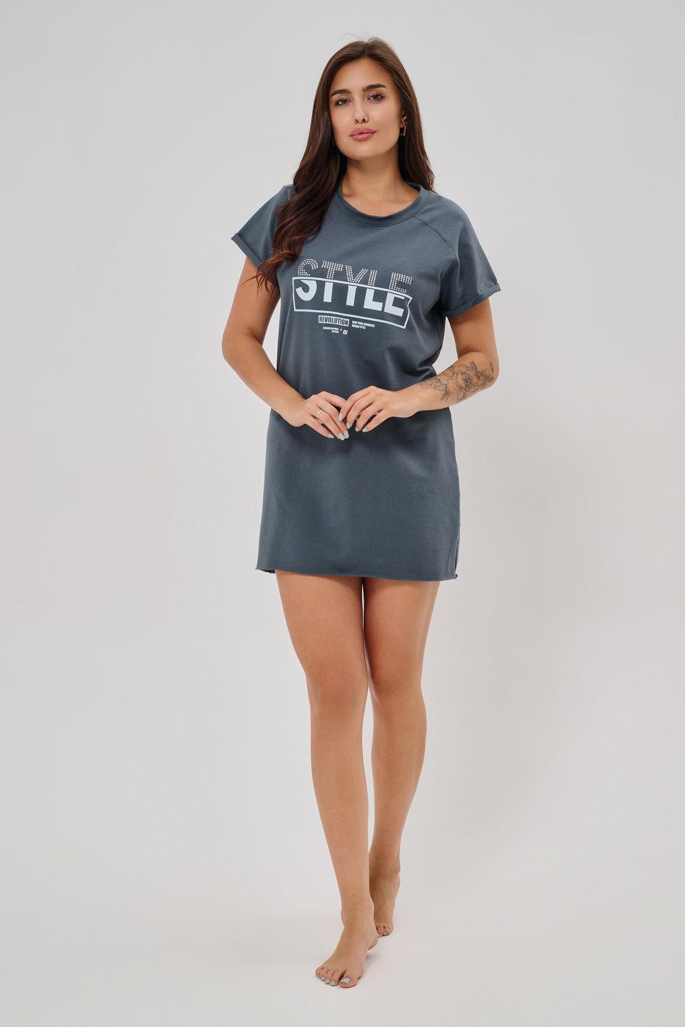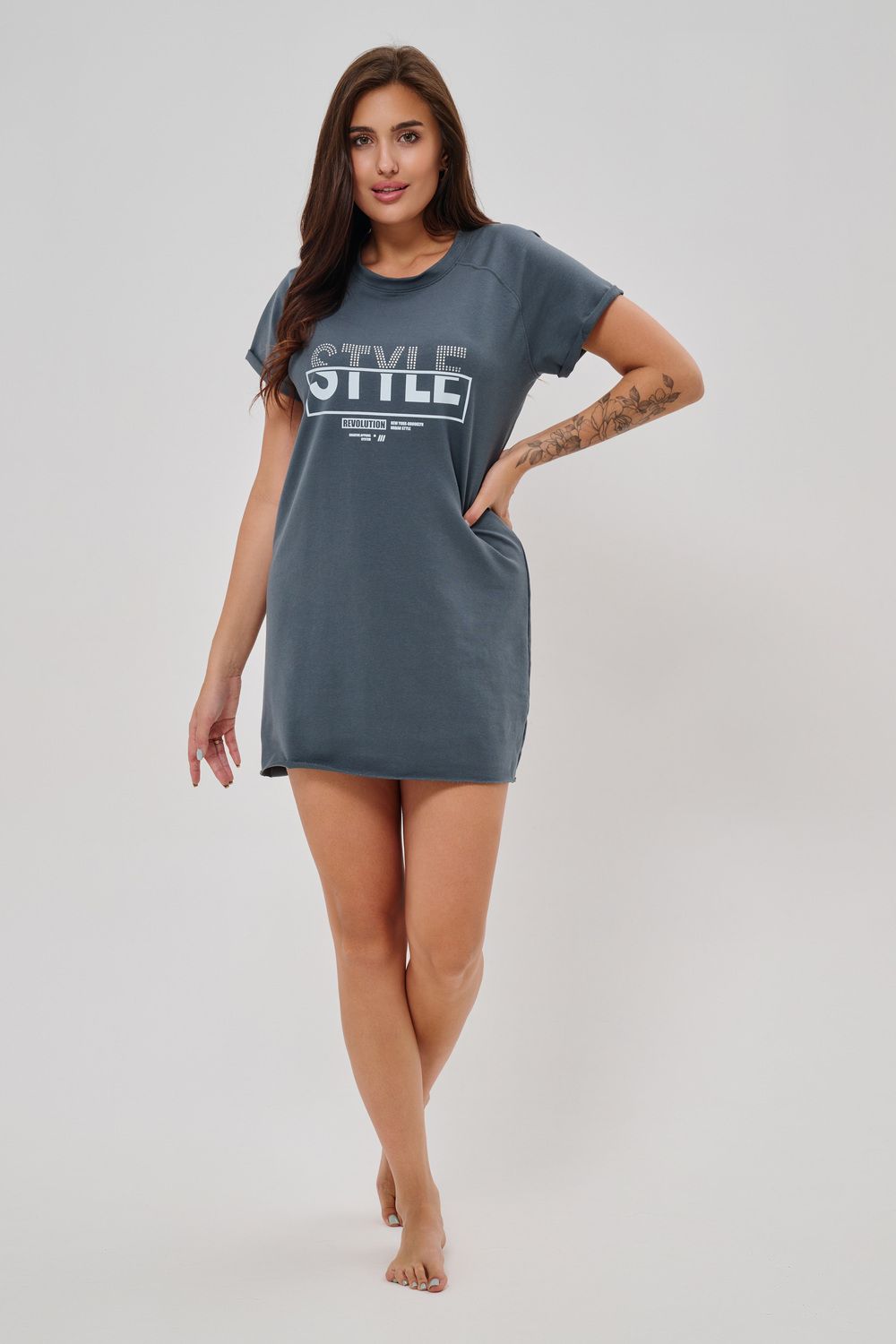 Женская туника-футболка выполнена в лаконичном стиле с прямыми линиями кроя. Ее отличает удобный фасон, подчеркивающий женственность фигуры. Модель оснащена круглым вырезом горловины и короткими рукавами типа реглан, обеспечивающими свободу движений и комфорт. Особенностью изделия является оригинальная отделка — низ туники оставлен с необработанными краями, создавая эффект легкой небрежности и современности. Центральное внимание привлекает стильный принт на груди с выразительной надписью "STYLE", украшенный сверкающими стразами, придающий образу дополнительную яркость и шарм.