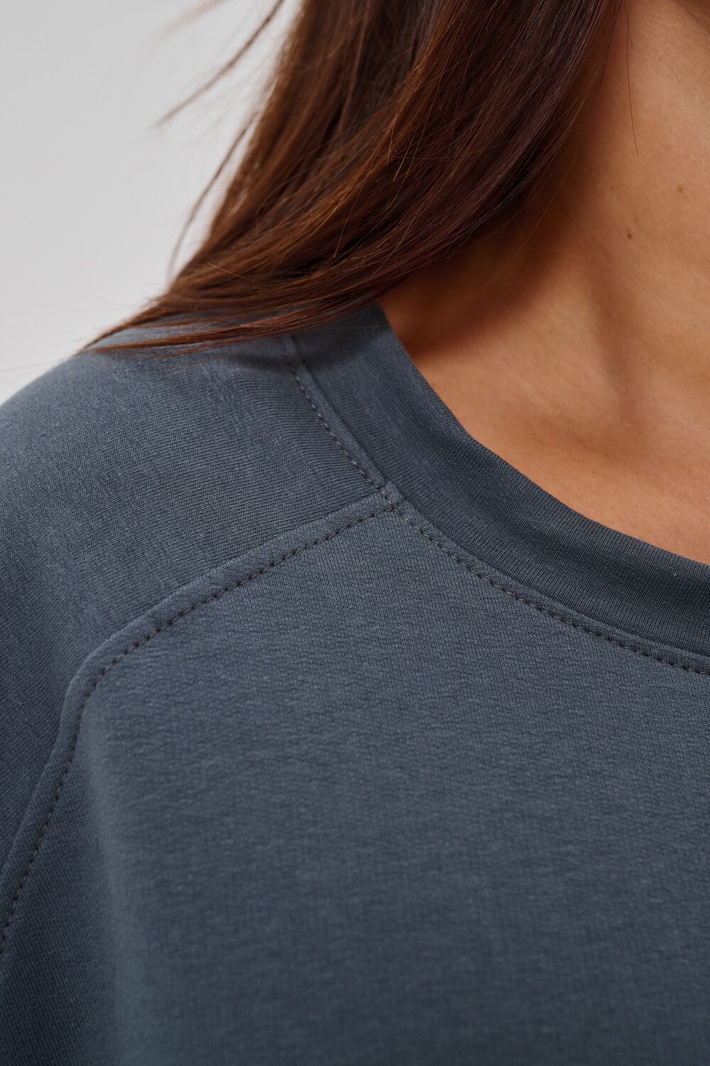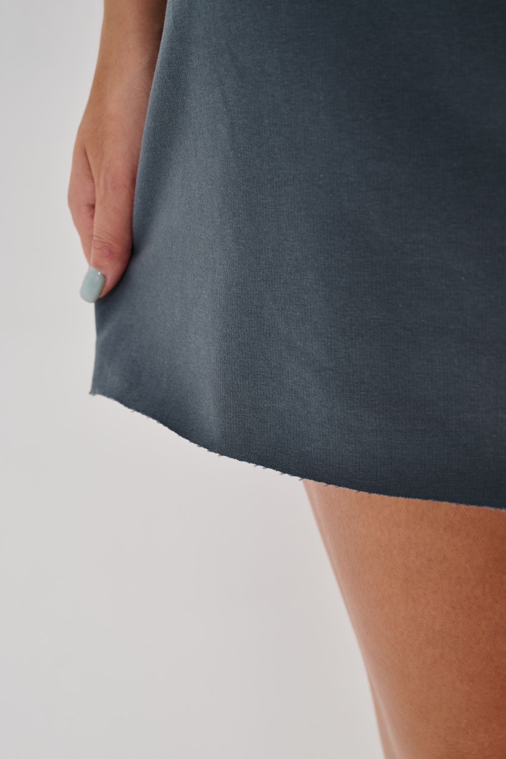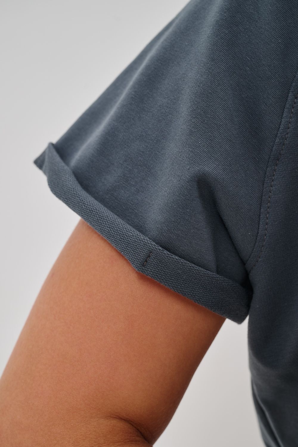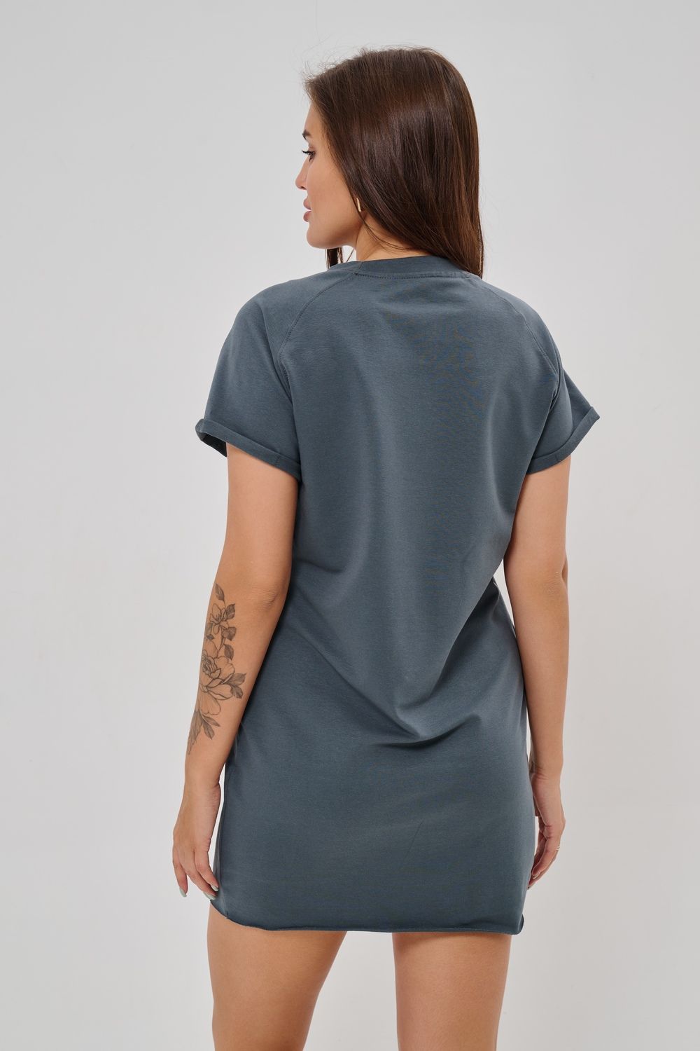 Женская туника-футболка выполнена в лаконичном стиле с прямыми линиями кроя. Ее отличает удобный фасон, подчеркивающий женственность фигуры. Модель оснащена круглым вырезом горловины и короткими рукавами типа реглан, обеспечивающими свободу движений и комфорт. Особенностью изделия является оригинальная отделка — низ туники оставлен с необработанными краями, создавая эффект легкой небрежности и современности. Центральное внимание привлекает стильный принт на груди с выразительной надписью "STYLE", украшенный сверкающими стразами, придающий образу дополнительную яркость и шарм.