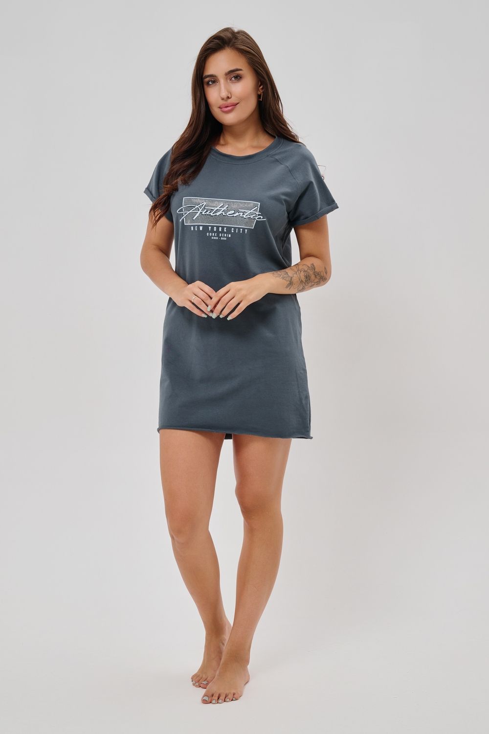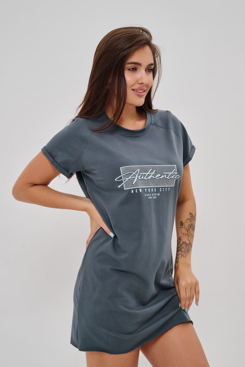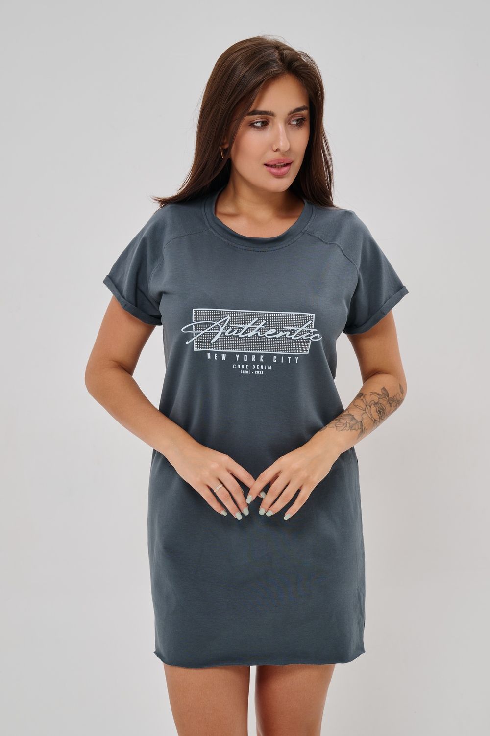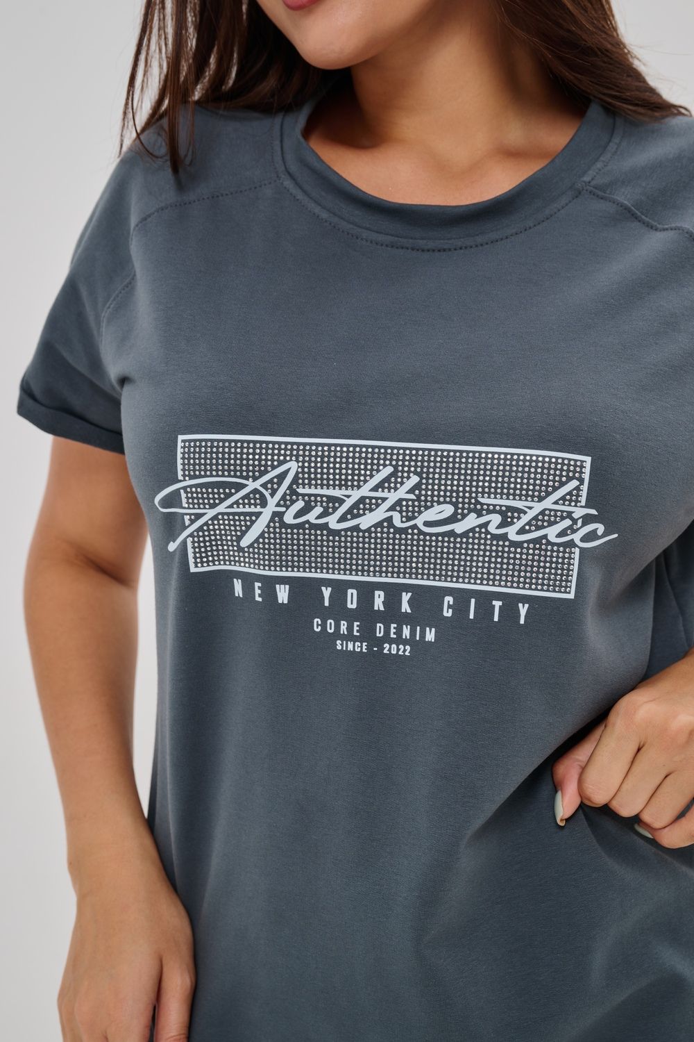 Женская туника-футболка выполнена в лаконичном стиле с прямыми линиями кроя. Ее отличает удобный фасон, подчеркивающий женственность фигуры. Модель оснащена круглым вырезом горловины и короткими рукавами типа реглан, обеспечивающими свободу движений и комфорт. Особенностью изделия является оригинальная отделка — низ туники оставлен с необработанными краями, создавая эффект легкой небрежности и современности. Центральное внимание привлекает стильный принт на груди с надписью, украшенный сверкающими стразами, придающий образу дополнительную яркость и шарм.