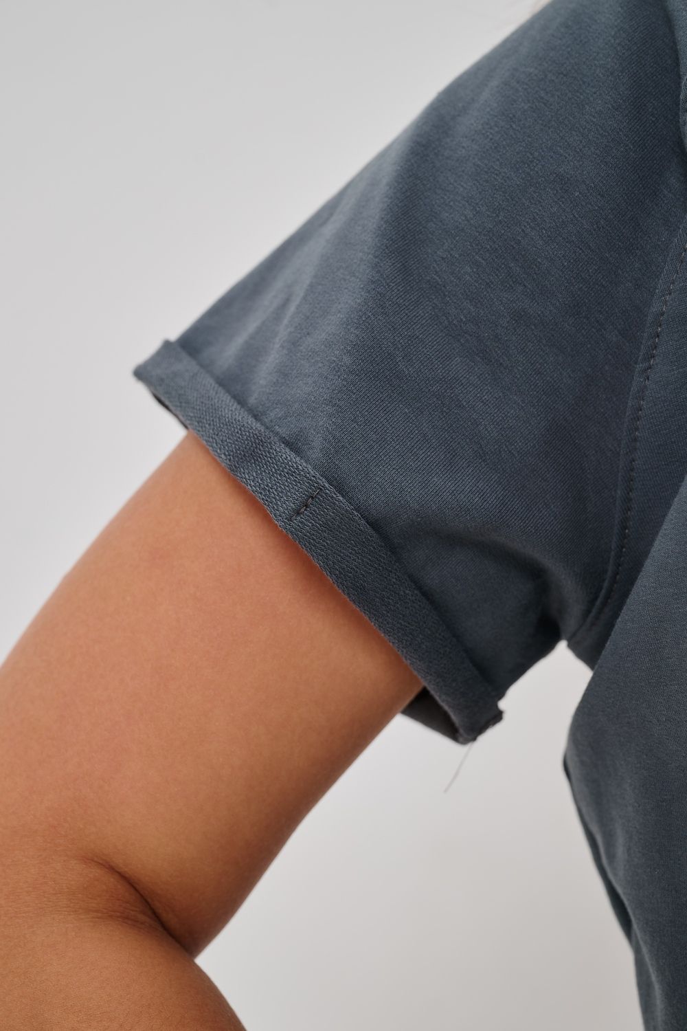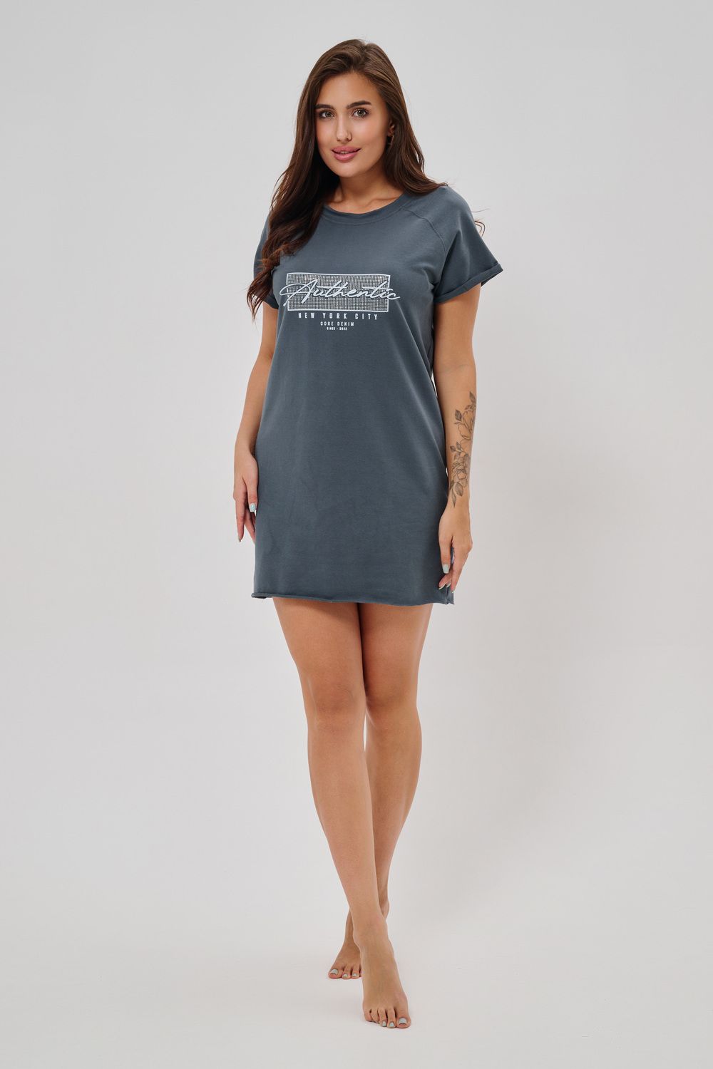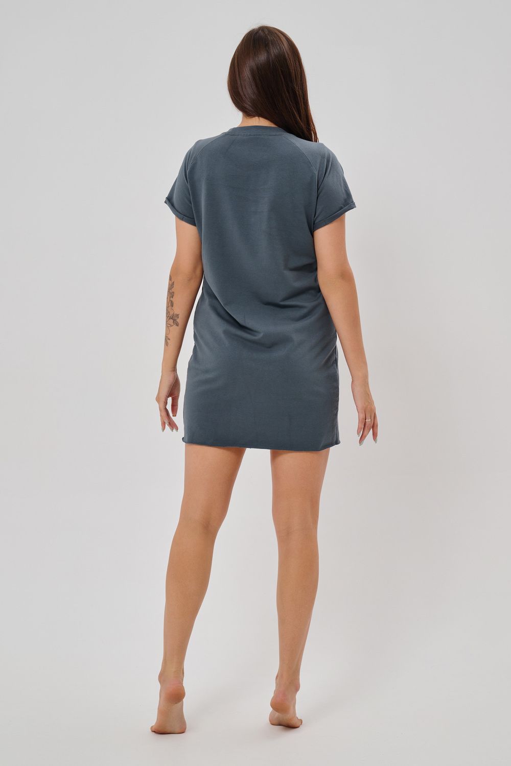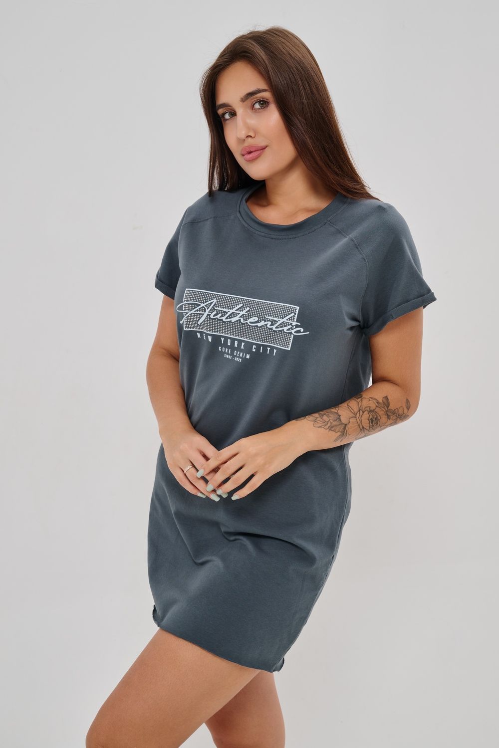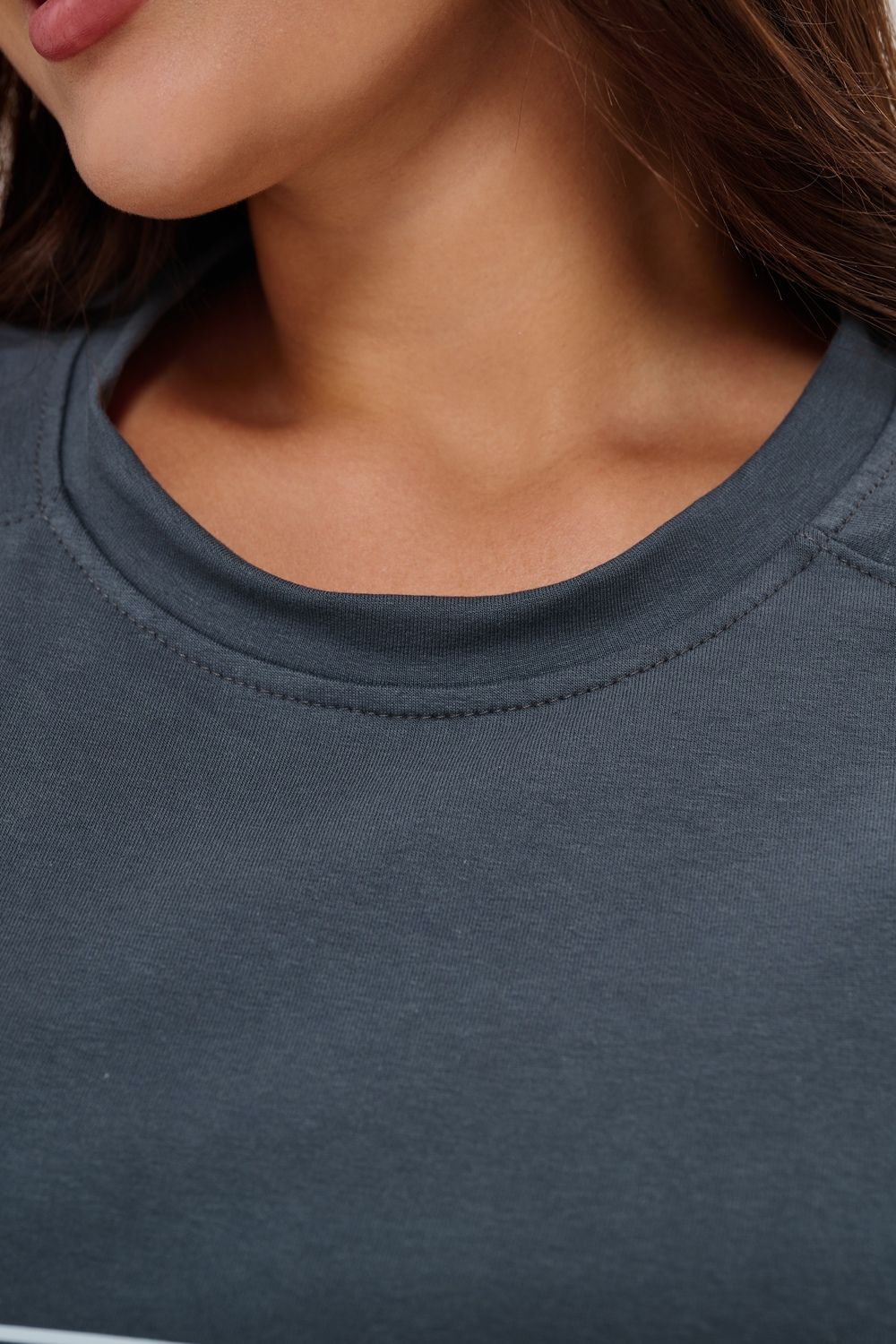 Женская туника-футболка выполнена в лаконичном стиле с прямыми линиями кроя. Ее отличает удобный фасон, подчеркивающий женственность фигуры. Модель оснащена круглым вырезом горловины и короткими рукавами типа реглан, обеспечивающими свободу движений и комфорт. Особенностью изделия является оригинальная отделка — низ туники оставлен с необработанными краями, создавая эффект легкой небрежности и современности. Центральное внимание привлекает стильный принт на груди с надписью, украшенный сверкающими стразами, придающий образу дополнительную яркость и шарм.