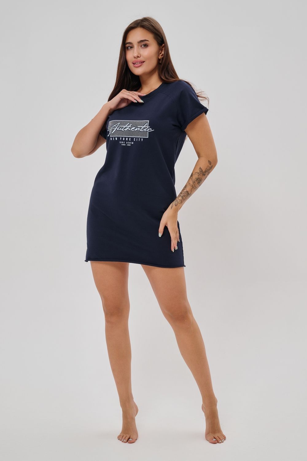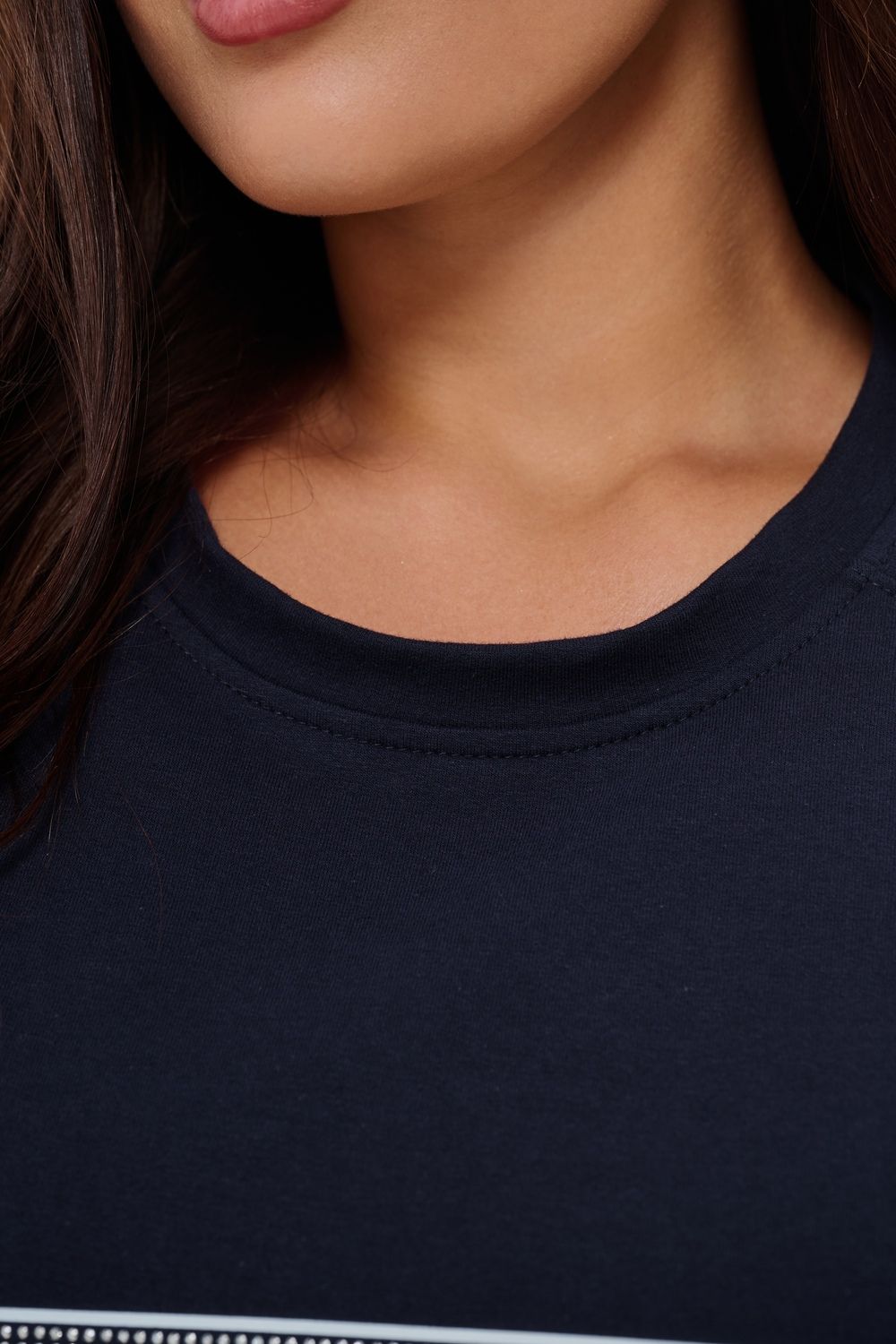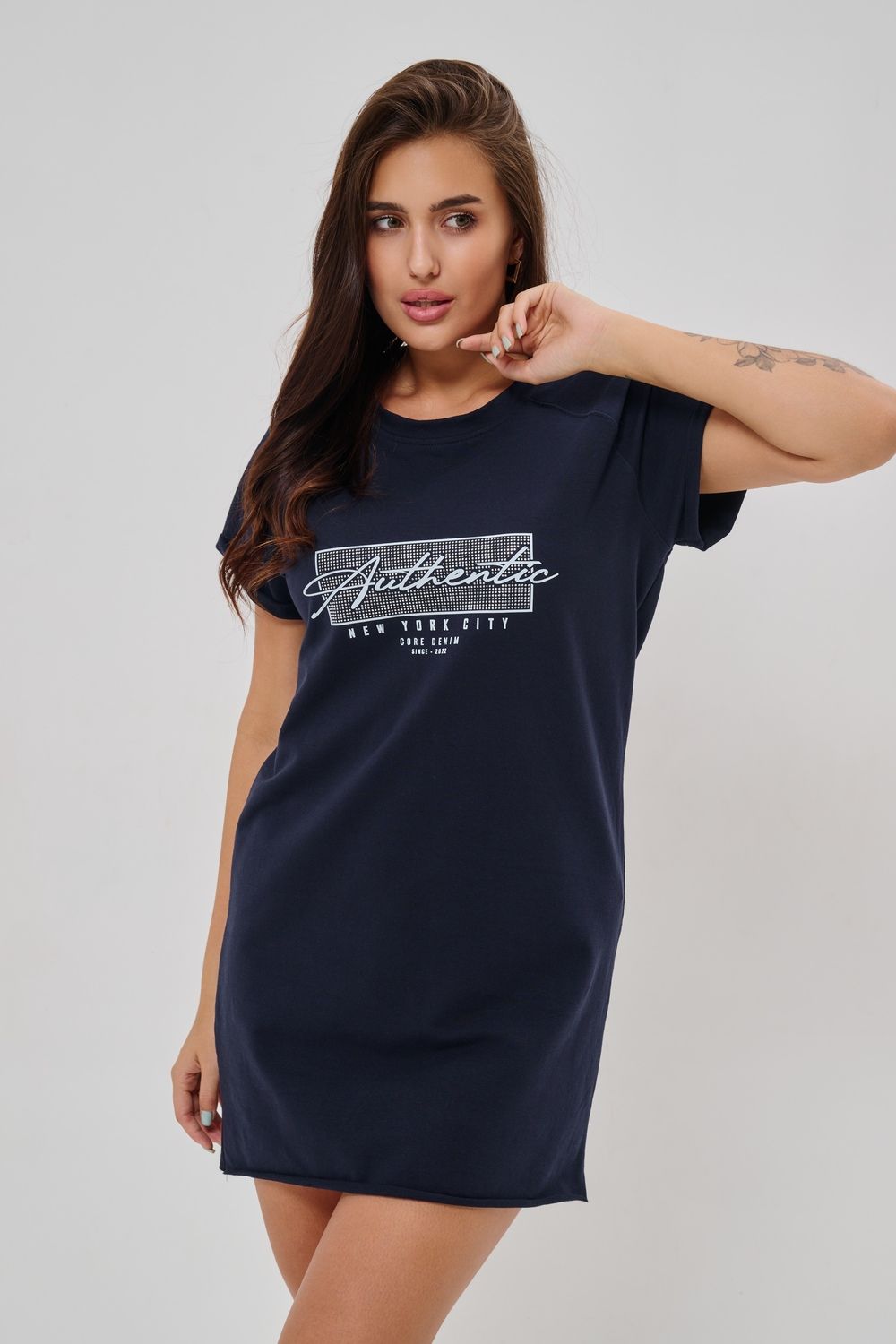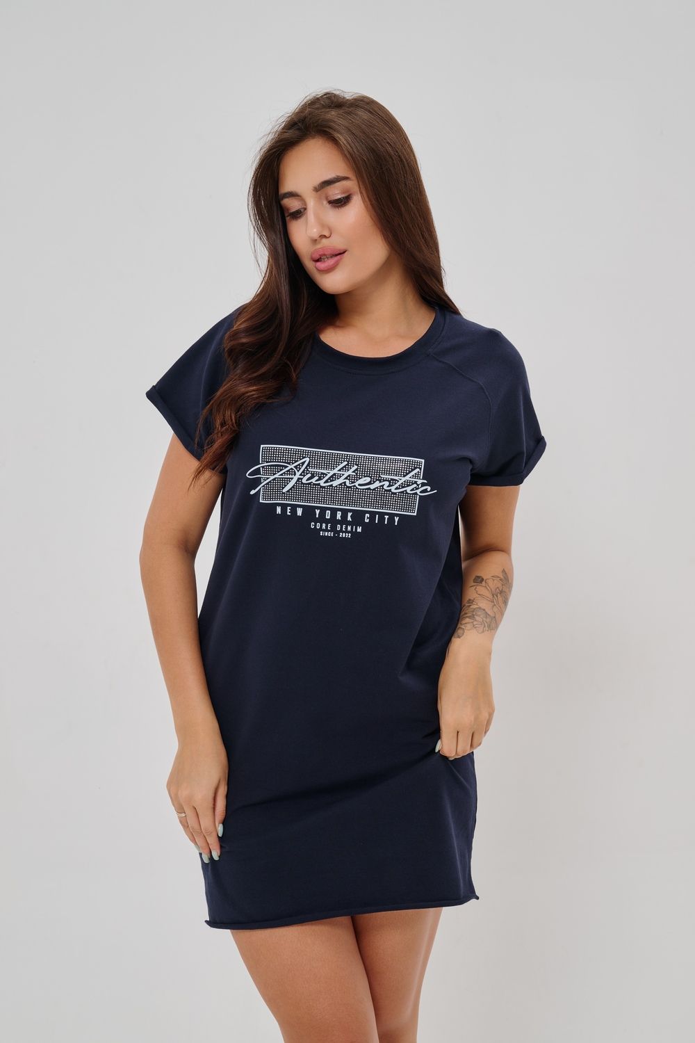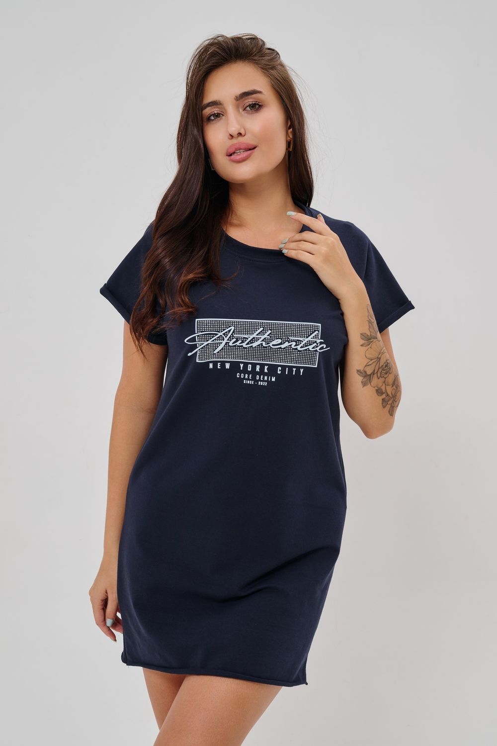 Женская туника-футболка выполнена в лаконичном стиле с прямыми линиями кроя. Ее отличает удобный фасон, подчеркивающий женственность фигуры. Модель оснащена круглым вырезом горловины и короткими рукавами типа реглан, обеспечивающими свободу движений и комфорт. Особенностью изделия является оригинальная отделка — низ туники оставлен с необработанными краями, создавая эффект легкой небрежности и современности. Центральное внимание привлекает стильный принт на груди с надписью, украшенный сверкающими стразами, придающий образу дополнительную яркость и шарм.