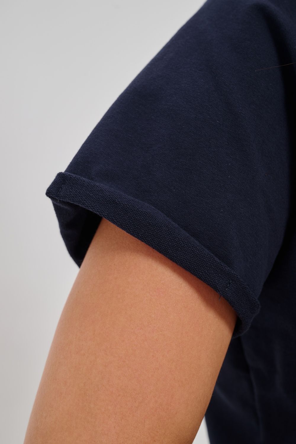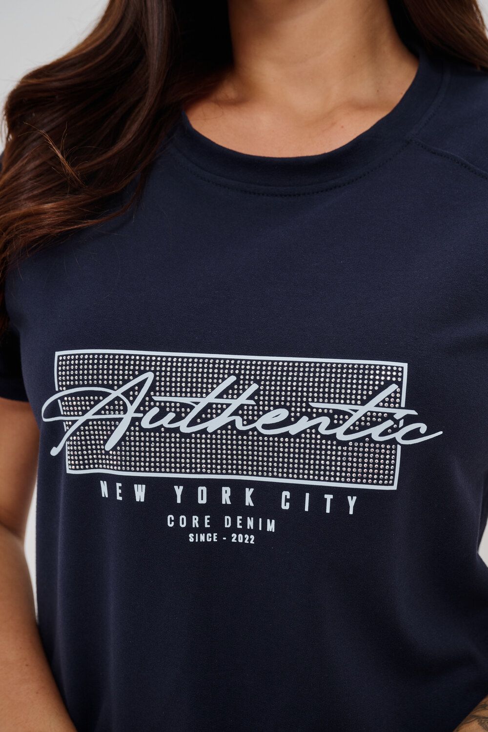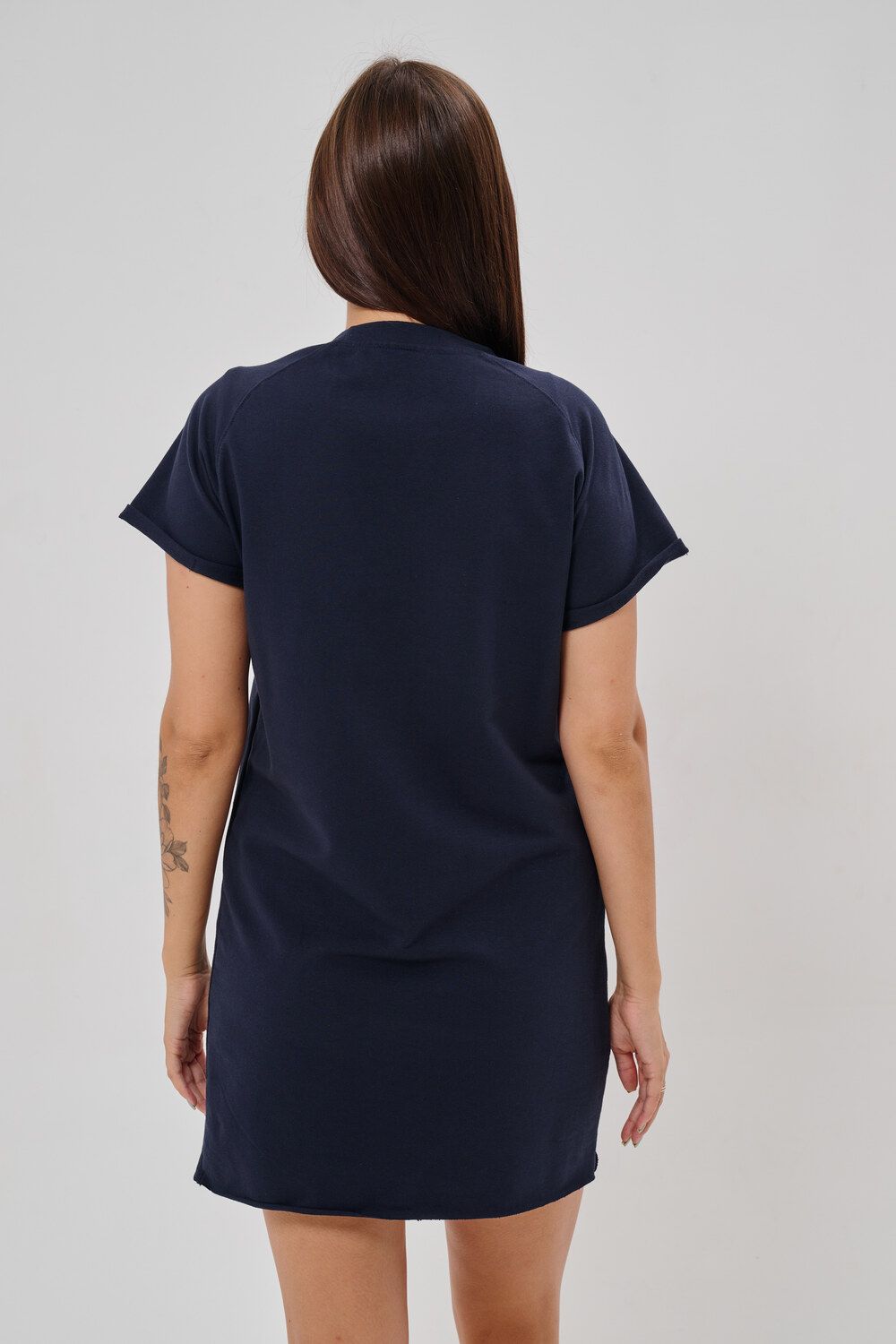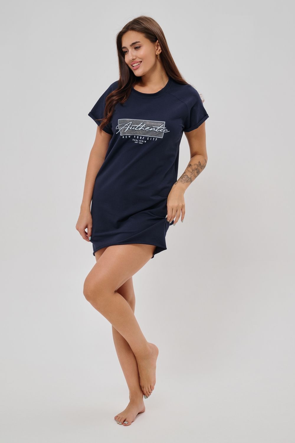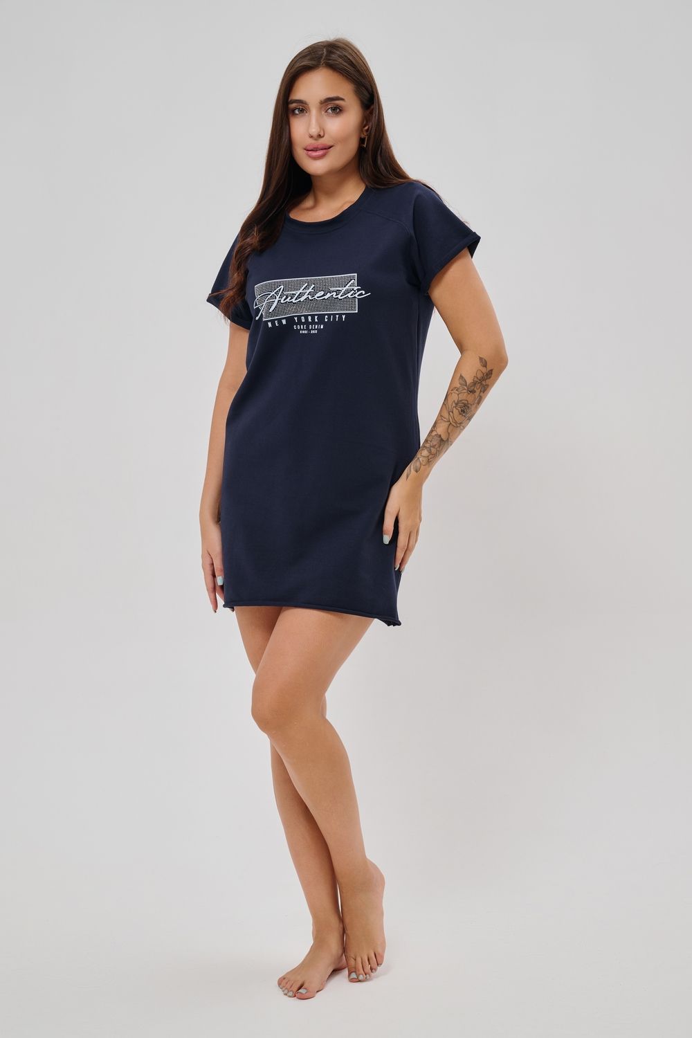 Женская туника-футболка выполнена в лаконичном стиле с прямыми линиями кроя. Ее отличает удобный фасон, подчеркивающий женственность фигуры. Модель оснащена круглым вырезом горловины и короткими рукавами типа реглан, обеспечивающими свободу движений и комфорт. Особенностью изделия является оригинальная отделка — низ туники оставлен с необработанными краями, создавая эффект легкой небрежности и современности. Центральное внимание привлекает стильный принт на груди с надписью, украшенный сверкающими стразами, придающий образу дополнительную яркость и шарм.