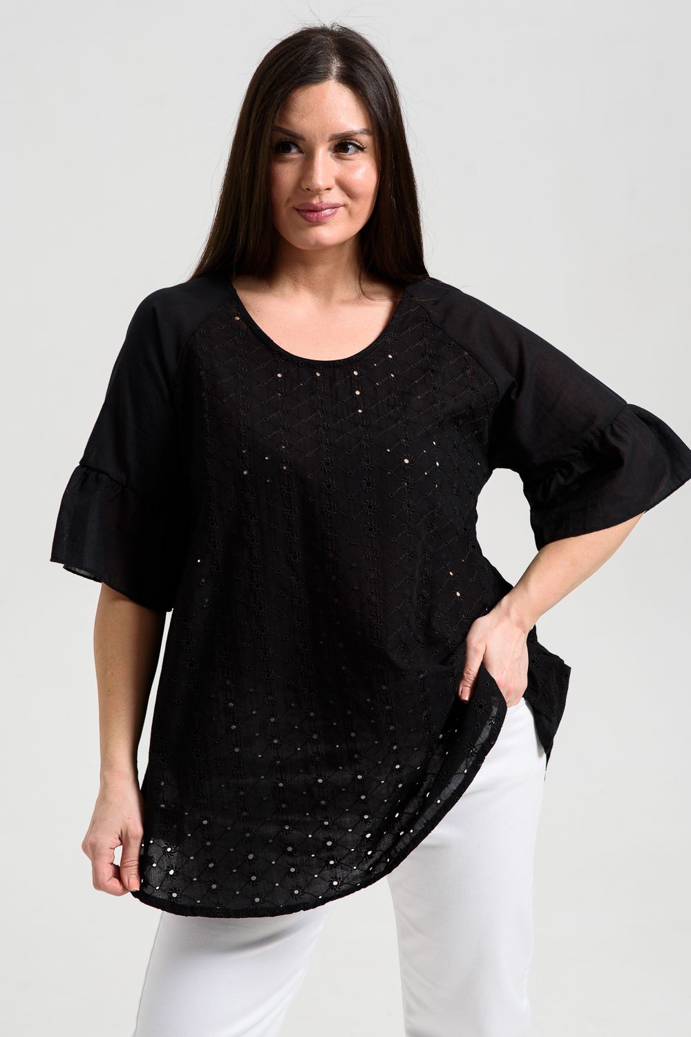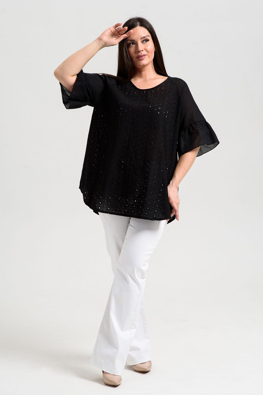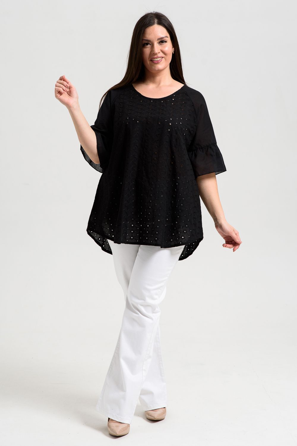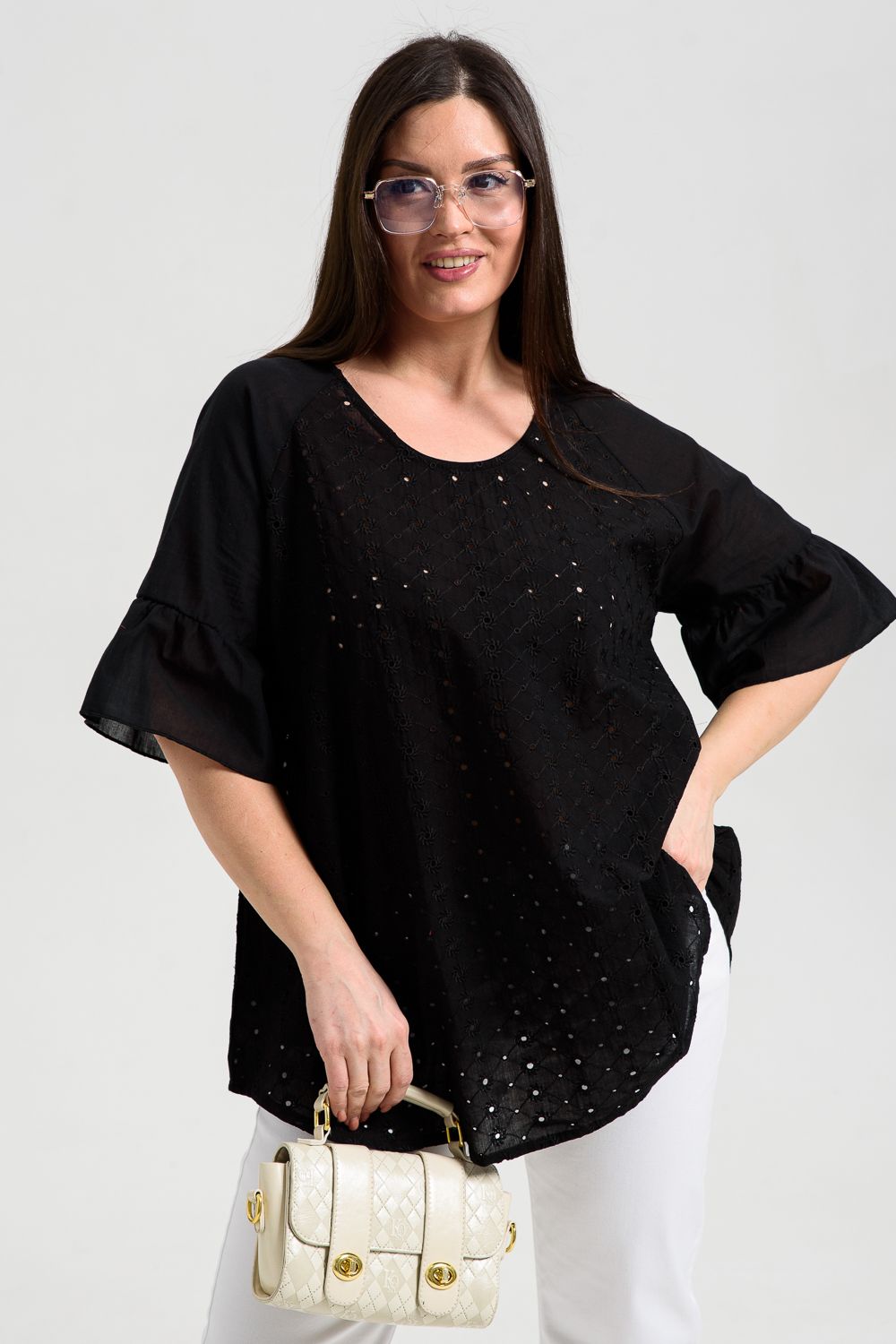Туника женская, расширенная к низу. Горловина округлая. Рукав реглан, внизу рукава широкая рюша. Низ туники фигурный, в боковых швах внутренние карманы. Свободная, легкая, не стесняющая движений туника незаменима для летнего гардероба любой женщины.