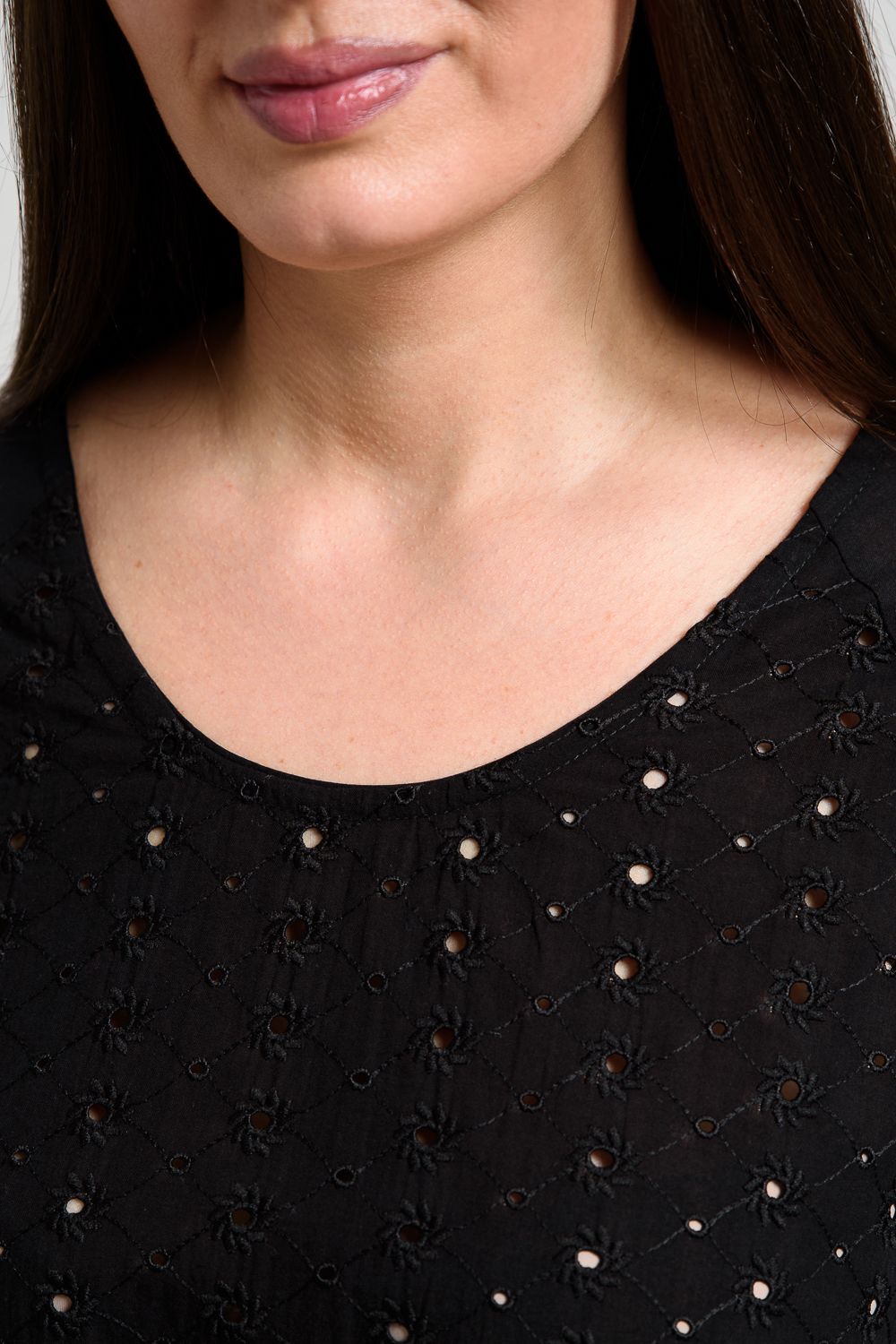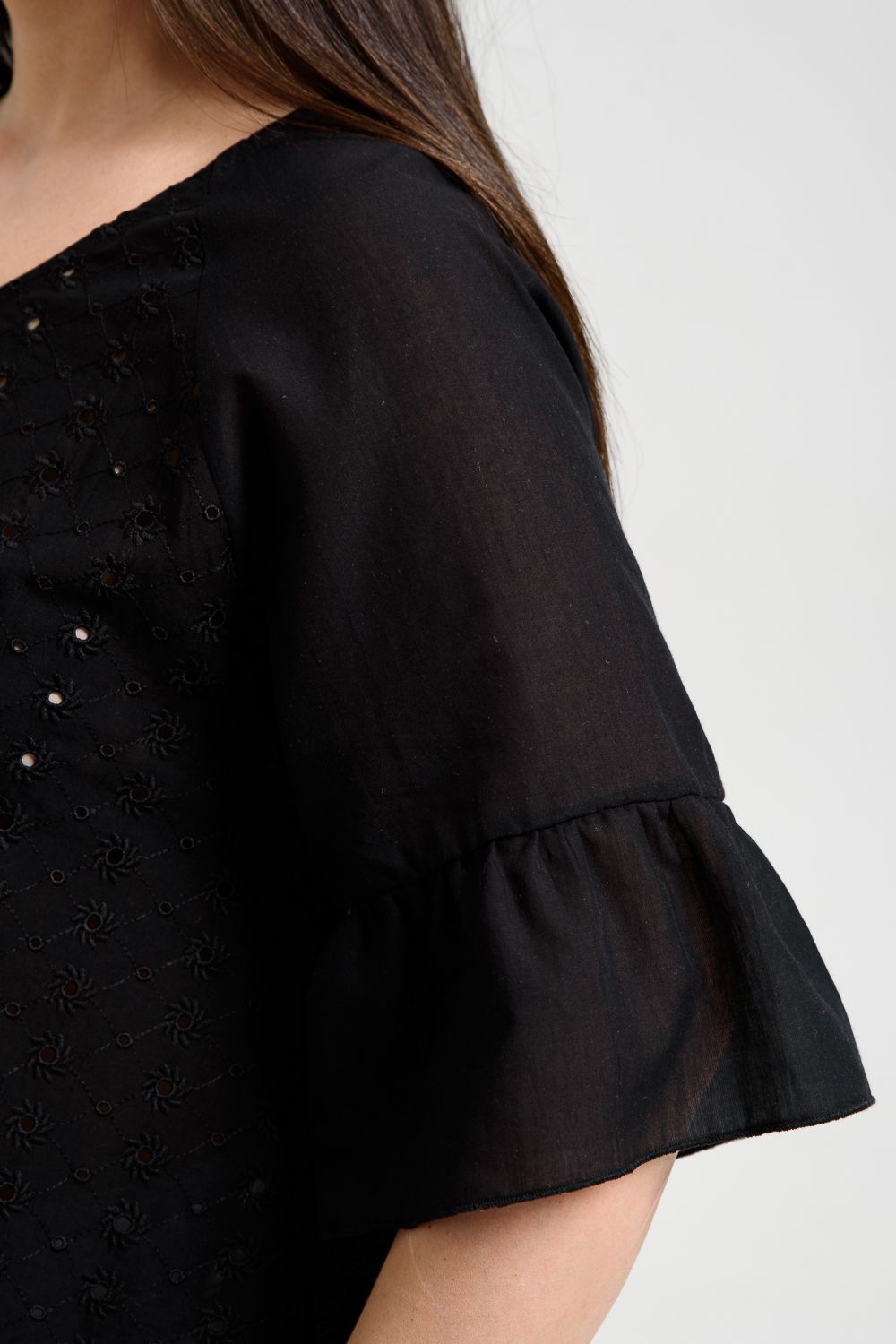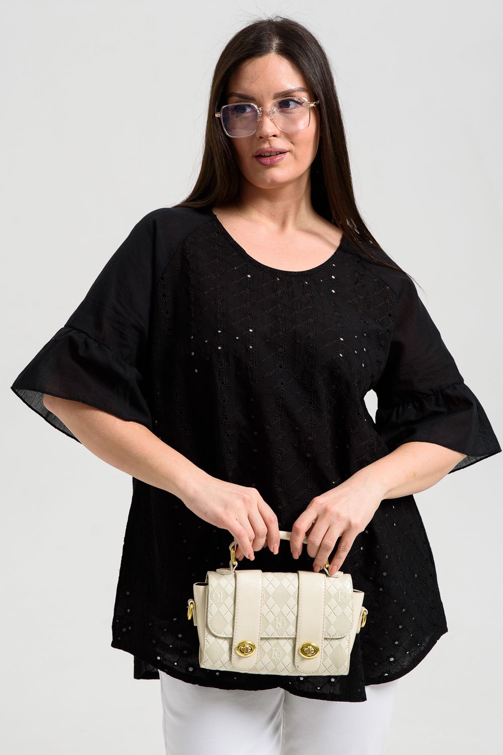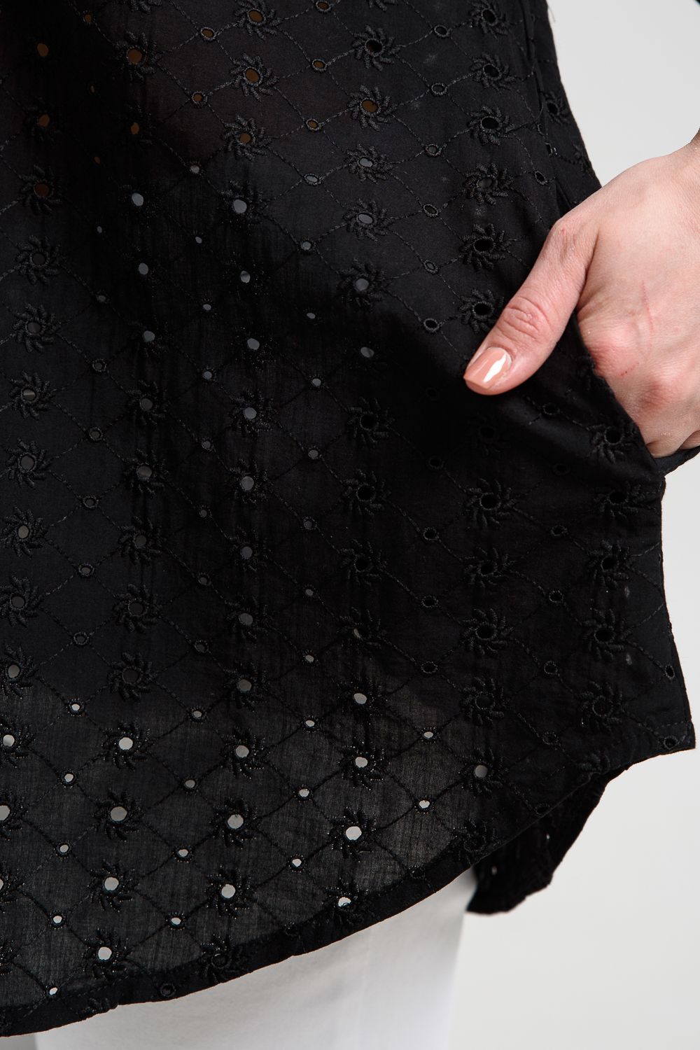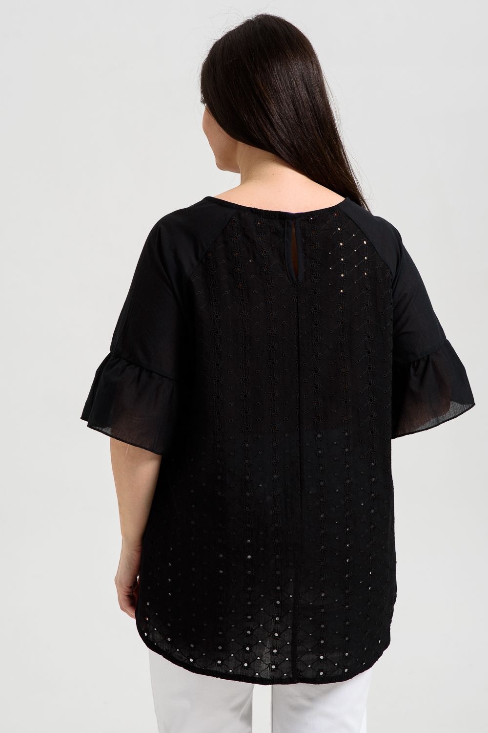 Туника женская, расширенная к низу. Горловина округлая. Рукав реглан, внизу рукава широкая рюша. Низ туники фигурный, в боковых швах внутренние карманы. Свободная, легкая, не стесняющая движений туника незаменима для летнего гардероба любой женщины.