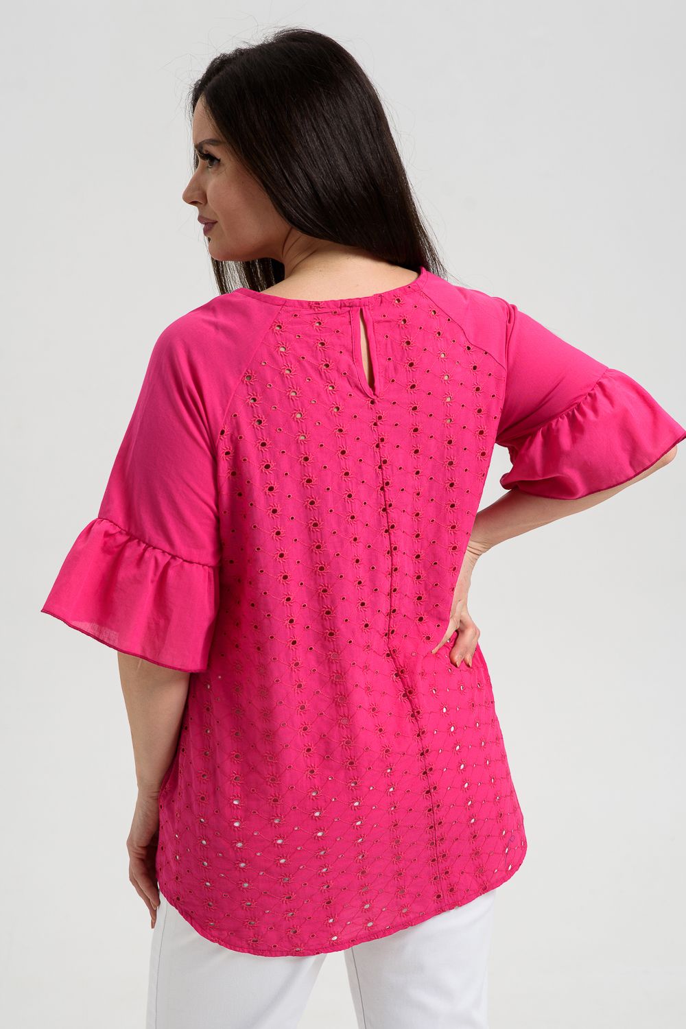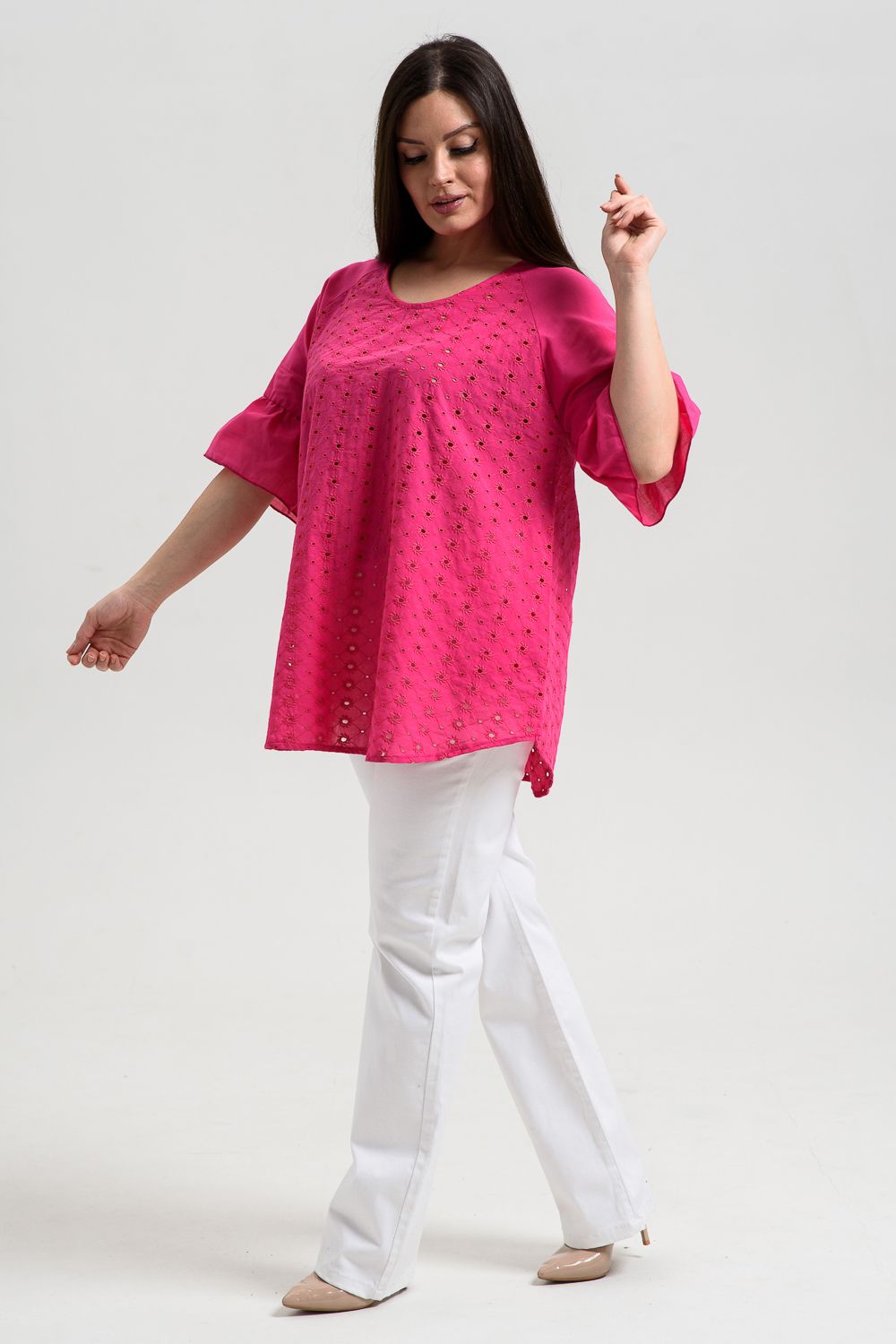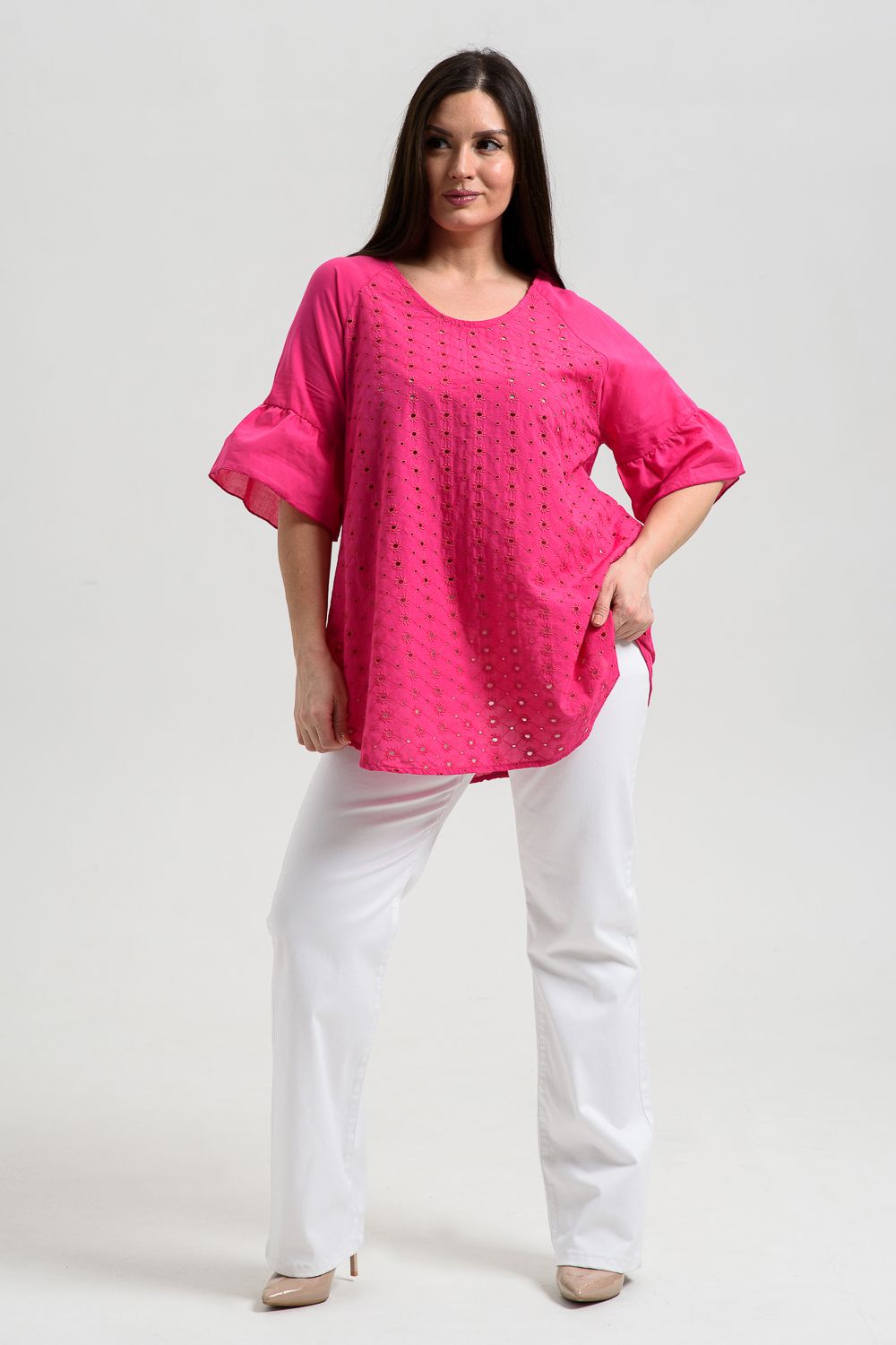Туника женская, расширенная к низу. Горловина округлая. Рукав реглан, внизу рукава широкая рюша. Низ туники фигурный, в боковых швах внутренние карманы. Свободная, легкая, не стесняющая движений туника незаменима для летнего гардероба любой женщины.