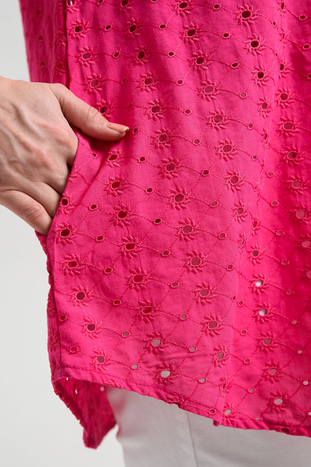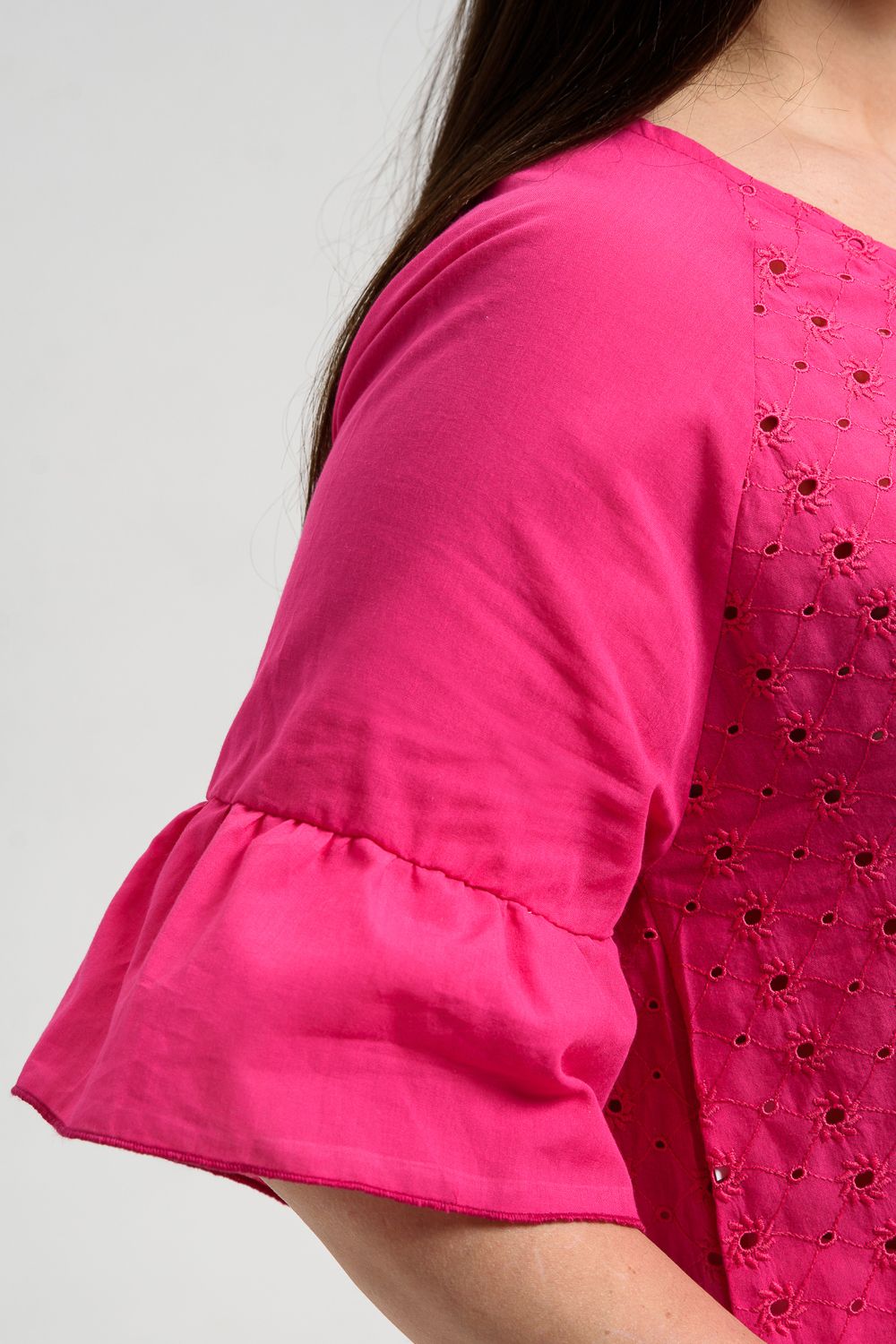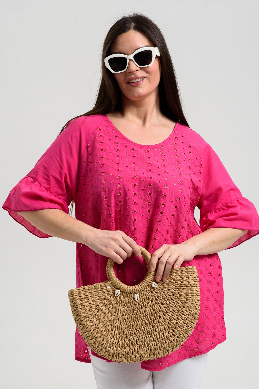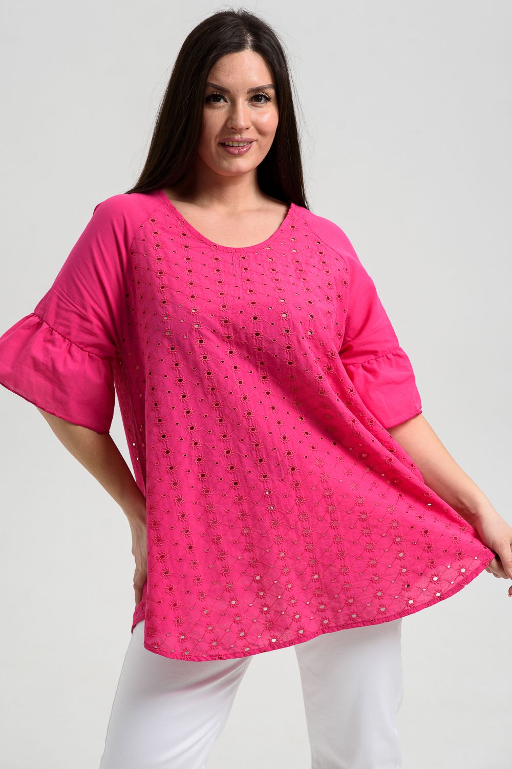 Туника женская, расширенная к низу. Горловина округлая. Рукав реглан, внизу рукава широкая рюша. Низ туники фигурный, в боковых швах внутренние карманы. Свободная, легкая, не стесняющая движений туника незаменима для летнего гардероба любой женщины.