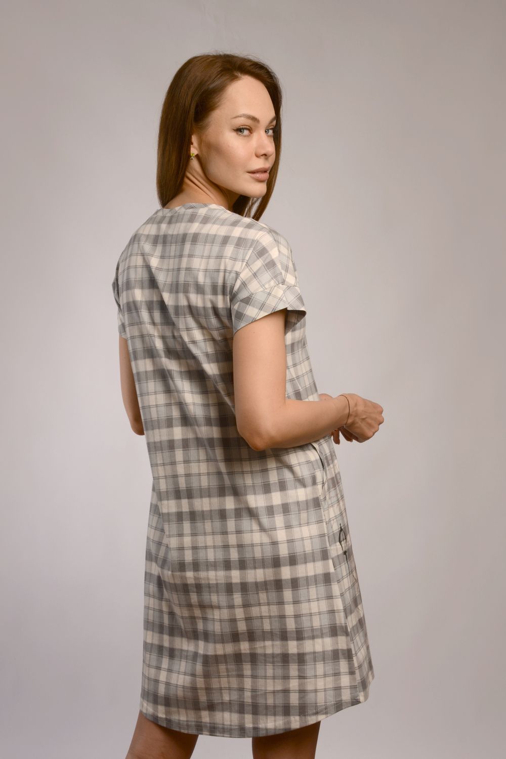 Домашняя свободная туника, слегка расширена к низу из мягкого трикотажного полотна, длина до колена с удлинением нижнего края на спинке, рукав спущенный цельнокроенный, полочка с V - образным вырезом, карманы внутренние в боковых швах.