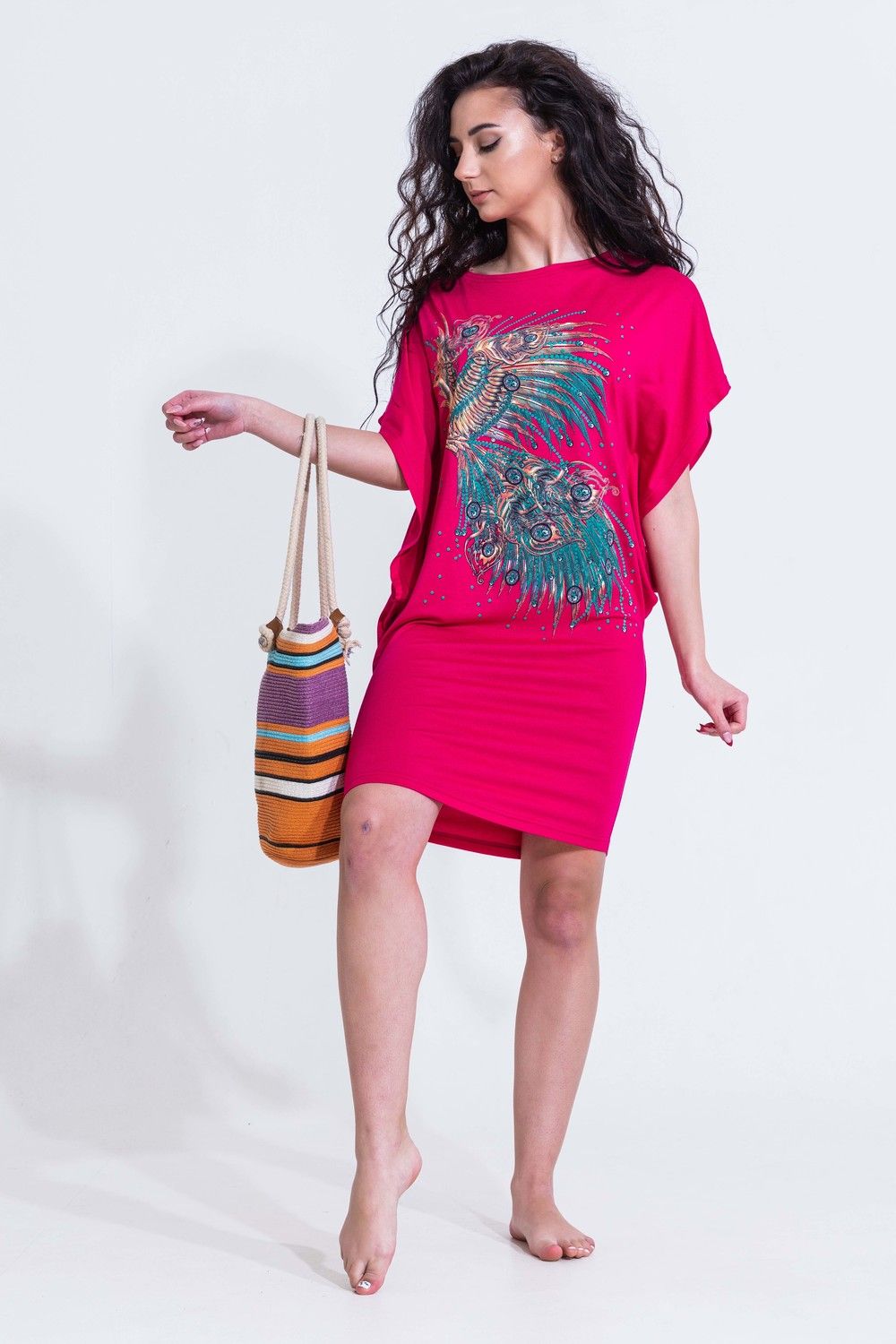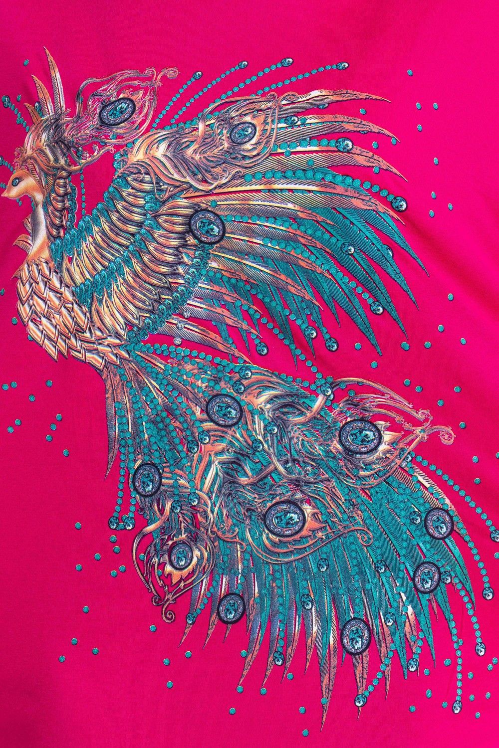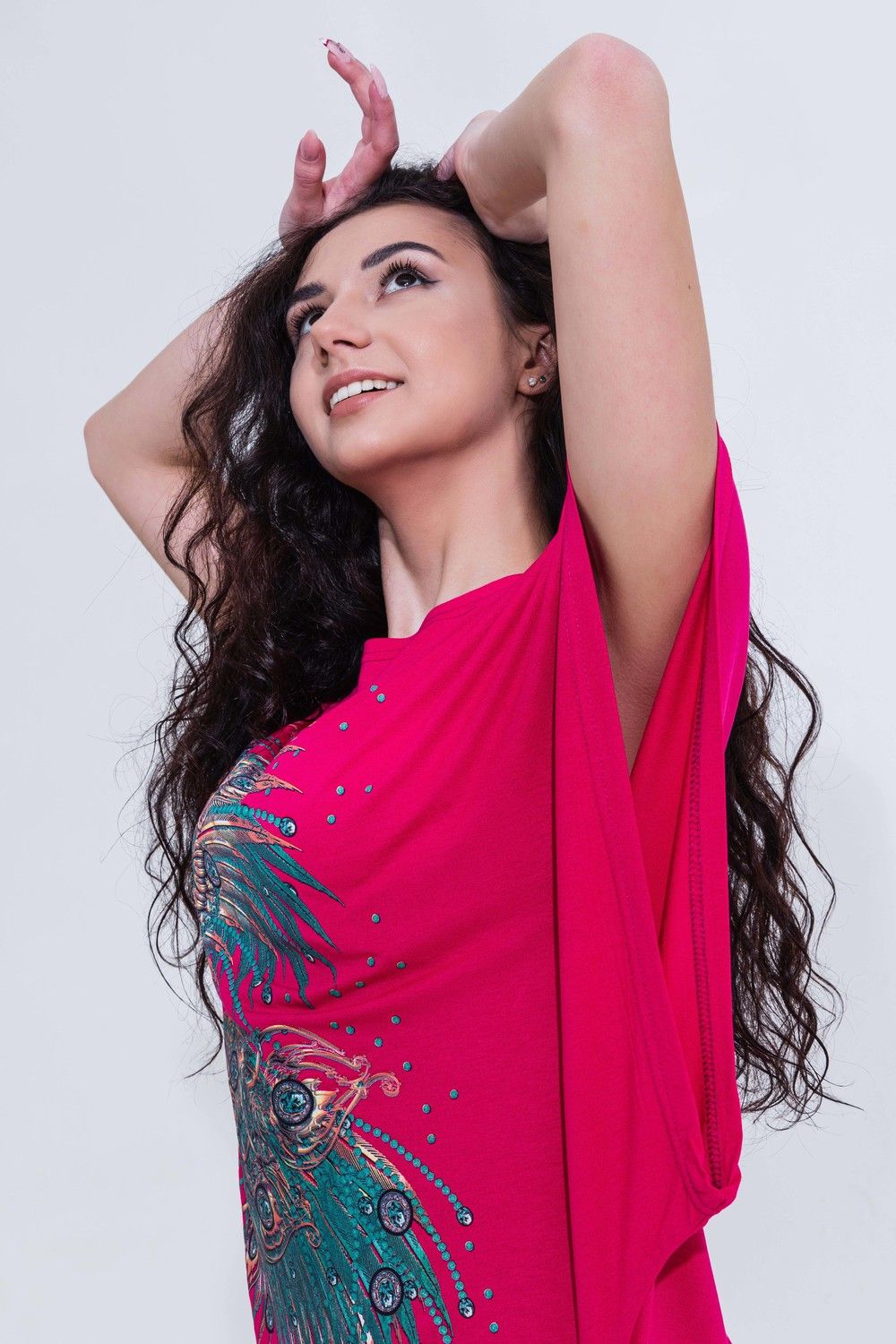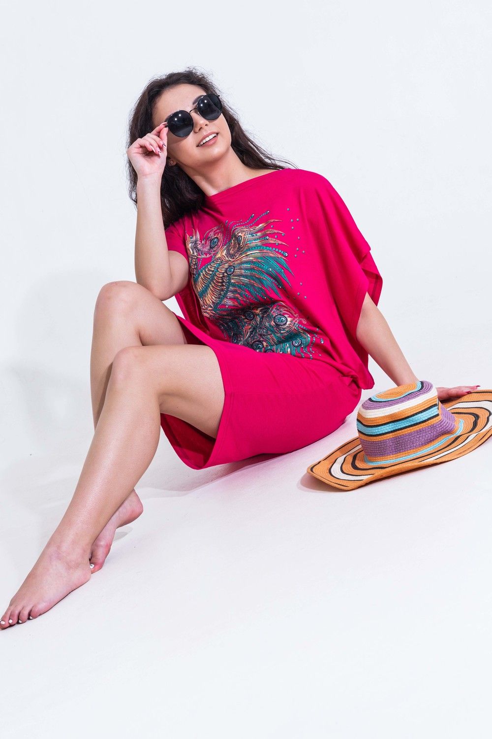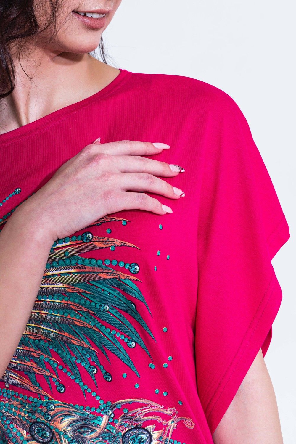 Туника из вискозы с широкими рукавами. Принт в виде сказочной птицы с орнаментами, общая длина до середины бедра, рукав короткий. Пять расцветок — бирюзовая, малиновая, ментоловая, фуксия и шоколадная
