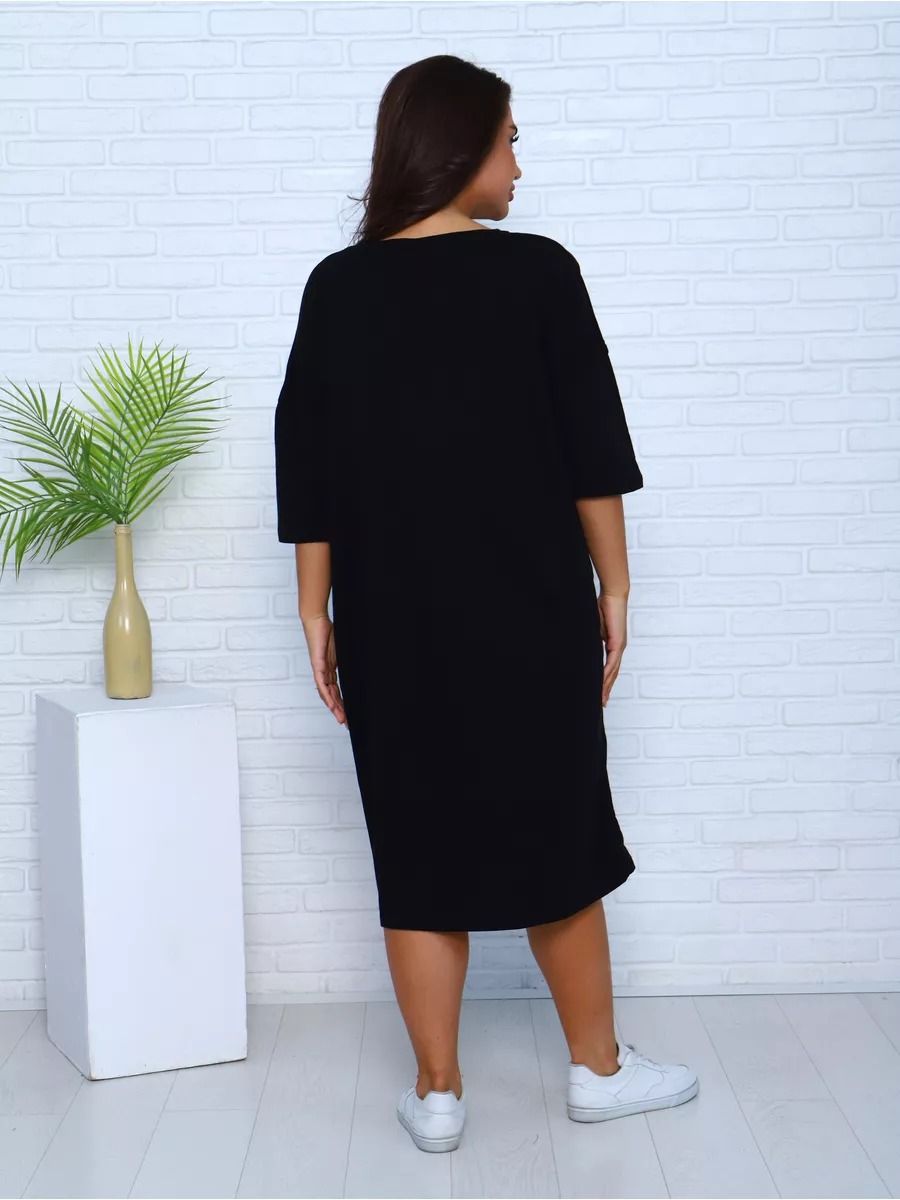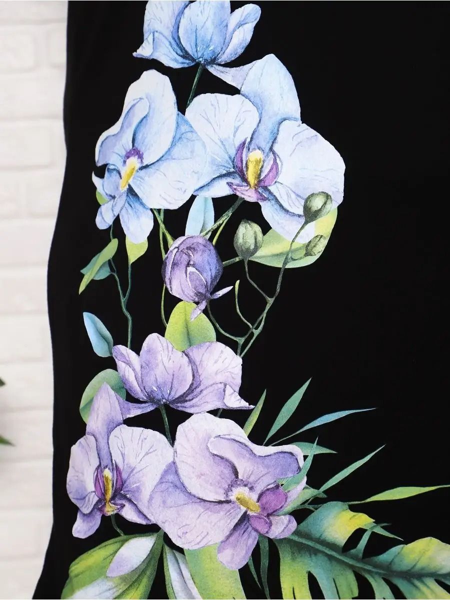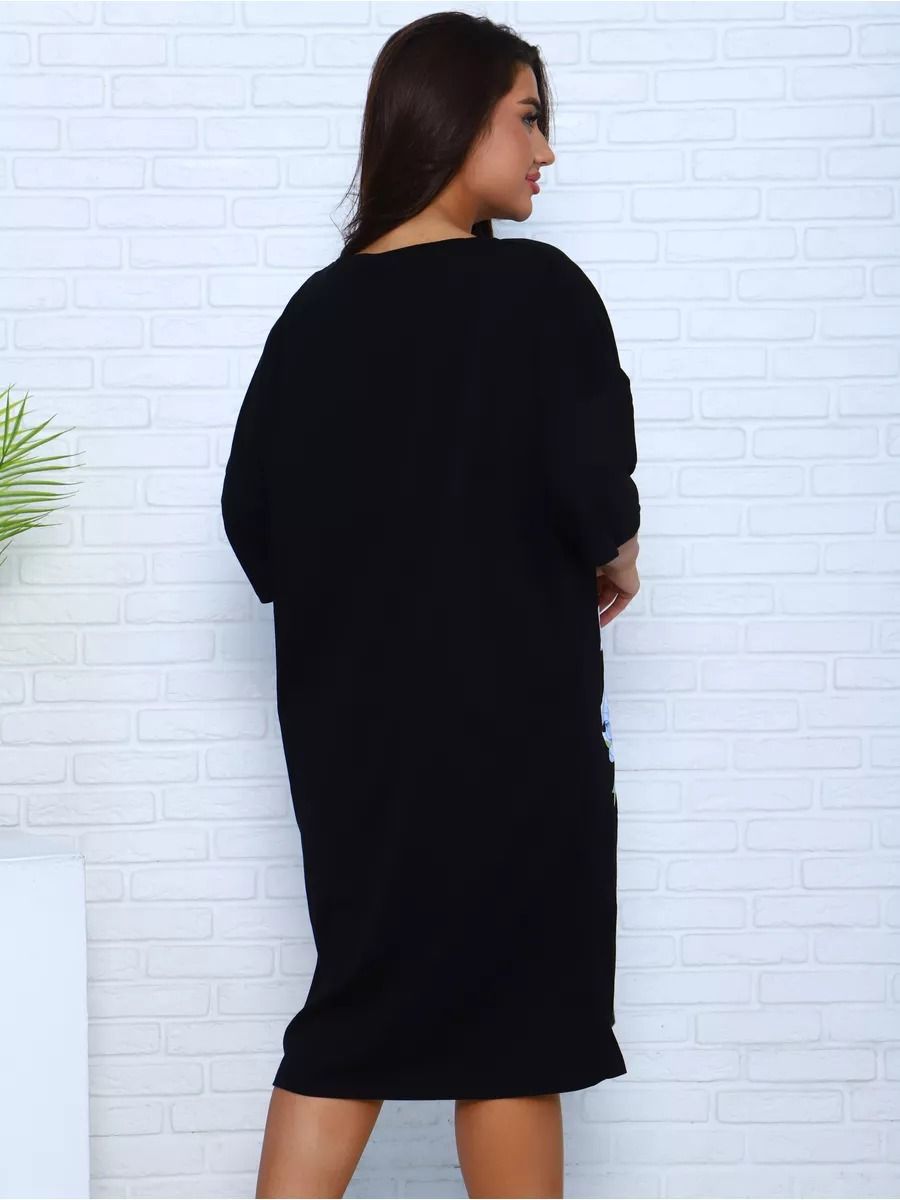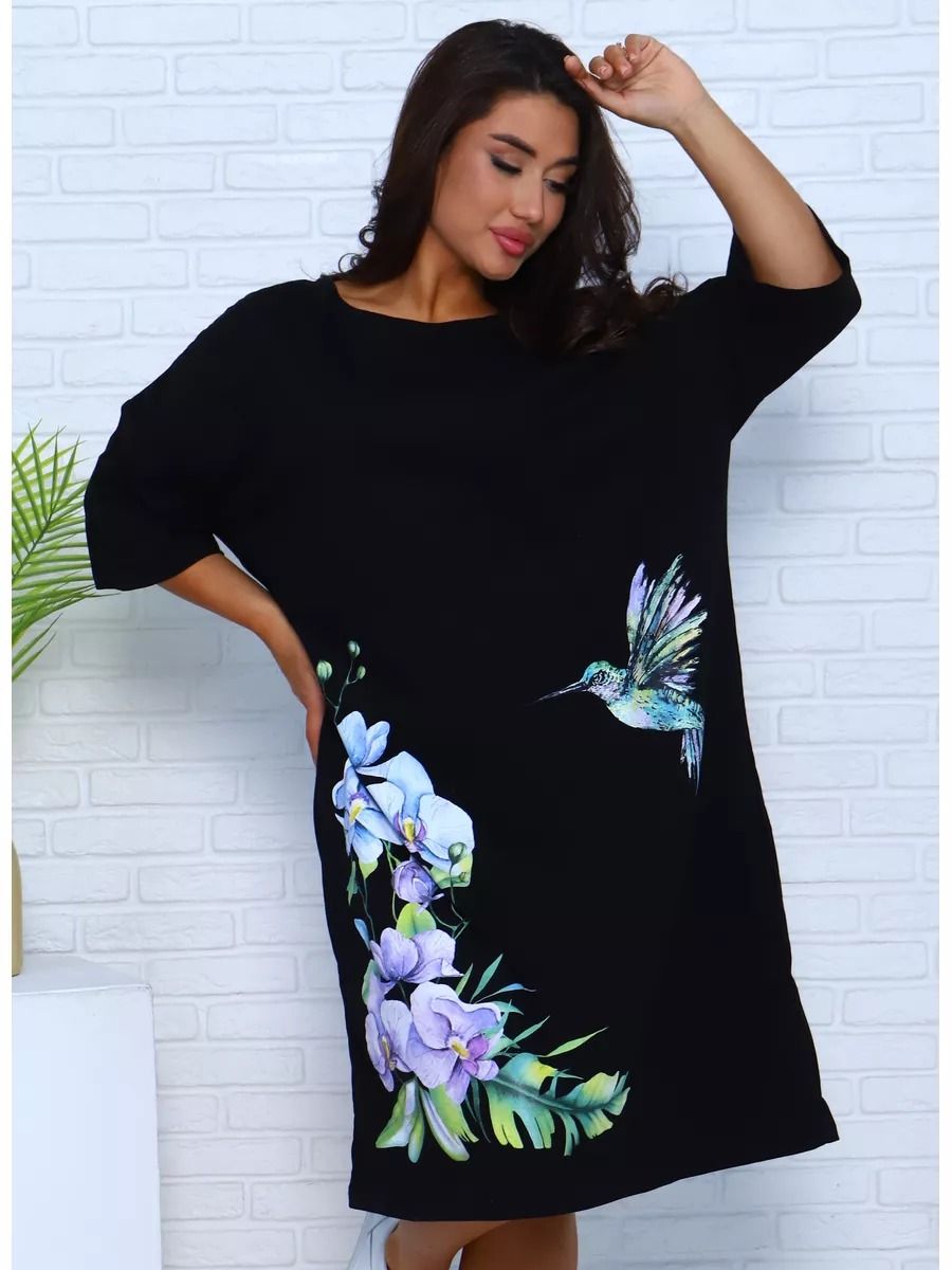 Платье - футболка для дома больших размеров из 100% хлопка. Приятная к телу дышащая ткань из которой сшиты наши туники в форме удлиненной футболки свободного кроя - идеальная версия домашней одежды. Большой рисунок с цветами и яркой колибри не смоется и не выгорит на солнце, не потускнеет от многократных стирок. Платье черного цвета выглядит наиболее выигрышно, а рисунок на нем смотрится особенно ярко и насыщенно. На средний рост длина платья будет ниже колена, на высоких девушках оно сядет чуть короче.