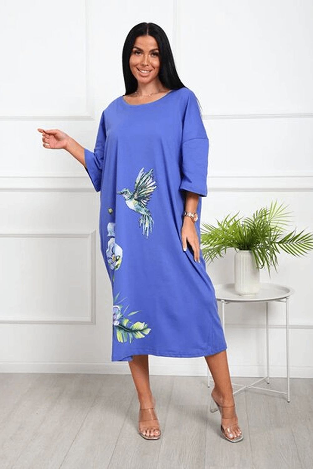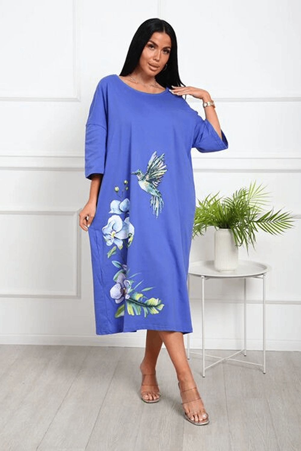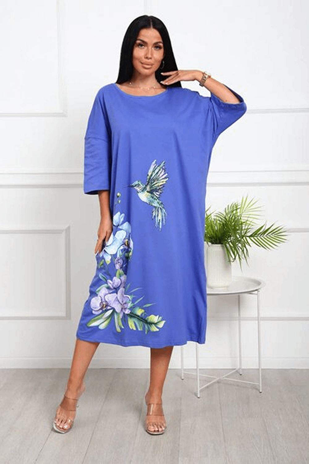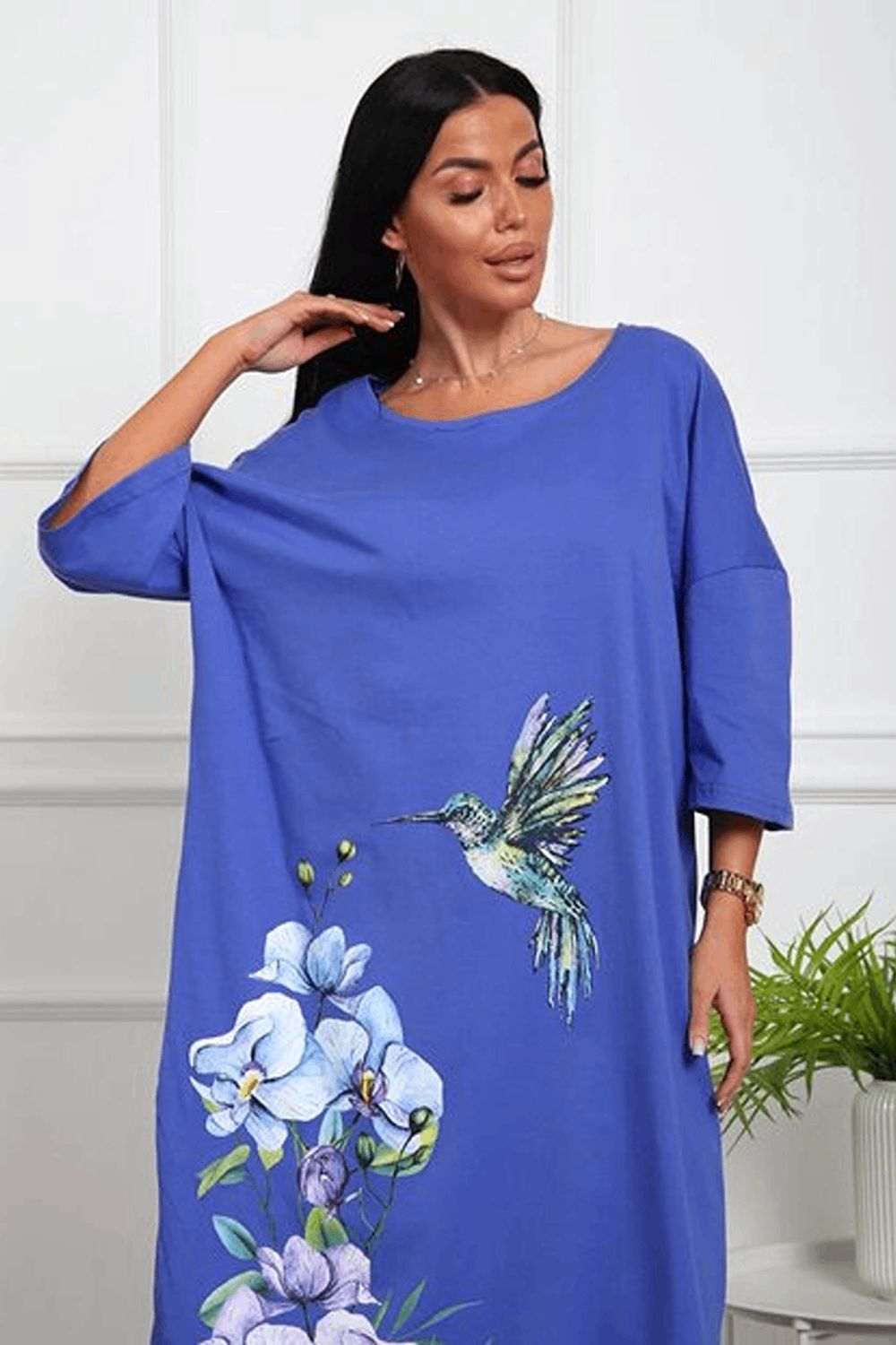 Платье - футболка для дома больших размеров из 100% хлопка. Приятная к телу дышащая ткань из которой сшиты наши туники в форме удлиненной футболки свободного кроя - идеальная версия домашней одежды. Большой рисунок с цветами и яркой колибри не смоется и не выгорит на солнце, не потускнеет от многократных стирок. Платье черного цвета выглядит наиболее выигрышно, а рисунок на нем смотрится особенно ярко и насыщенно. На средний рост длина платья будет ниже колена, на высоких девушках оно сядет чуть короче.