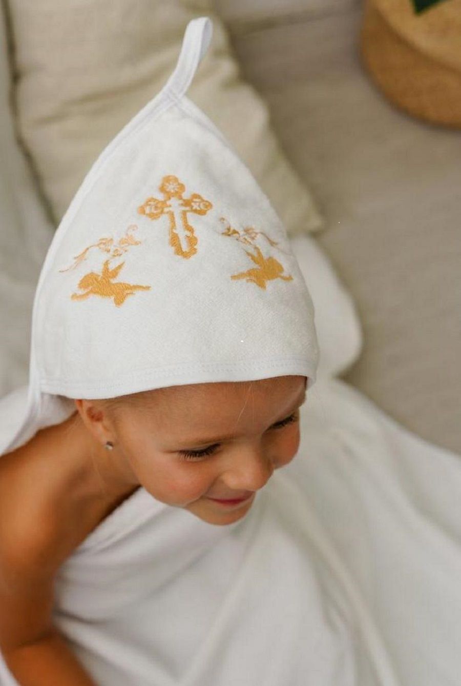 Детское крестильное полотенце с уголком махровое белое изготовлено из мягкого 100% хлопка, который подходит для новорожденных, не вызывает аллергии и отлично впитывает влагу. С обеих сторон полотенца - мягкая петельчатая махра. Полотенце с капюшоном большого размера 90х100 см для детей с рождения до 5-6 лет позволяет укутать малыша полностью с макушки до пяточек. Удобный капюшон с вышивкой золотой нитью (православная тематика, ангелы) поможет быстро высушить волосы. Этот банный аксессуар с оригинальным дизайном, как мягкое махровое облачко, понравится всем членам семьи без исключения! Полотенце быстро впитывает влагу и подойдет для ванной. Махровая ткань отлично пропускает воздух, позволяя коже "дышать". Полотенце для мальчика и девочки подходит всем, кто подбирает товары для новорожденных, памятный подарок молодой будущей маме, на рождение ребенка, на годик, выписку из роддома, крестины малыша, внуку, внучке. Это банное махровое полотенце для новорожденного с уголком в идеальном исполнении: натуральное, функциональное и очень красивое!