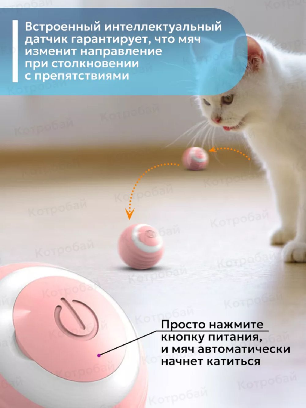 Интерактивный игровой мяч для вашего питомца - умное развлечение и веселье! Мяч легко вращается на 360 градусов по всему полу, создавая захватывающую яркую подсветку. Он выбрирует, кружится, прокатывается вокруг углов и убегает от вашего питомца, чтобы вызвать его охотничий инстинкт! Незабываемые игры ждут вашего питомца на ровных поверхностях, таких как ламинат, кафель, плитка и линолеум. К сожалению, на ковровых или неровных поверхностях мячик может застрять и не сможет убежать от вас. В комплекте с мячом идет кабель Type-C для быстрой зарядки, чтобы ваш питомец никогда не скучал. Зарядка игрушки - это так просто! Эта интерактивная игрушка сделана из мягкого силикона и прочного ABS-пластика. Она устойчива к царапинам, но не выдержит укусов. Поэтому она предназначена только для котят, кошек и собак мелких пород. В ночное время мячик работает бесшумно, чтобы не беспокоить сон ваших хозяев, пока ваш питомец бегает по дому за светящимся шариком. Этот развивающий аксессуар для домашнего питомца имеет два режима работы: обычный и интеллектуальный. Вы можете переключать их с помощью кнопки на мячике.