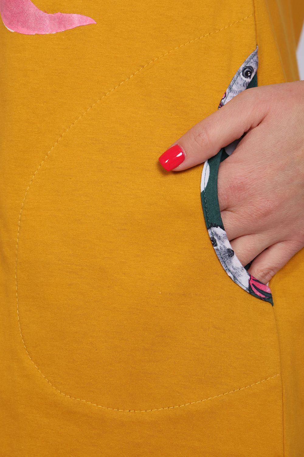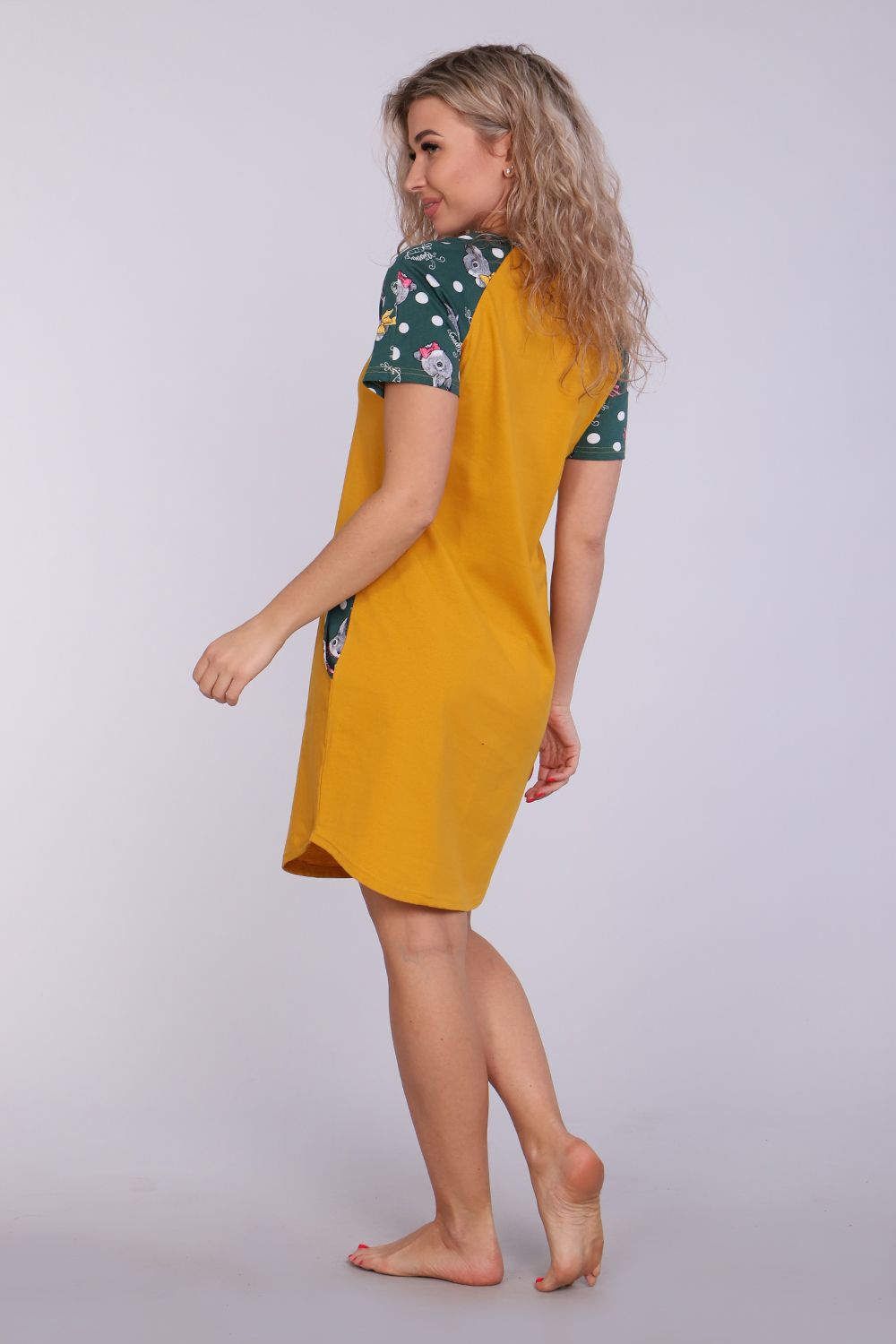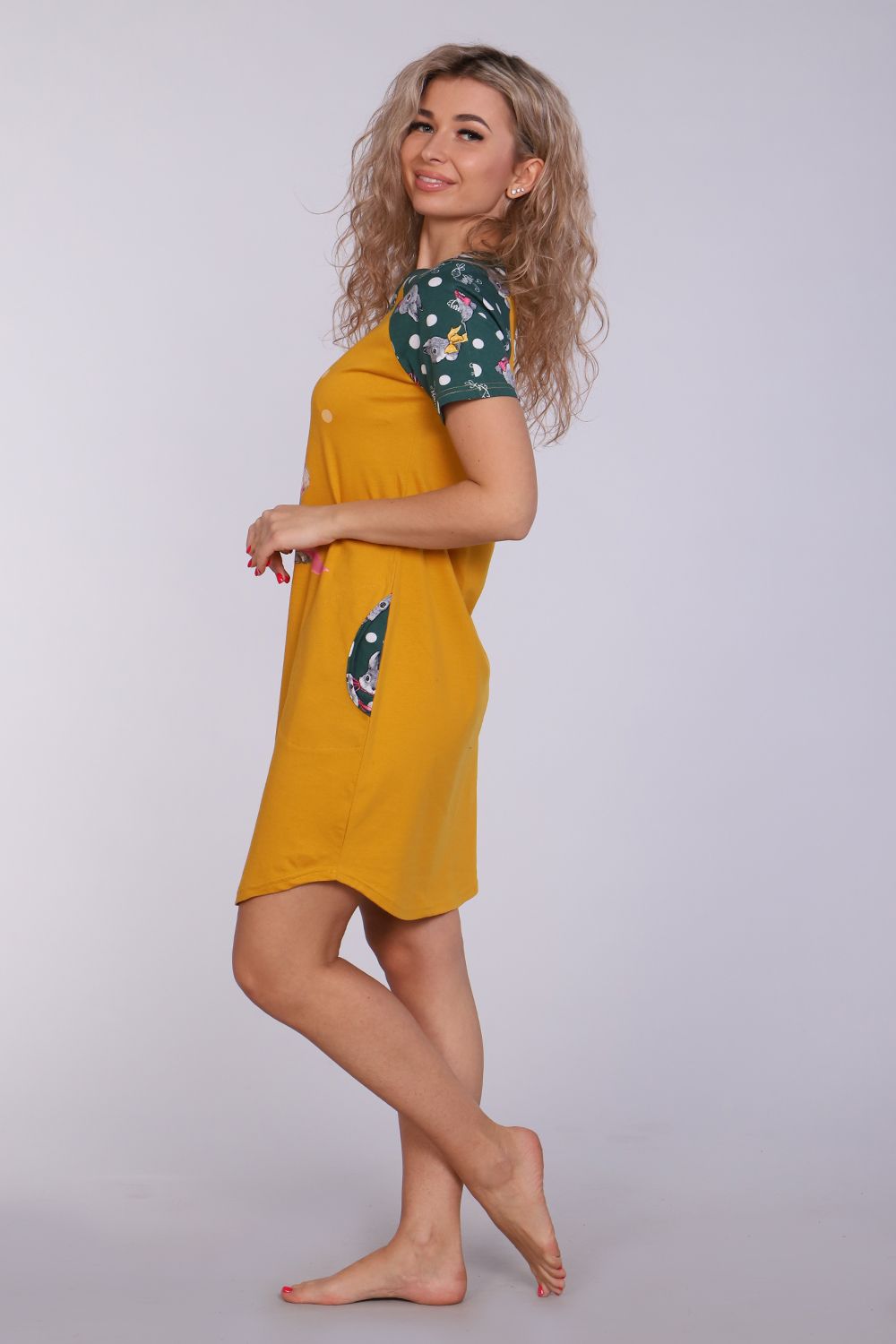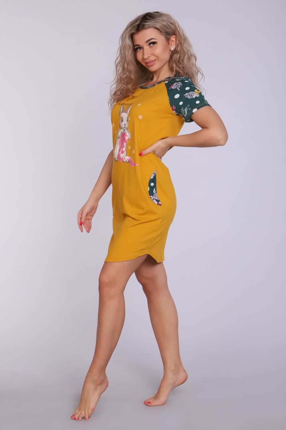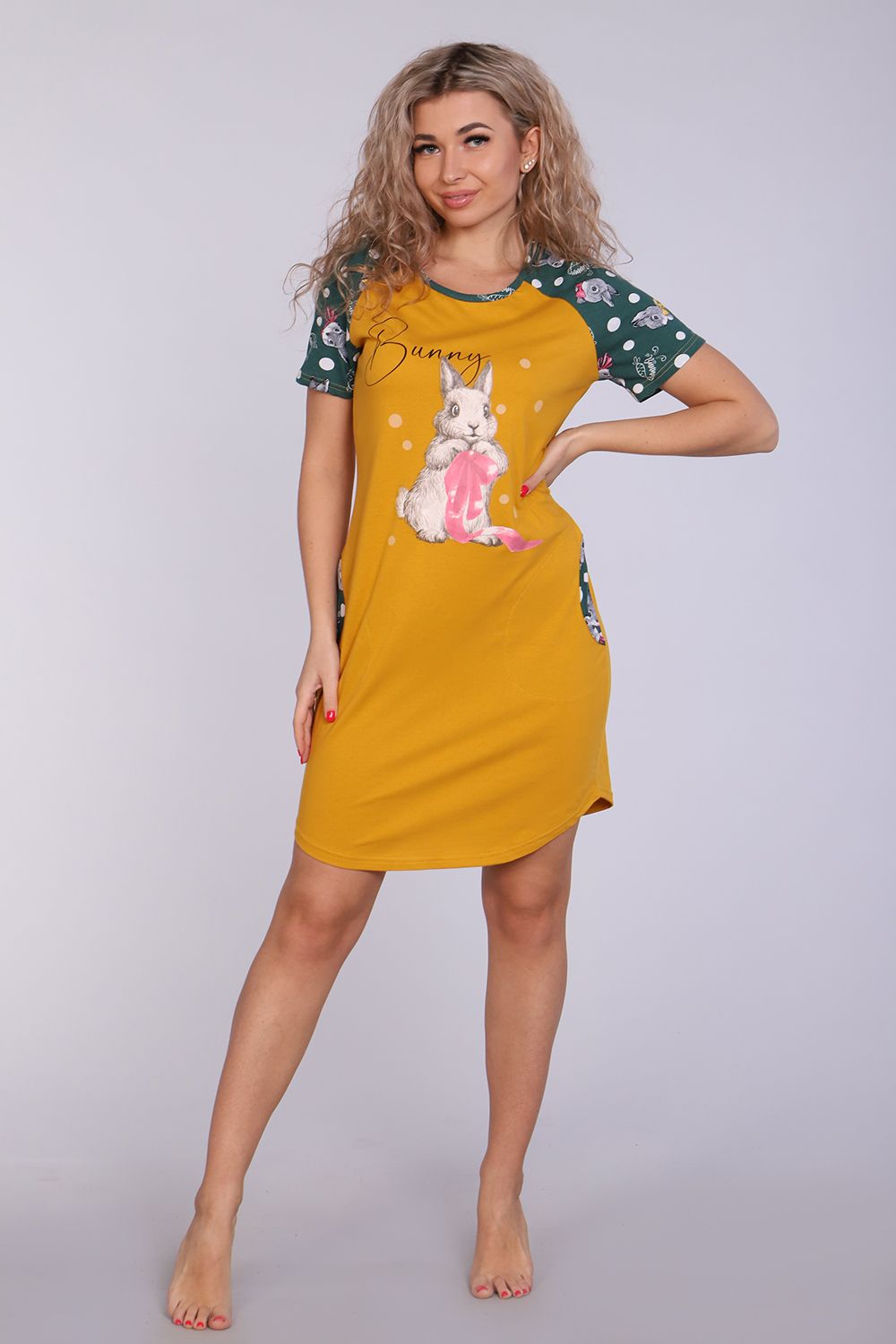 Женское платье-туника длиной чуть выше колена с милым принтом на полочке в виде животного-символа Нового 2023 года - зайчика, с короткими рукавами - реглан контрастного цвета и округлой горловиной. Низ платья закруглен и образует небольшие разрезы по бокам. Горловина и вход в карманы обработаны окантовкой из ткани рукавов. Наличие боковых карманов добавит дополнительный комфорт при использовании. Выполнена из трикотажного полотна, 100% хлопок. Удобная, модная приятная к телу. Не стесняет движения. Яркие стойкие цвета соответствуют модным тенденциям. Можно носить, как домашнюю тунику или уличное платье. Для дома и отдыха, для дачи. Новогодняя тематика принтов делает эту модель отличным подарком девушкам на Новый год!