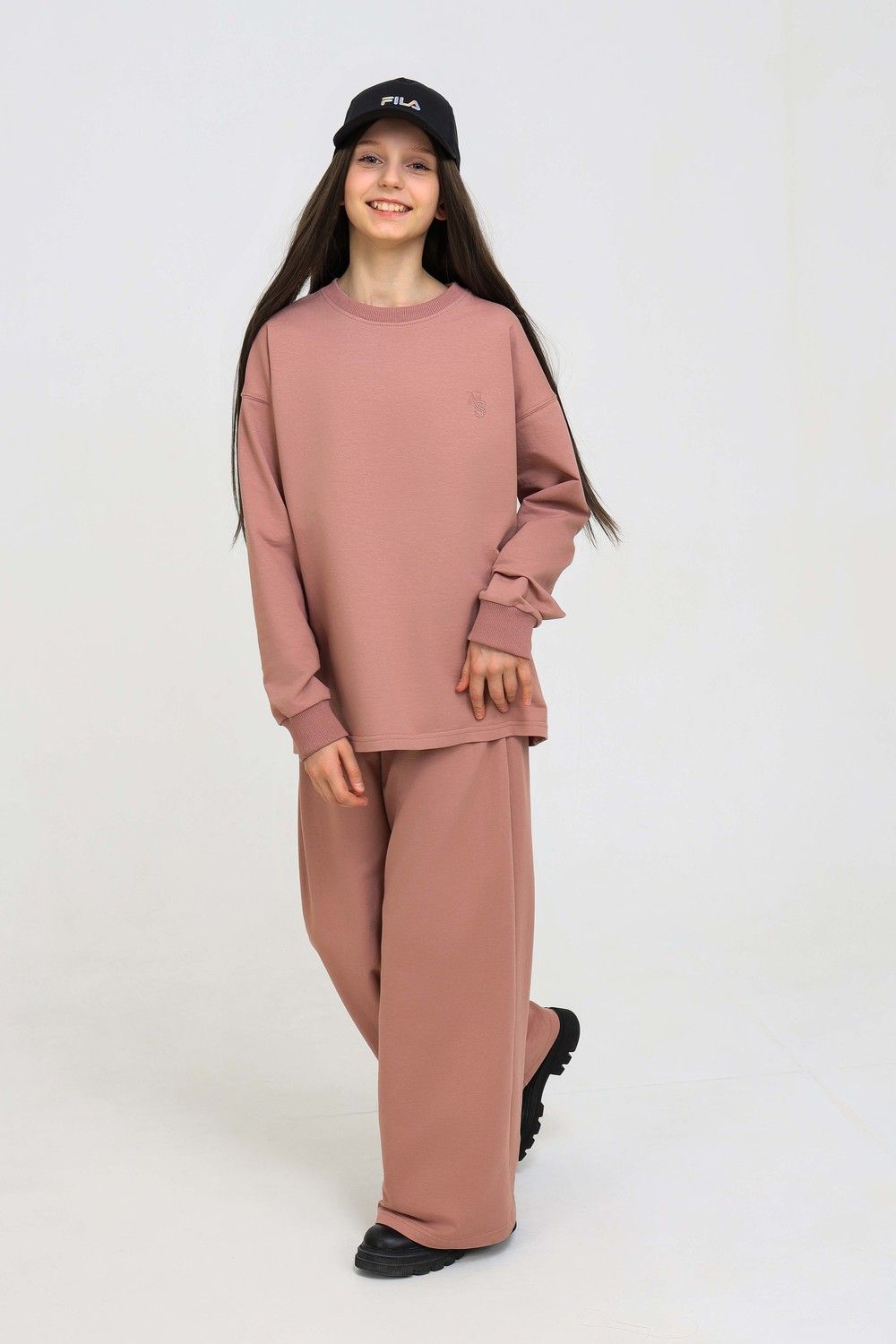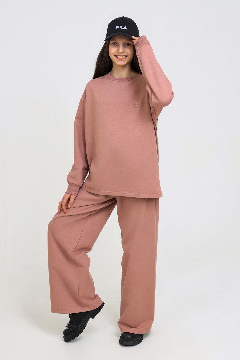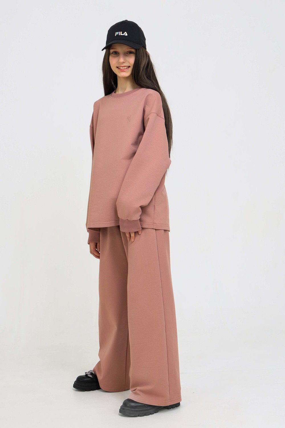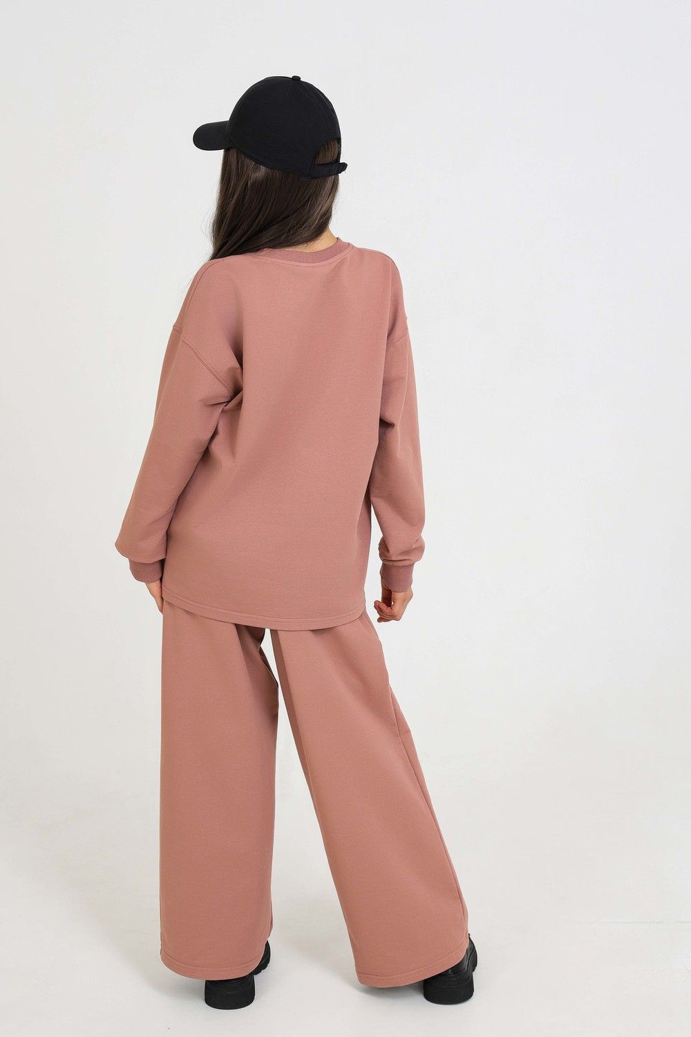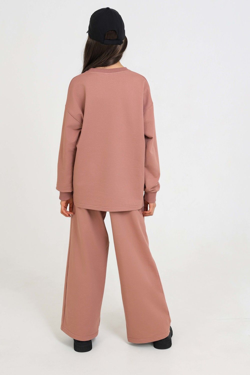 Спортивный костюм из футера мастхэв в детском гардеробе. Состоит их брюк-клёш и свитшота. Свитшот свободного кроя. Манжеты и горловина обработаны мягким кашкорсе. Брюки палаццо с карманами по бокам с поясом на мягкой резинке.