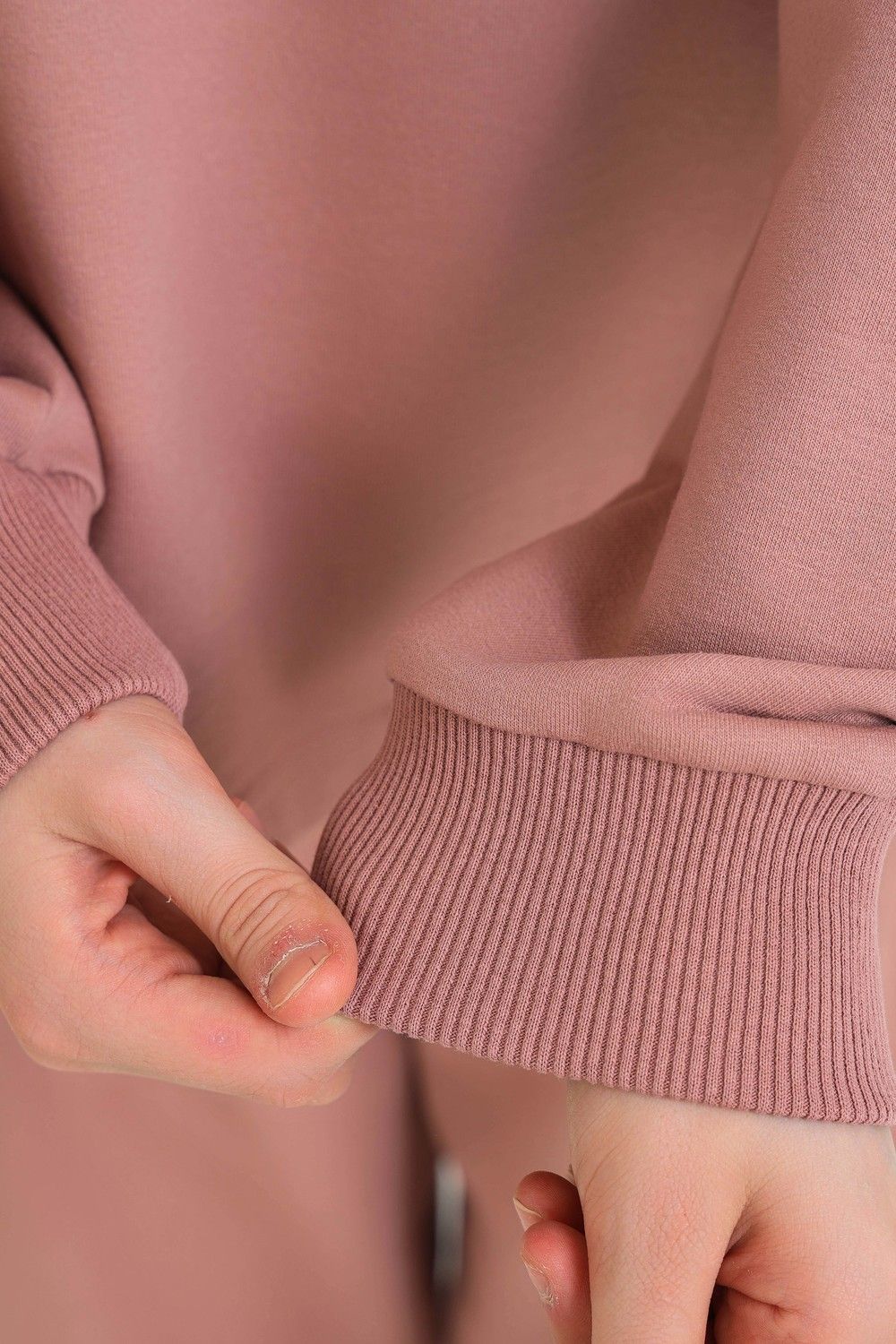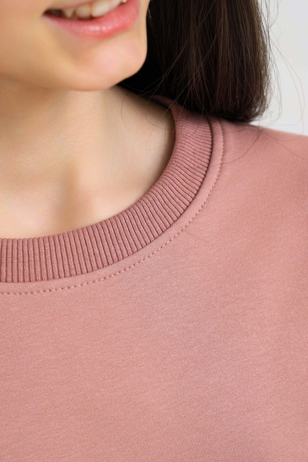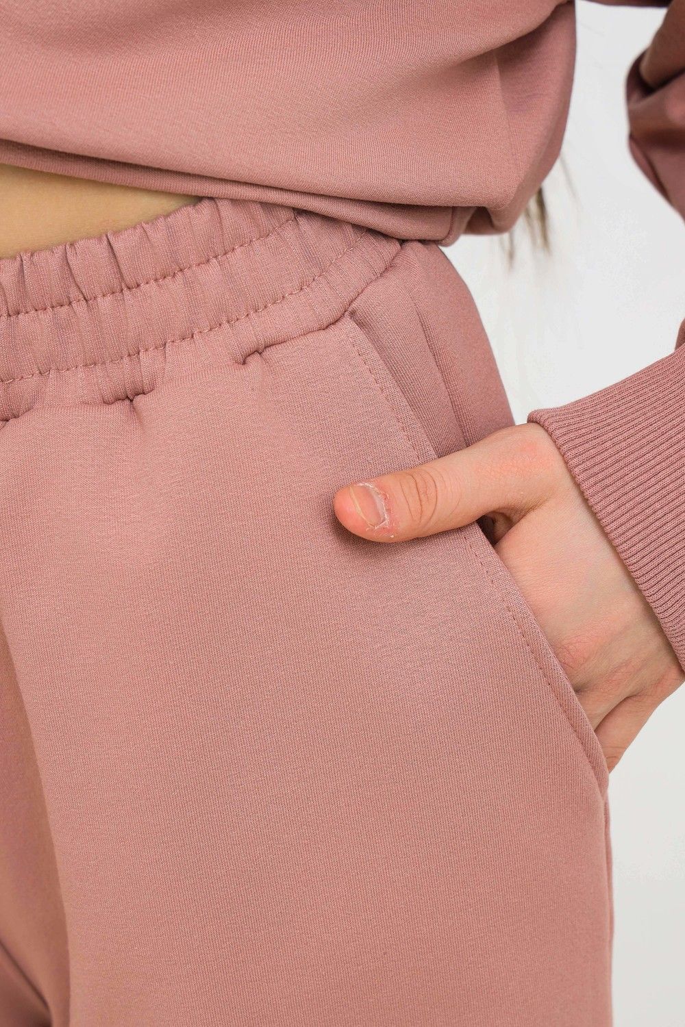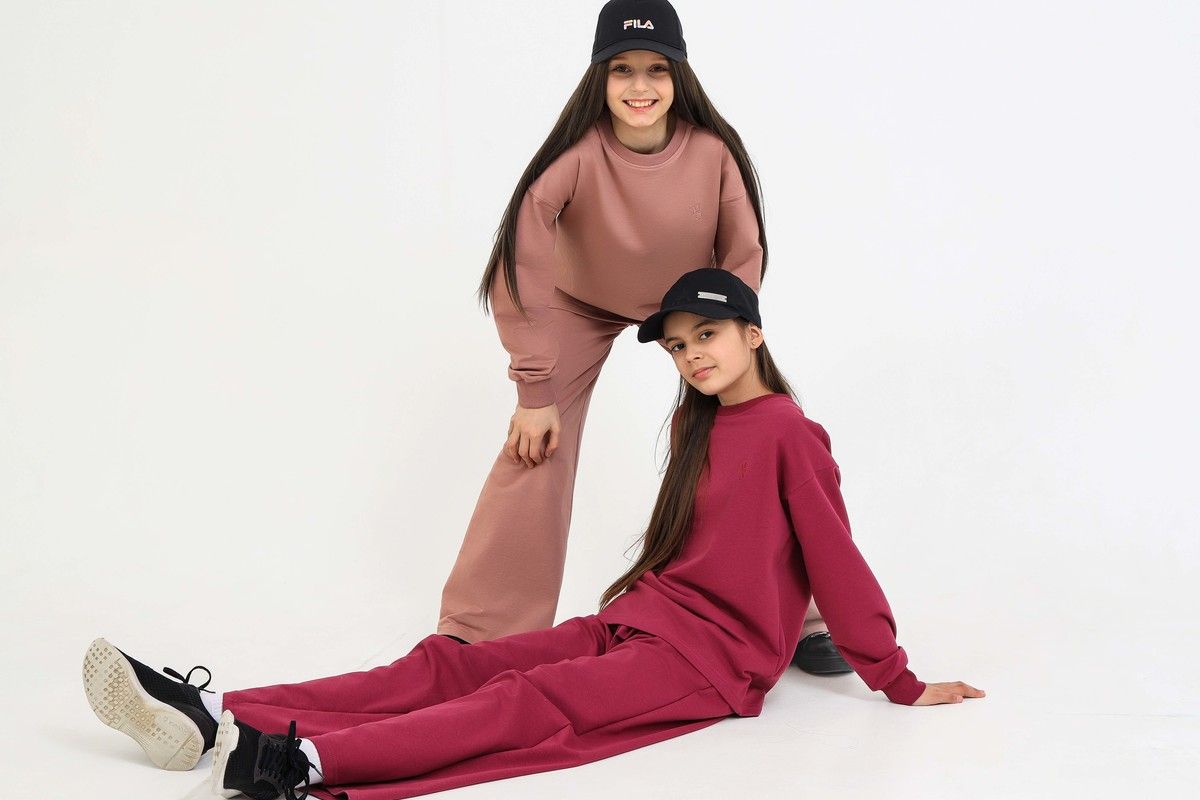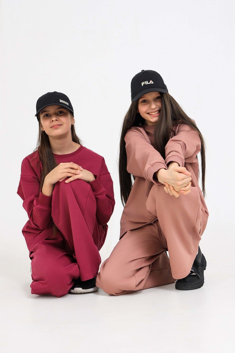 Спортивный костюм из футера мастхэв в детском гардеробе. Состоит их брюк-клёш и свитшота. Свитшот свободного кроя. Манжеты и горловина обработаны мягким кашкорсе. Брюки палаццо с карманами по бокам с поясом на мягкой резинке.
