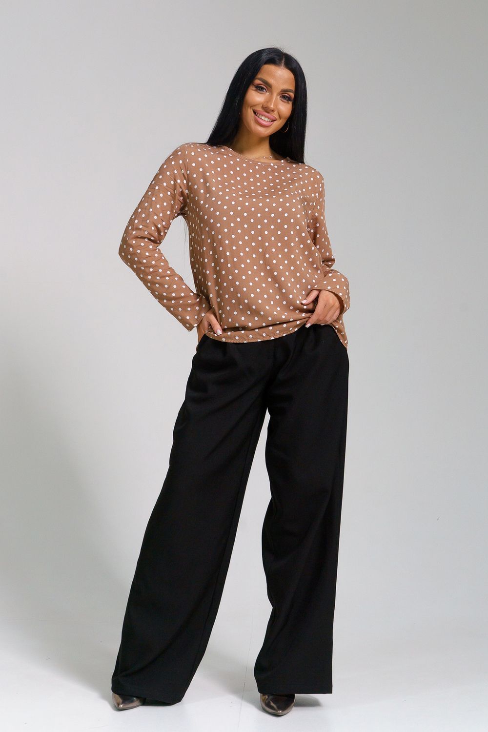 Женственная туника с принтом горох и переходящими на перед кокетками. Горловина окантована, рукава и низ туники подшиты на прямострочке.