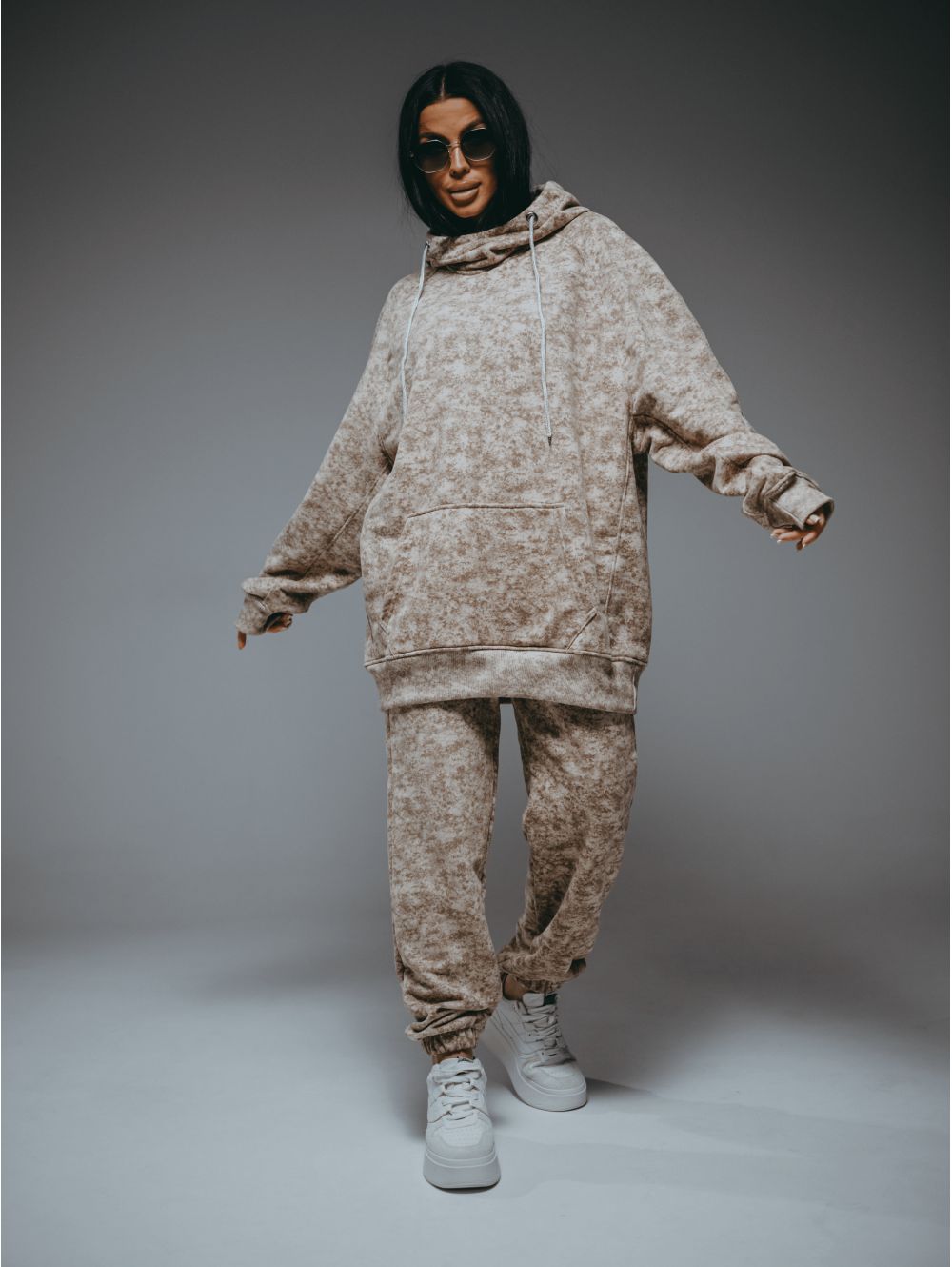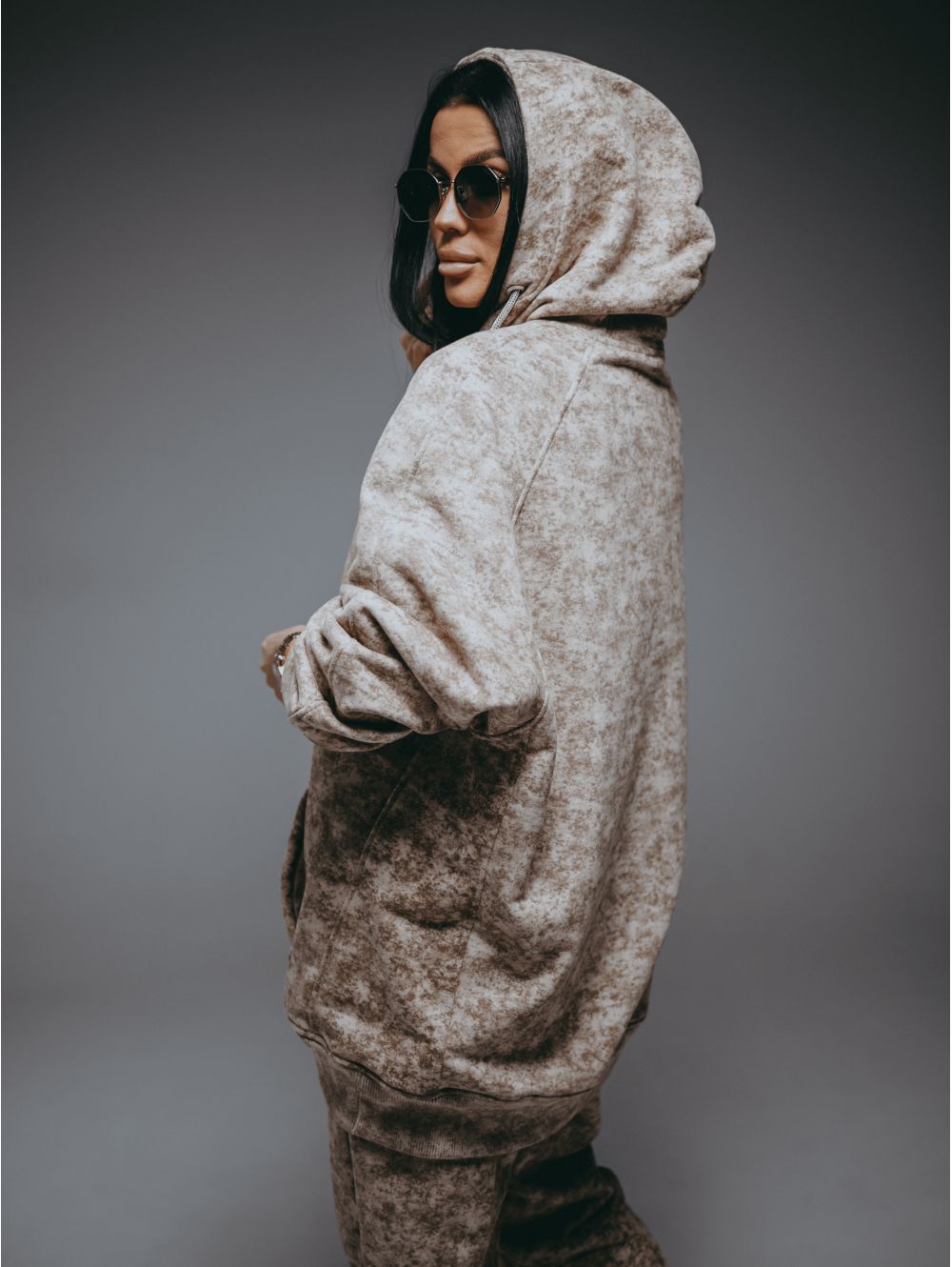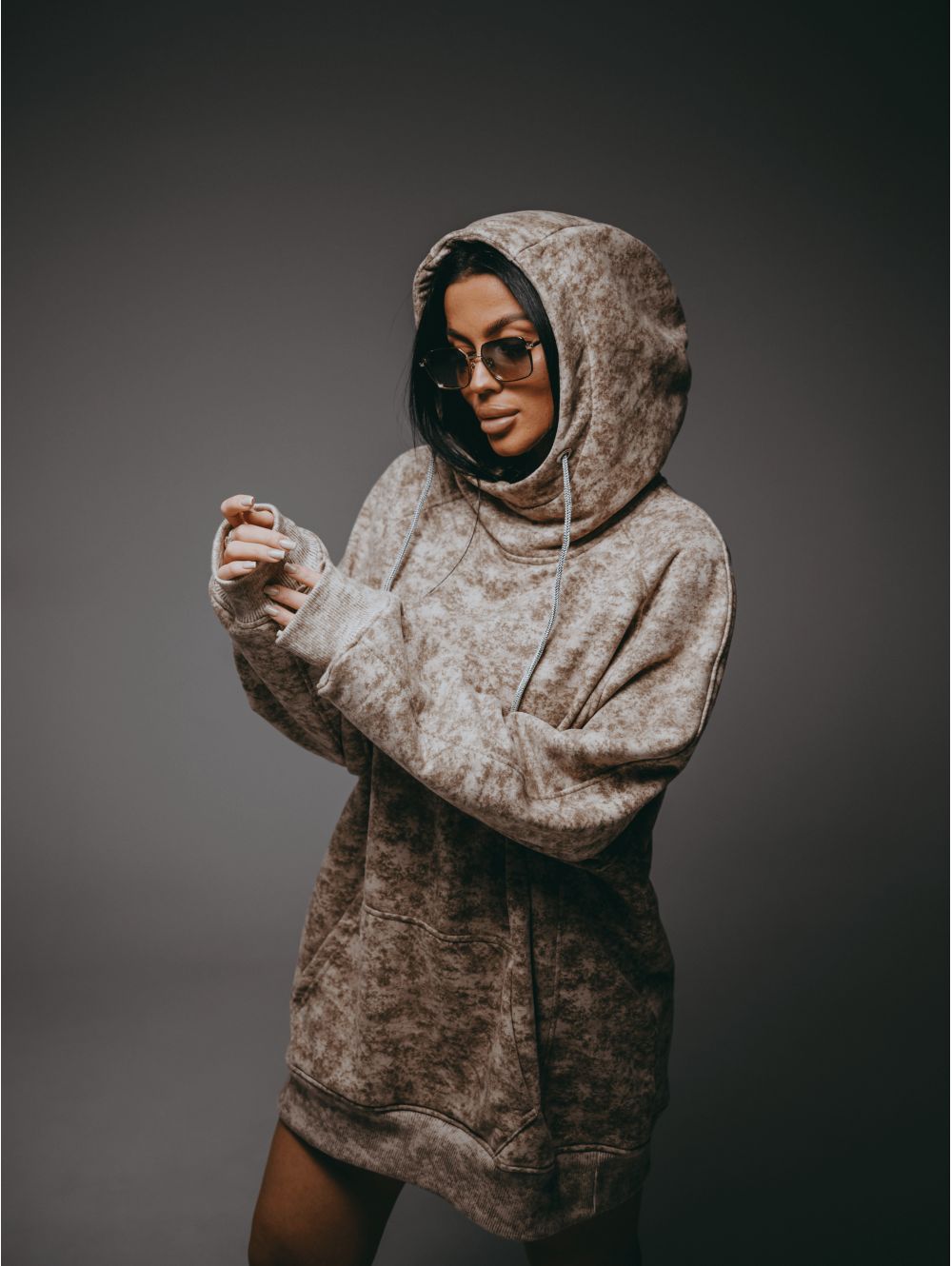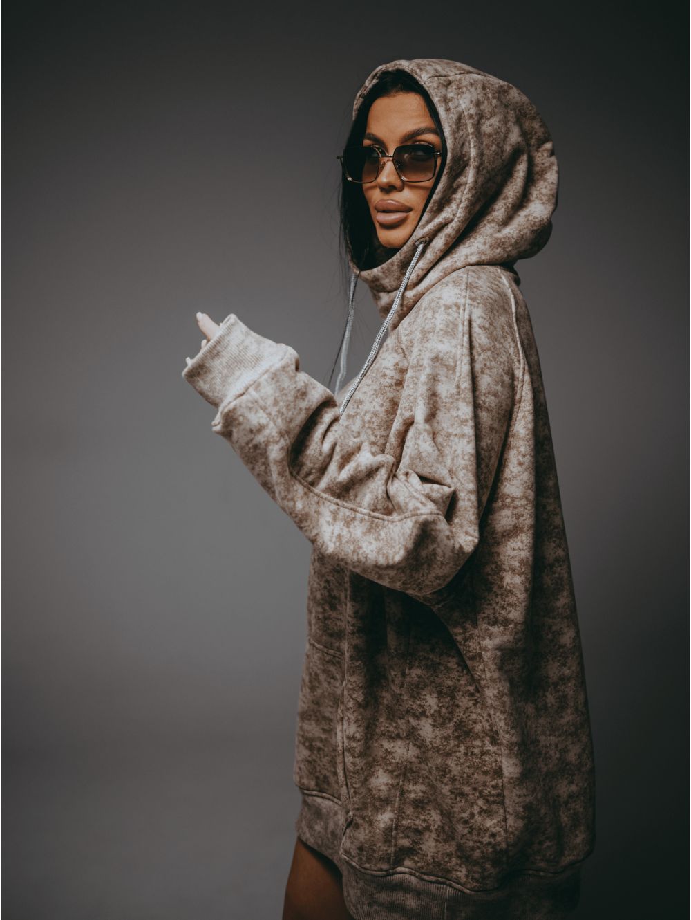 Худи – oversize кроя с притачным поясом по низу, с длинным рукавом реглан на манжете.