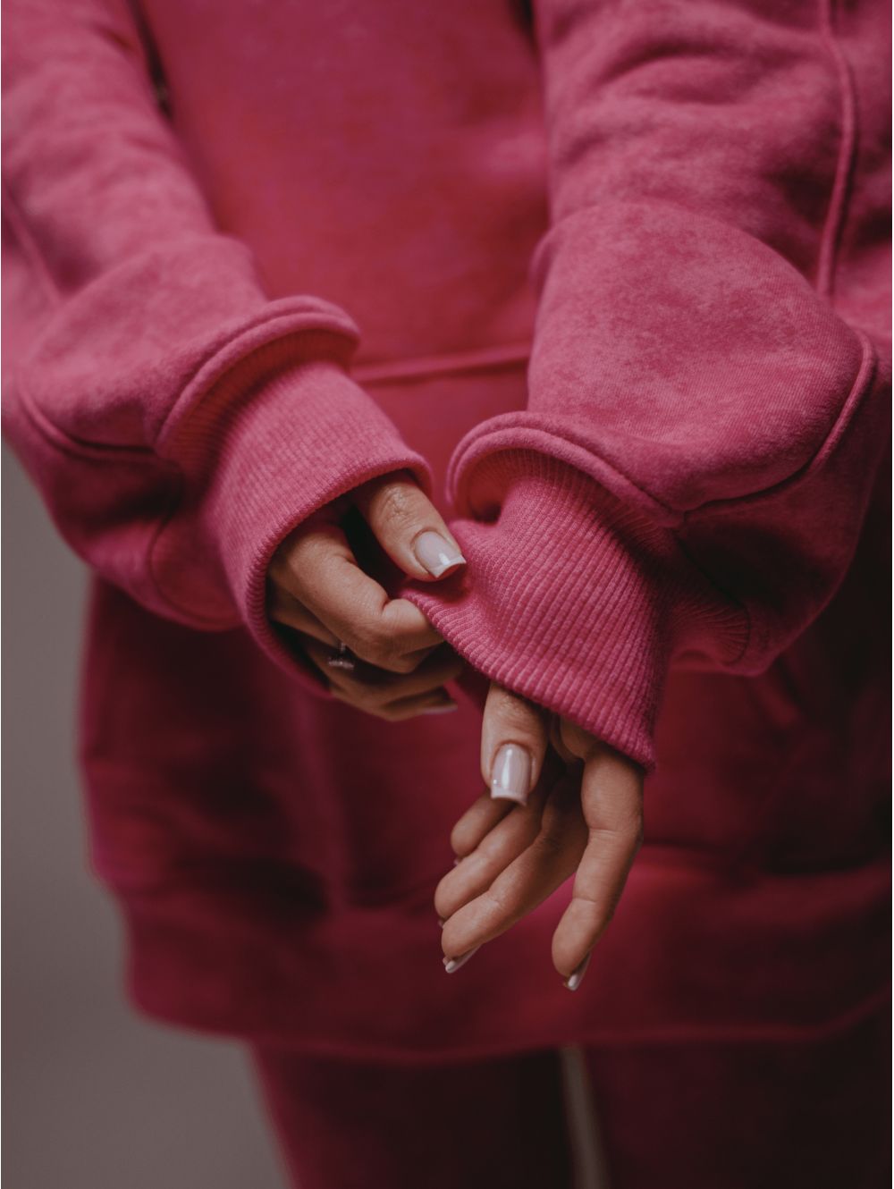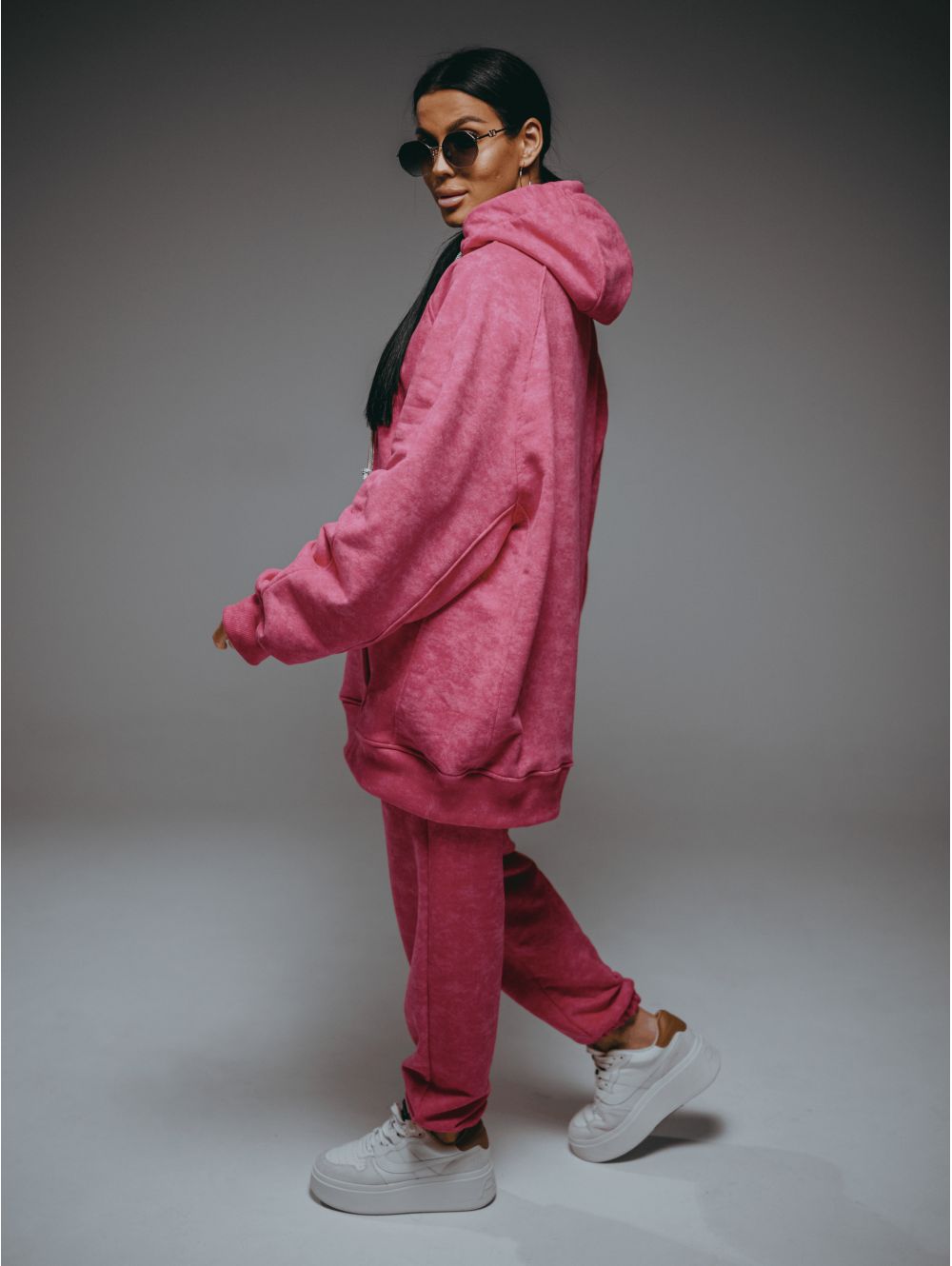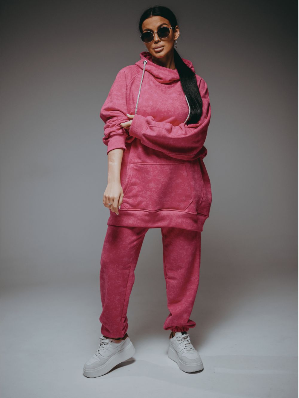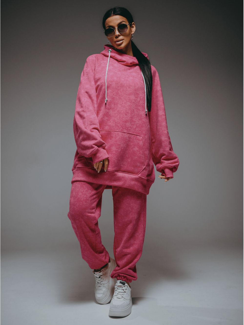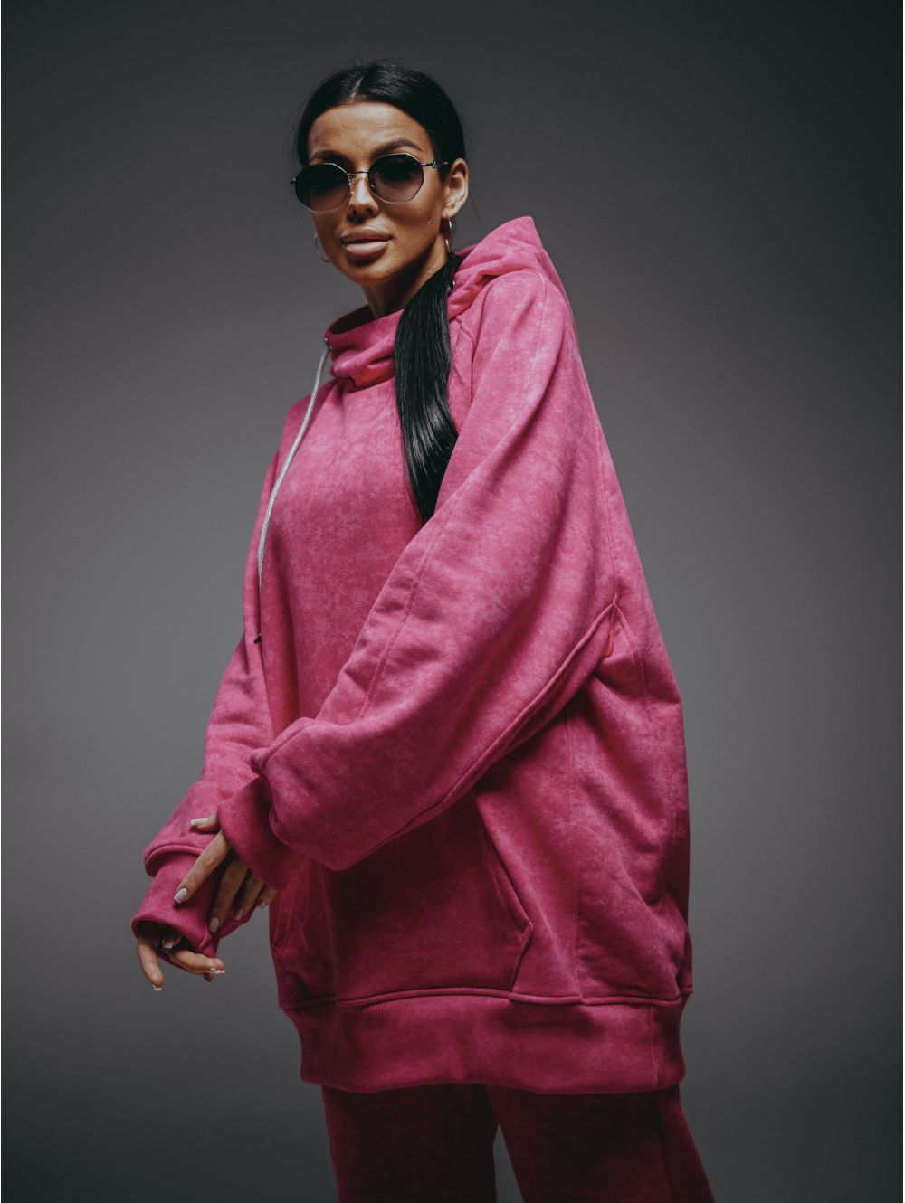 Худи – oversize кроя с притачным поясом по низу, с длинным рукавом реглан на манжете.