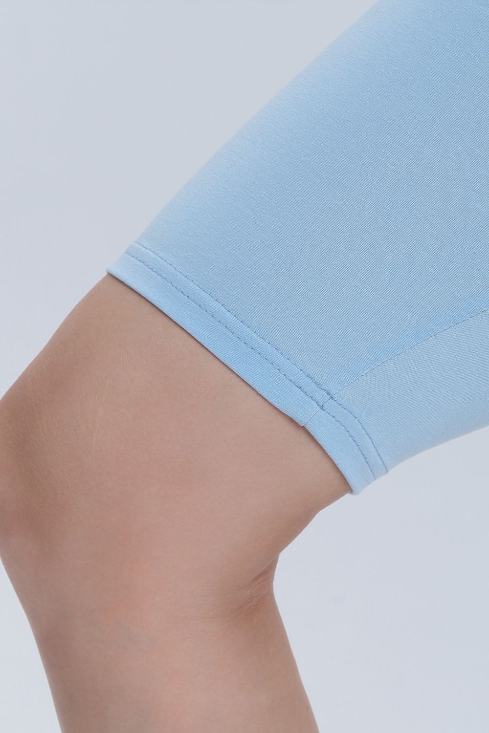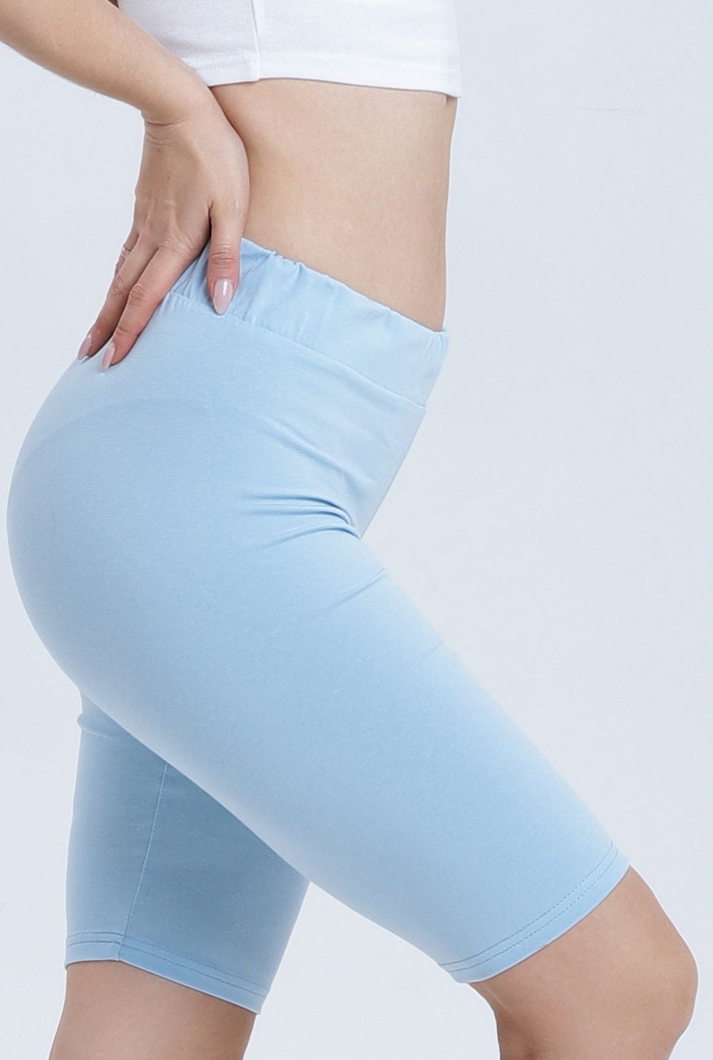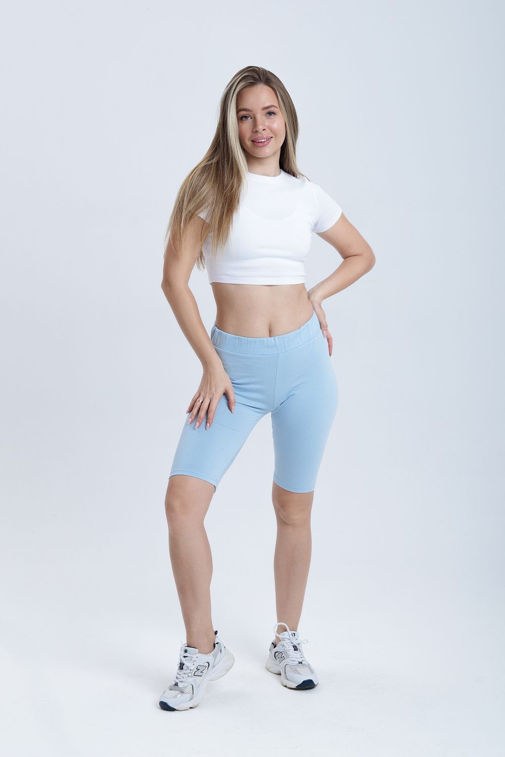 Велосипедки облегающего силуэта, с высокой линией талии. Пояс широкий отрезной с эластичной тесьмой внутри. Нижний срез обработан швом вподгибку.