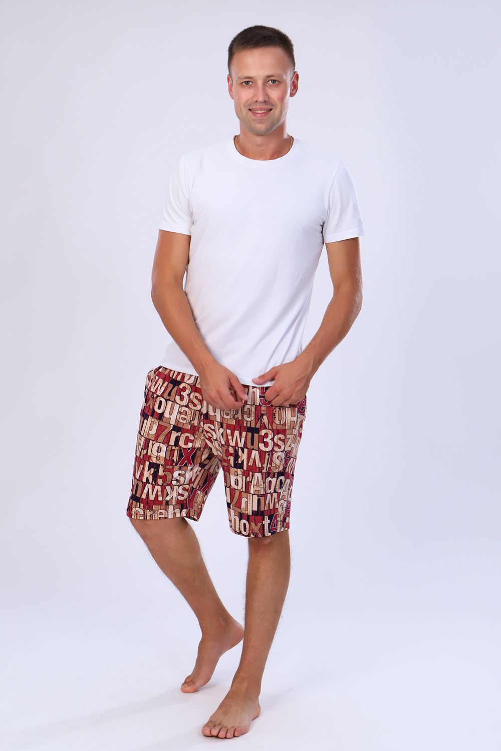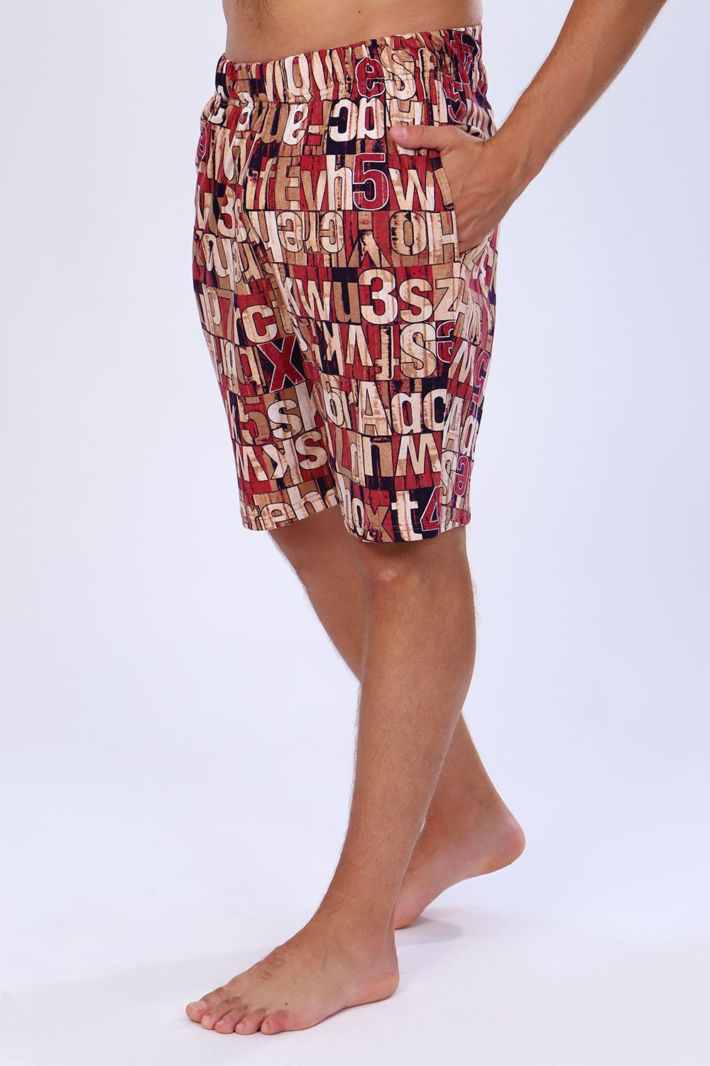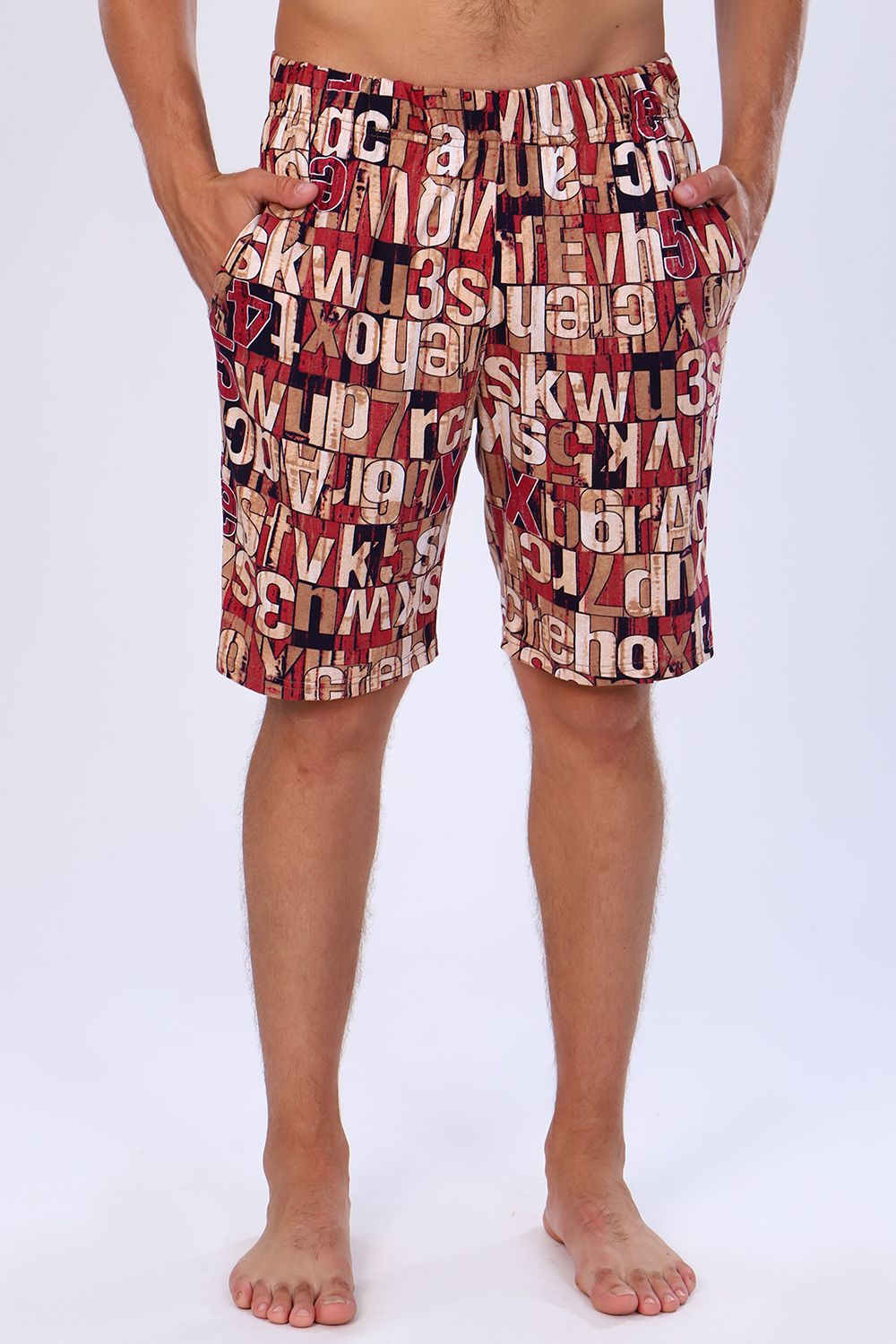 Мужские шорты чуть выше колена с боковыми карманами в шве на широкой резинке на талии. По ткани - рисунок в виде букв и цифр. Яркие стойкие расцветки моделей на любой вкус. Шорты выполнены из 100% хлопковой ткани, кулирки. Прекрасно носятся, как домашняя одежда, а также для повседневной уличной носки, для спорта, в дорогу, на дачу, на прогулку, в отпуск и т д. Шорты данной модели и футболка 71017 образуют прекрасный домашний, уличный, спортивный костюм / пижаму (продаются отдельно).