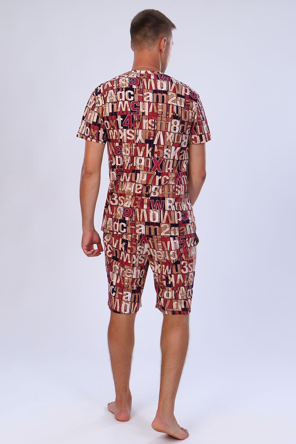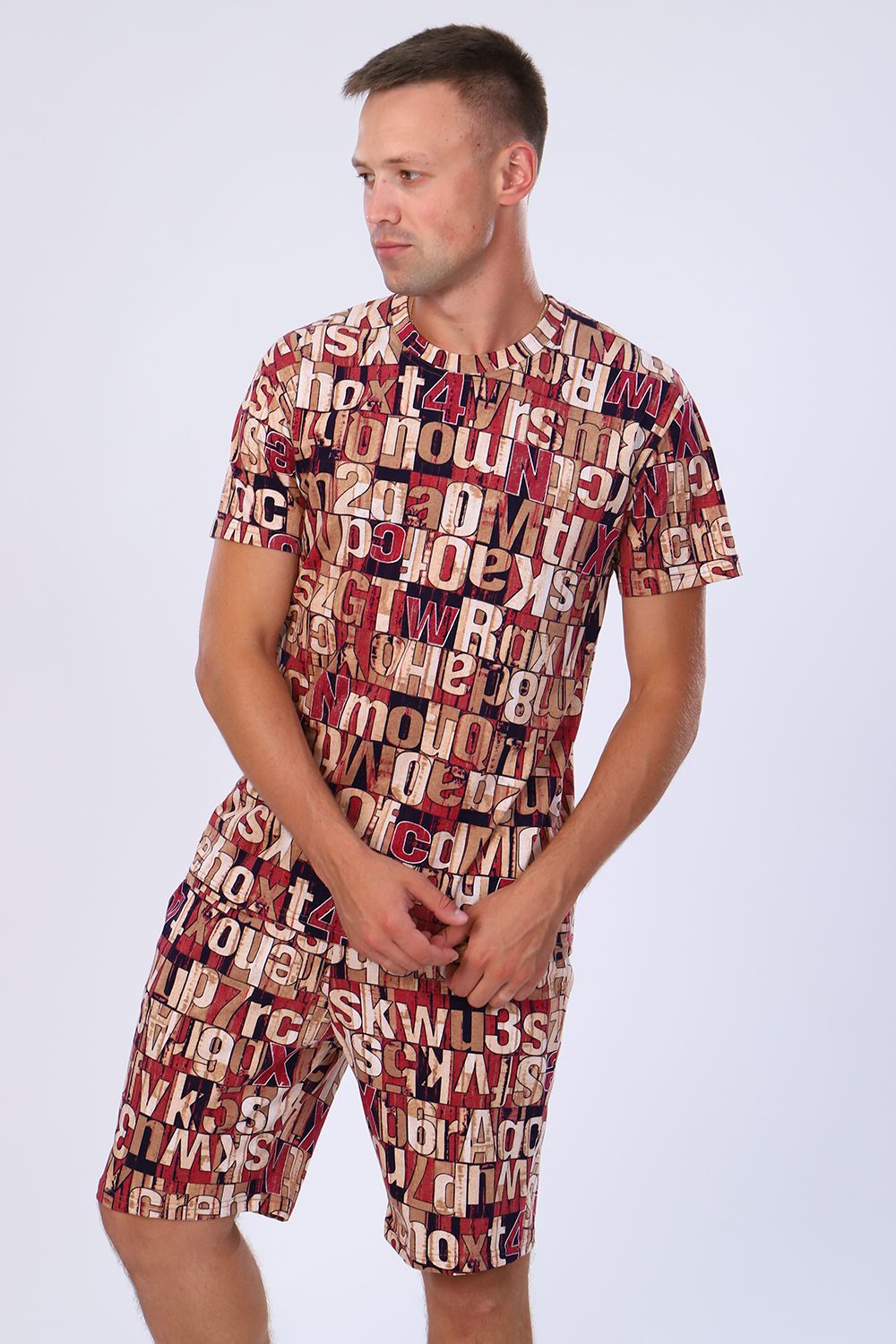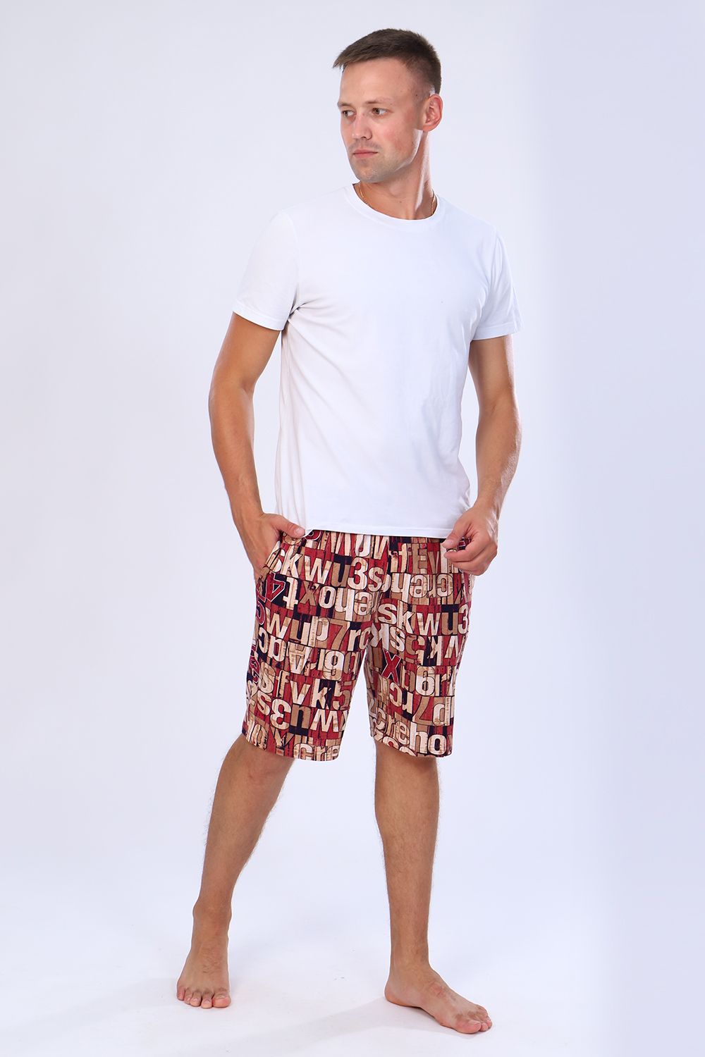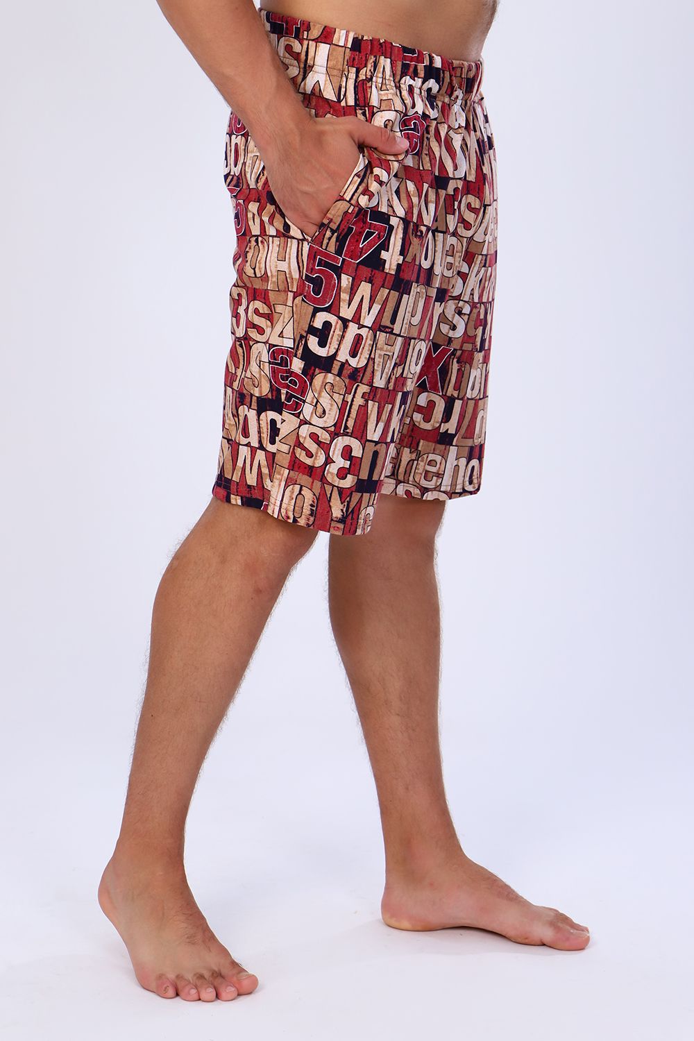 Мужские шорты чуть выше колена с боковыми карманами в шве на широкой резинке на талии. По ткани - рисунок в виде букв и цифр. Яркие стойкие расцветки моделей на любой вкус. Шорты выполнены из 100% хлопковой ткани, кулирки. Прекрасно носятся, как домашняя одежда, а также для повседневной уличной носки, для спорта, в дорогу, на дачу, на прогулку, в отпуск и т д. Шорты данной модели и футболка 71017 образуют прекрасный домашний, уличный, спортивный костюм / пижаму (продаются отдельно).