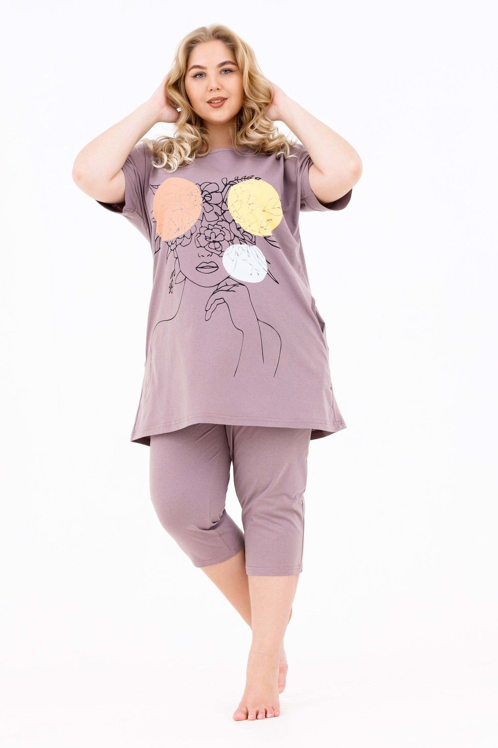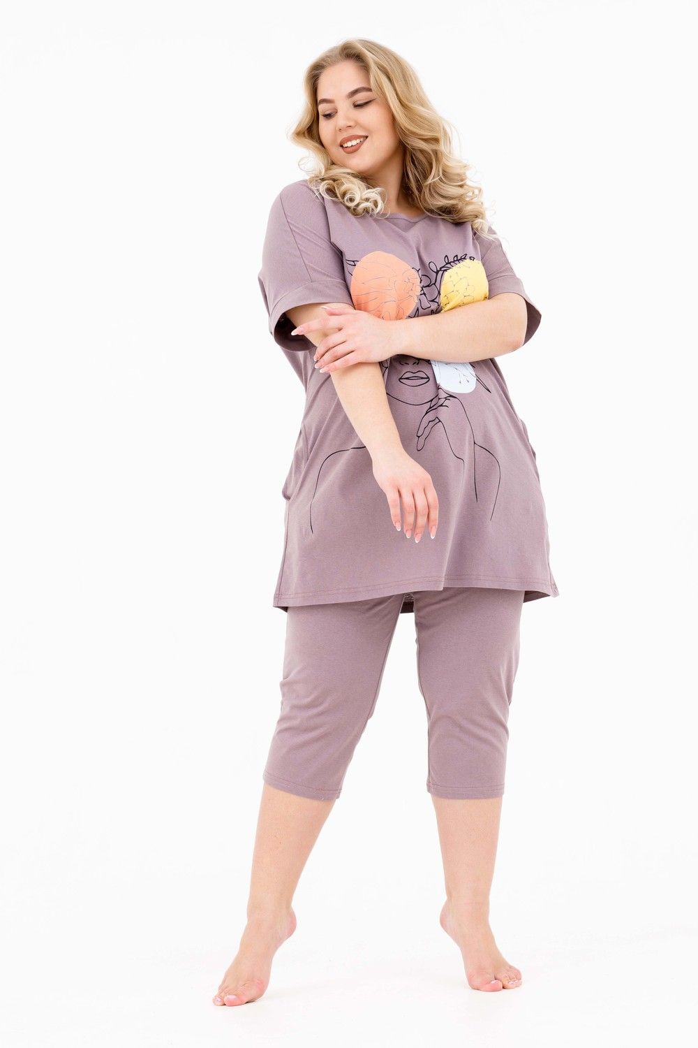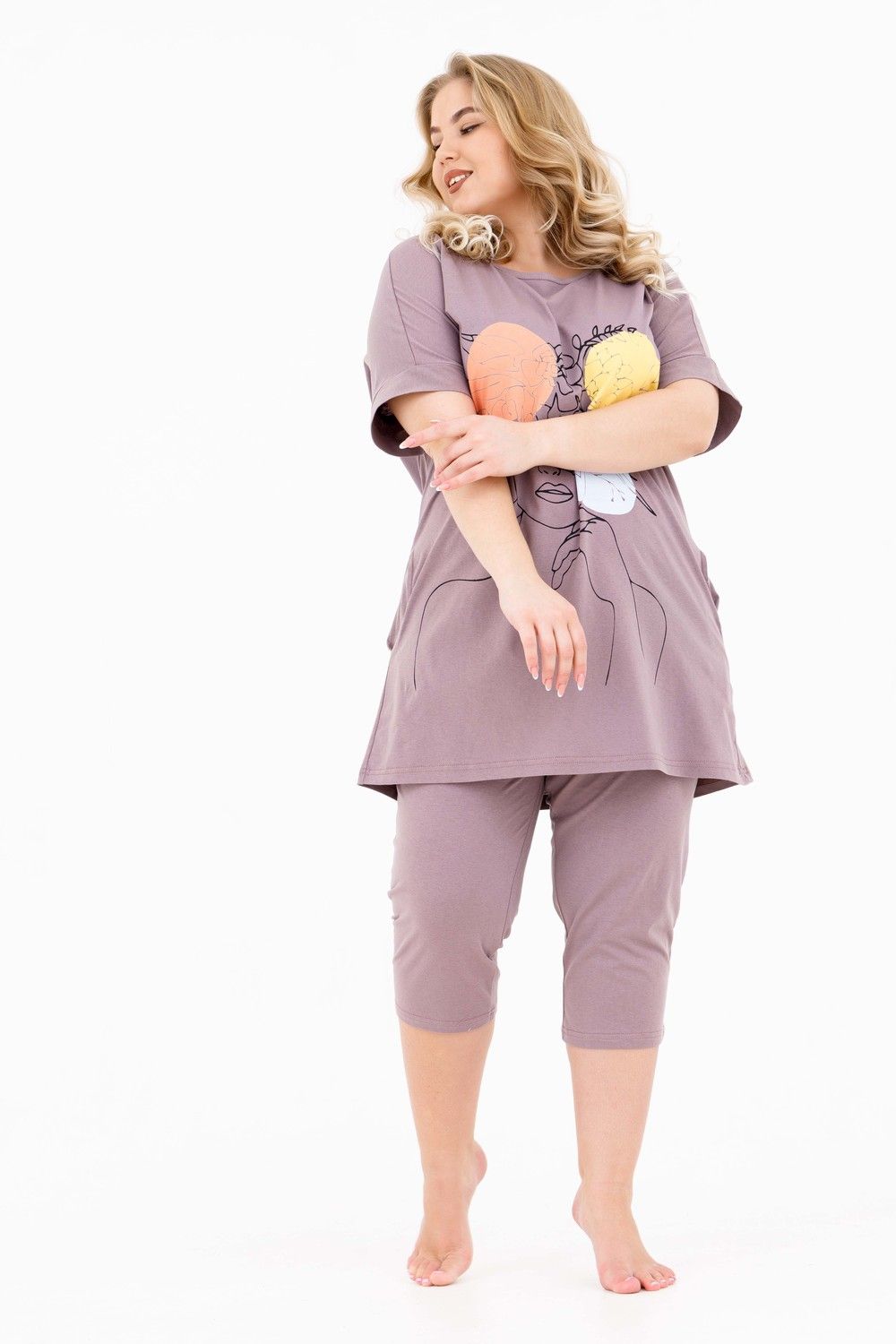 Хлопковый костюм с бриджами от бренда MODALINA состоит из: туники полуприлегающего силуэта с коротким рукавом и прорезными карманами, длина футболки - ниже бедер, горловина округлой формы, с ненавязчивым принтом. Бриджи классической длины с прорезными карманами, с широкой резинкой, которая не передавливает животик.