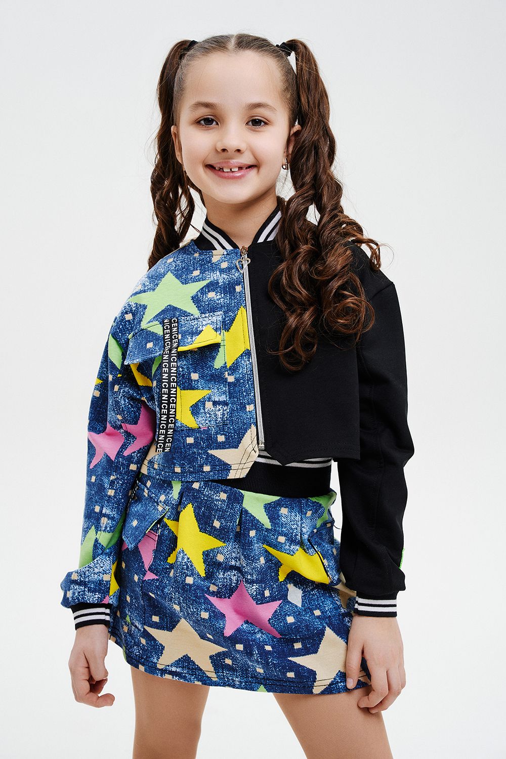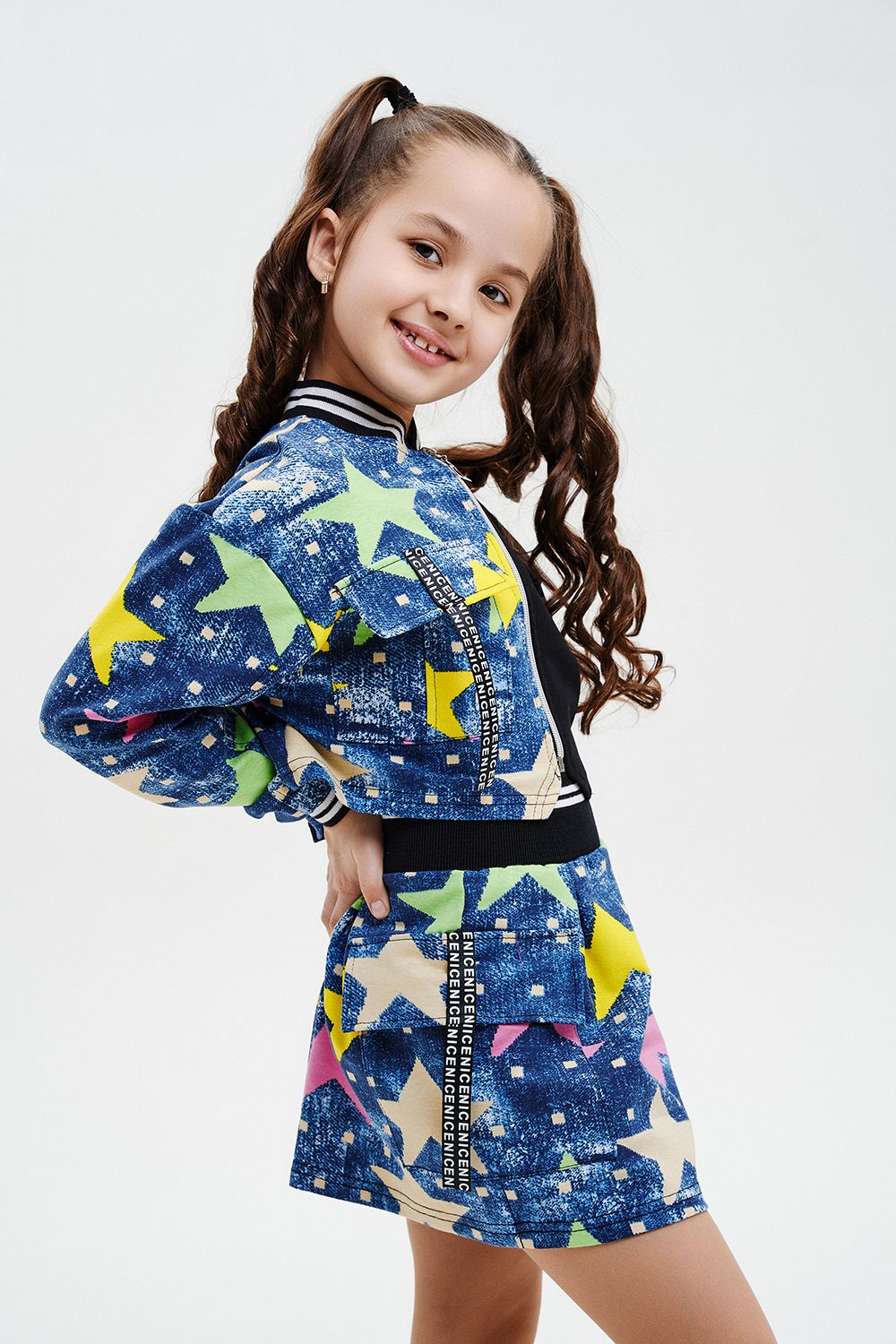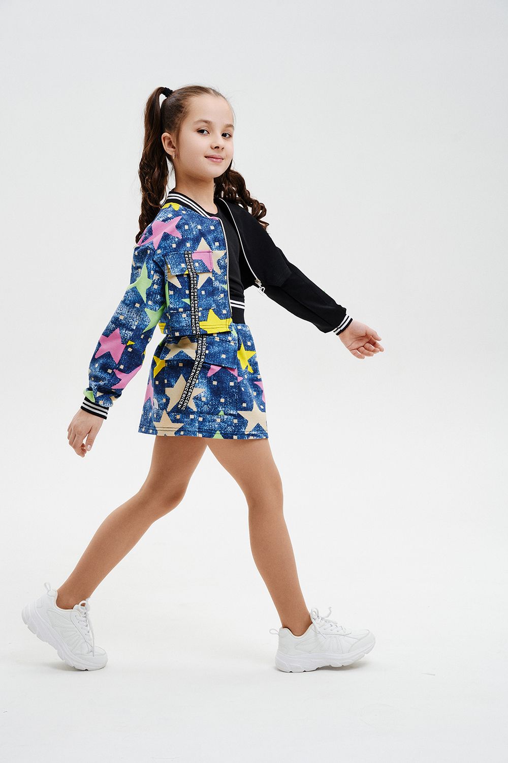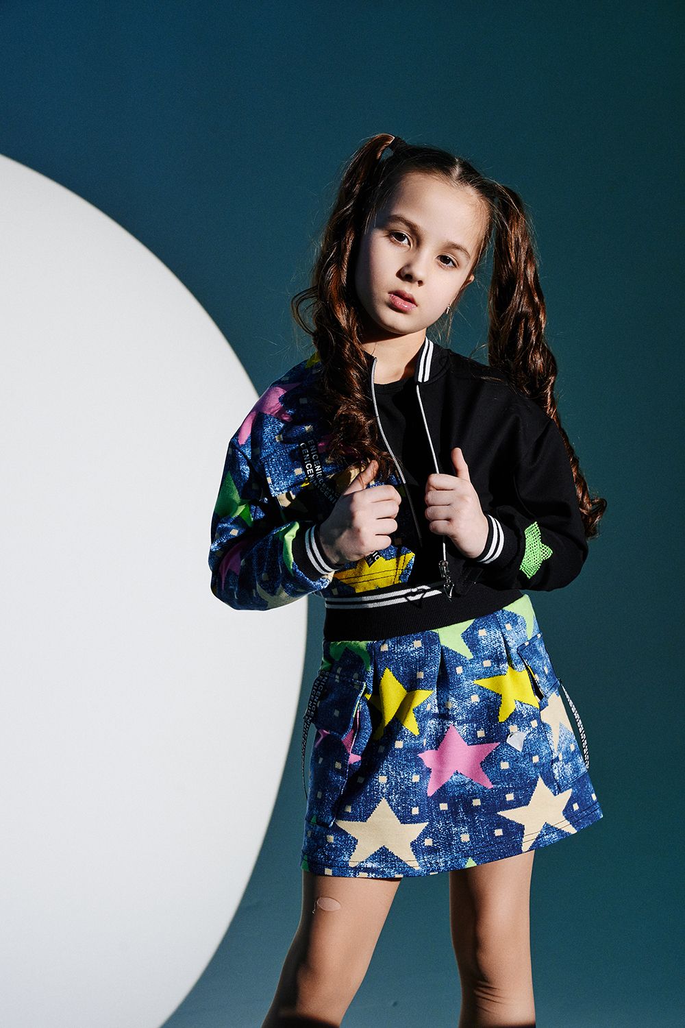 Костюм детский для девочек, состоит из укороченного бомбера с застежкой на молнию и накладным нагрудным кармашком с клапаном. Горловина и низ рукавов обработаны эластичной рибаной. Рукав бомбера оформлен ярким декором в форме звезды. Юбка свободного силуэта с широкой эластичной резинкой на поясе, с накладными боковыми карманами оформленными декоративными яркими звездами.
