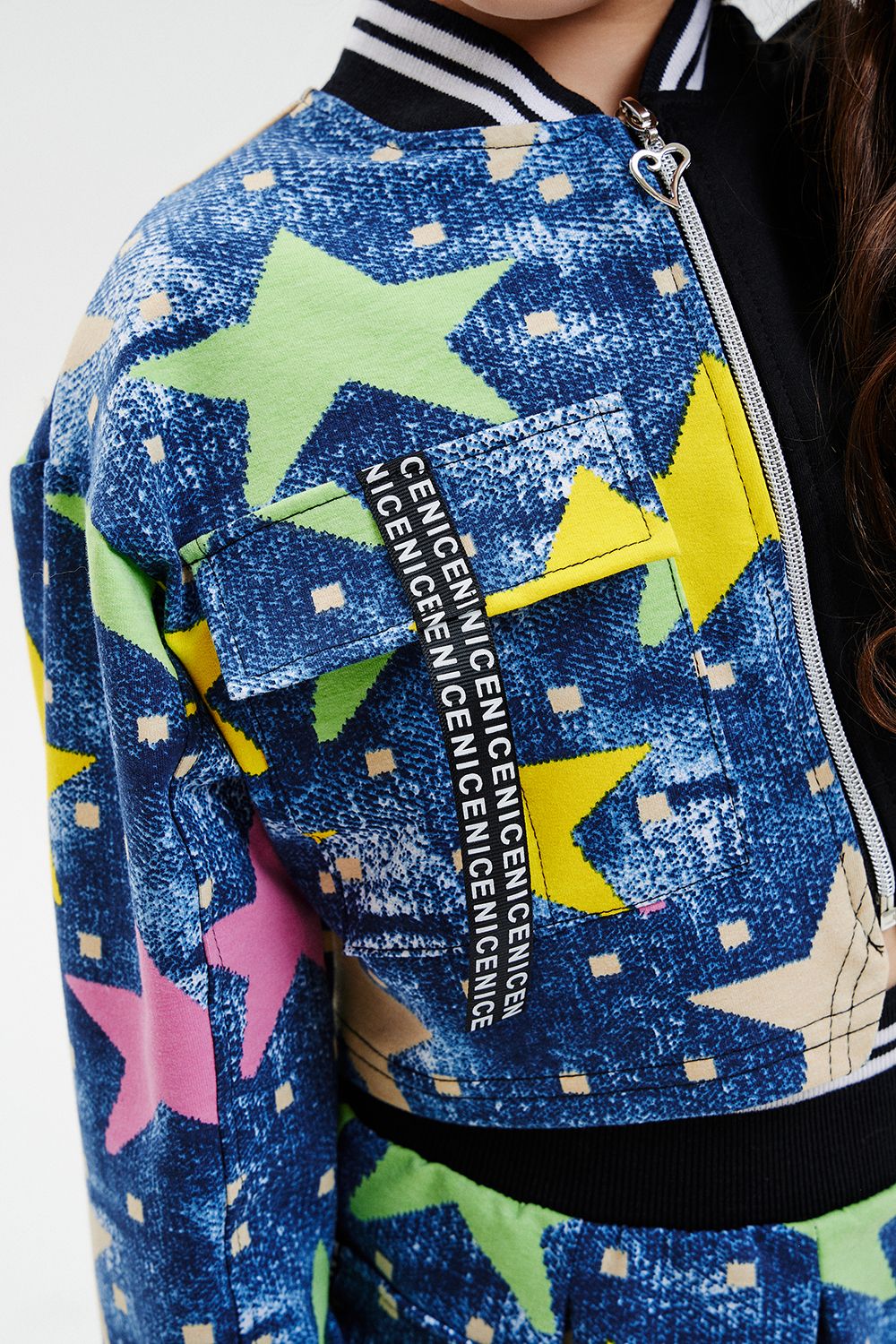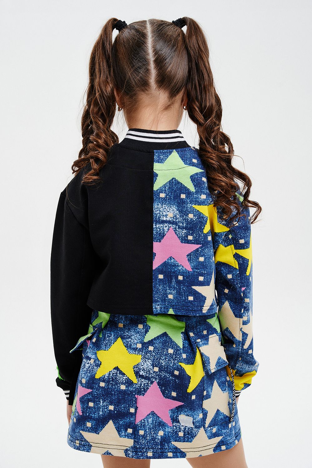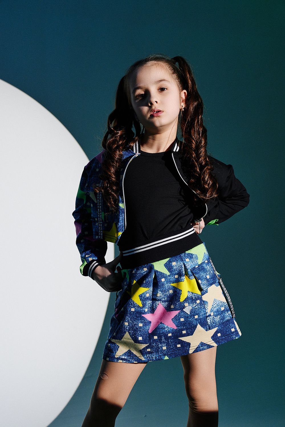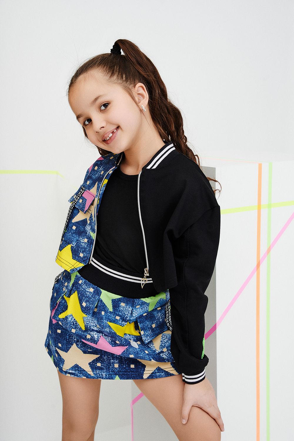 Костюм детский для девочек, состоит из укороченного бомбера с застежкой на молнию и накладным нагрудным кармашком с клапаном. Горловина и низ рукавов обработаны эластичной рибаной. Рукав бомбера оформлен ярким декором в форме звезды. Юбка свободного силуэта с широкой эластичной резинкой на поясе, с накладными боковыми карманами оформленными декоративными яркими звездами.