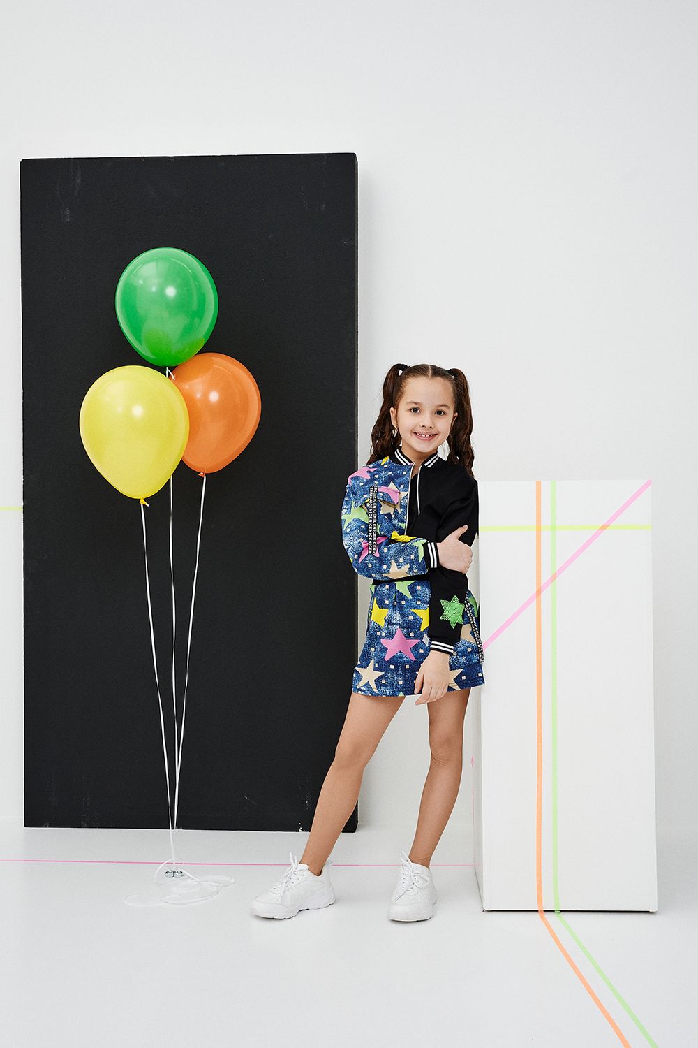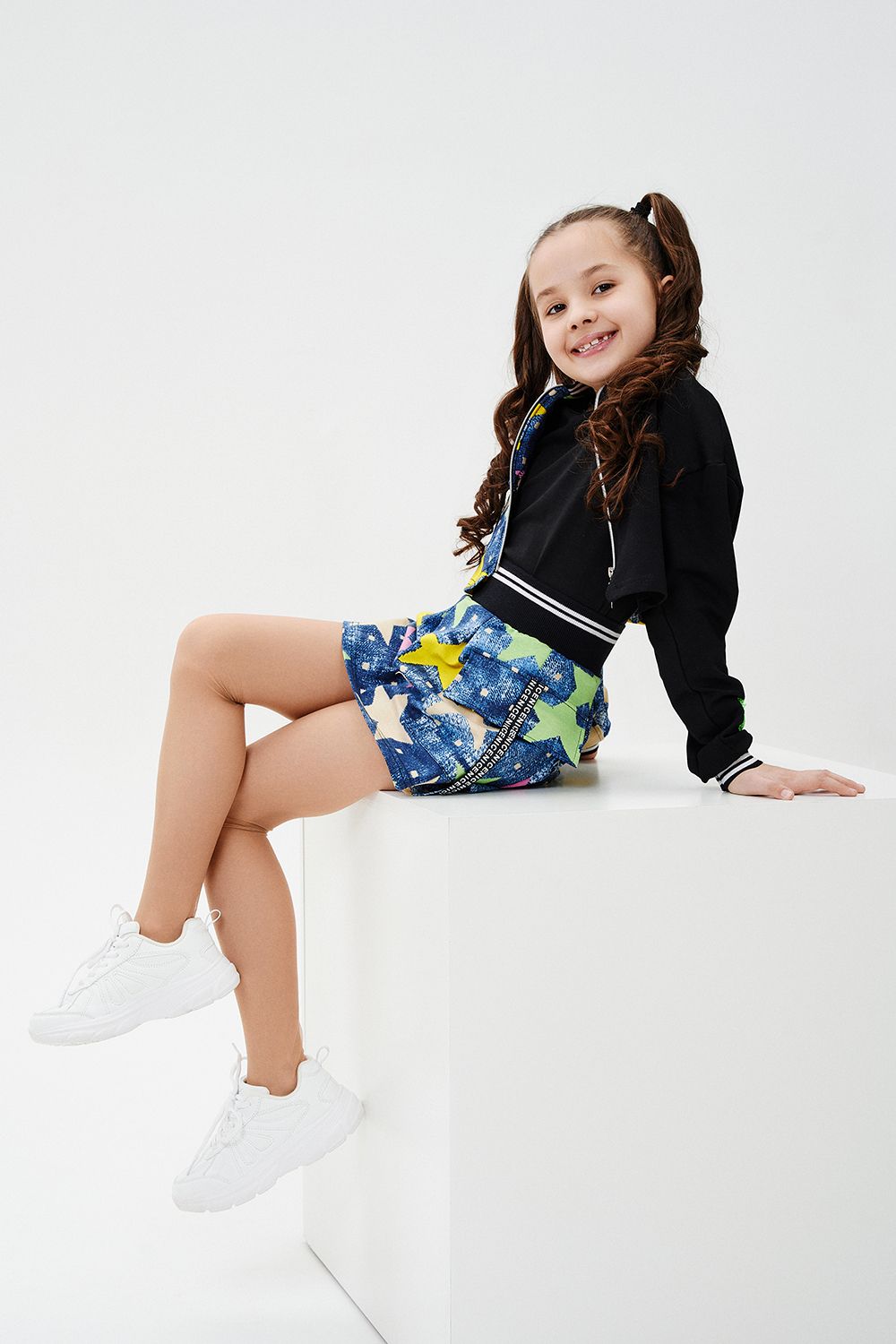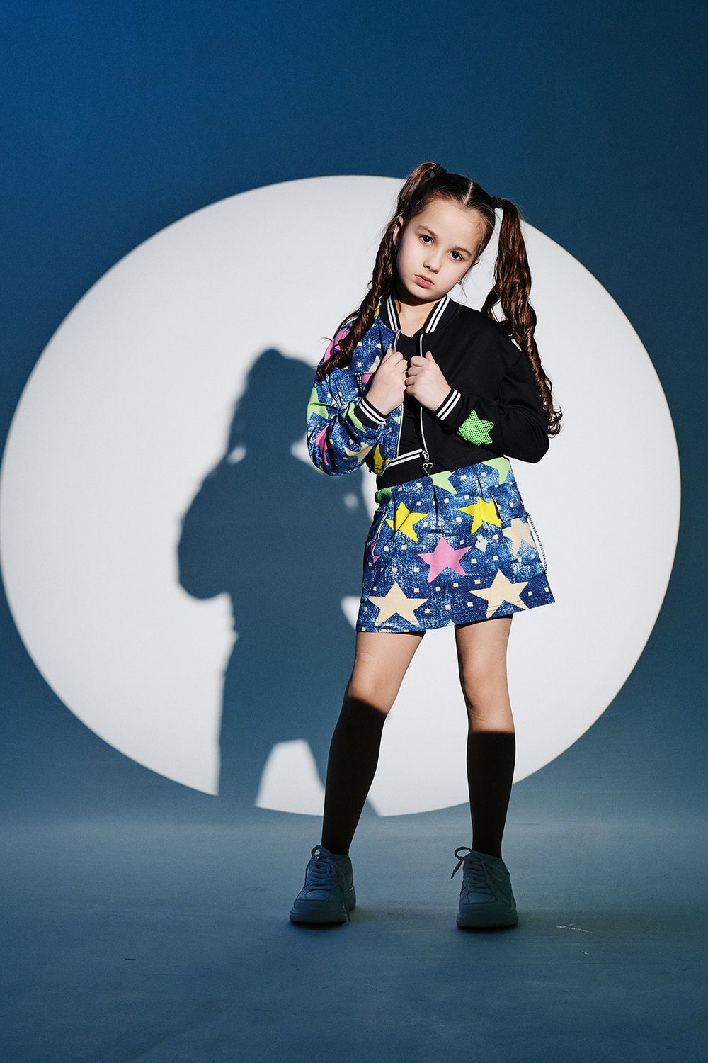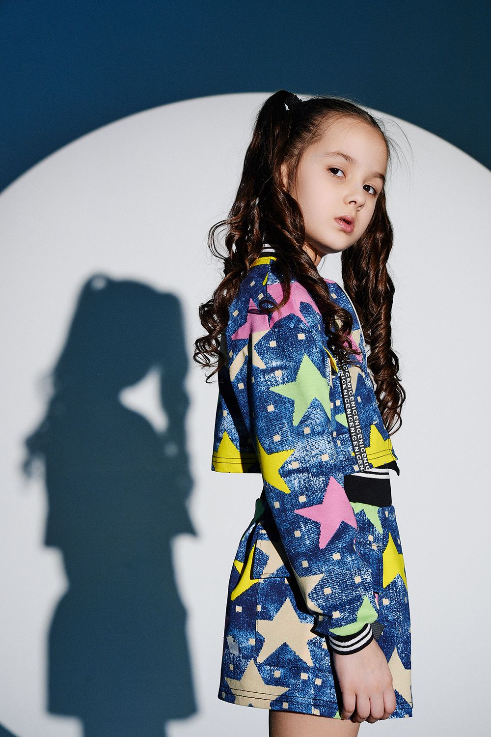Костюм детский для девочек, состоит из укороченного бомбера с застежкой на молнию и накладным нагрудным кармашком с клапаном. Горловина и низ рукавов обработаны эластичной рибаной. Рукав бомбера оформлен ярким декором в форме звезды. Юбка свободного силуэта с широкой эластичной резинкой на поясе, с накладными боковыми карманами оформленными декоративными яркими звездами.