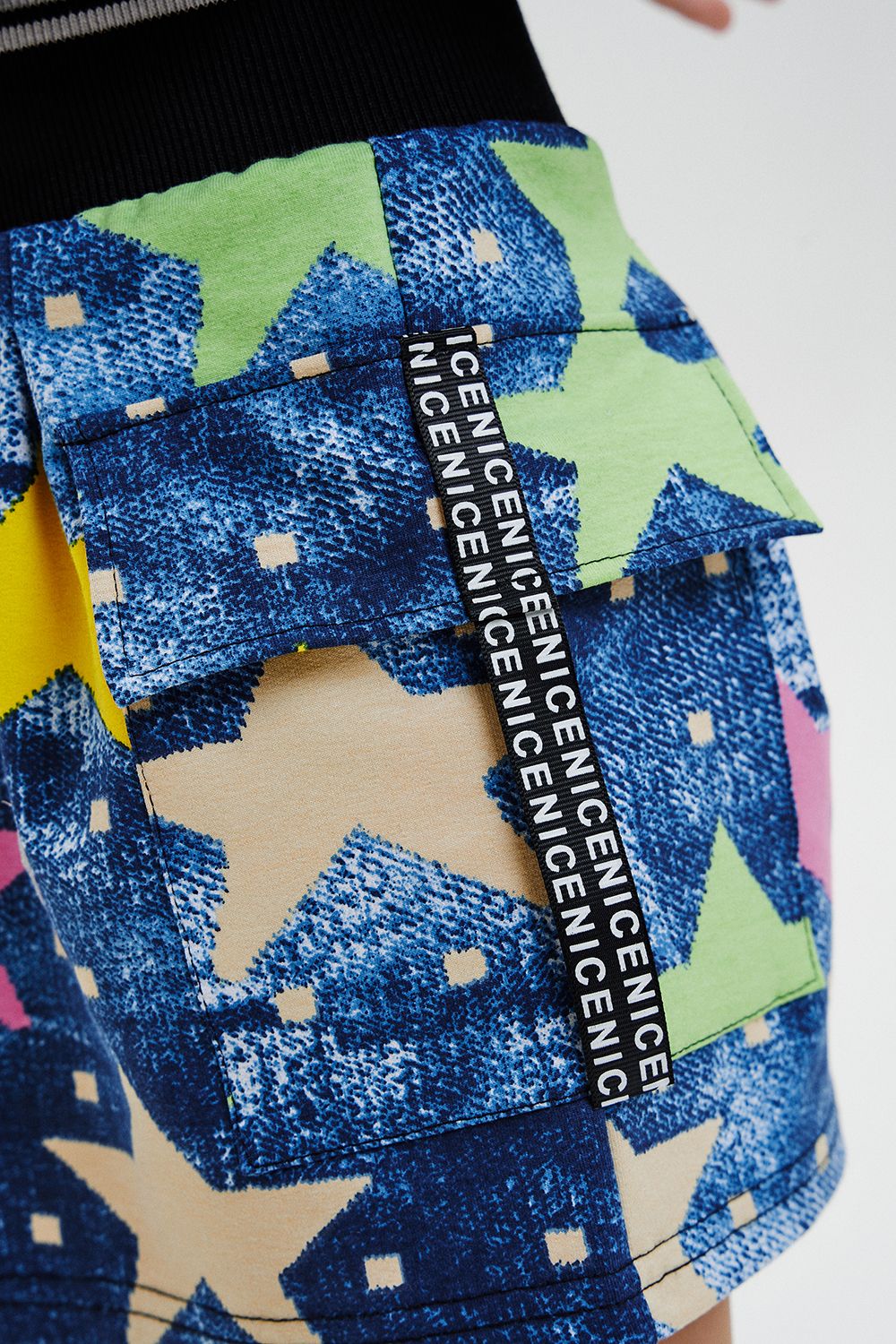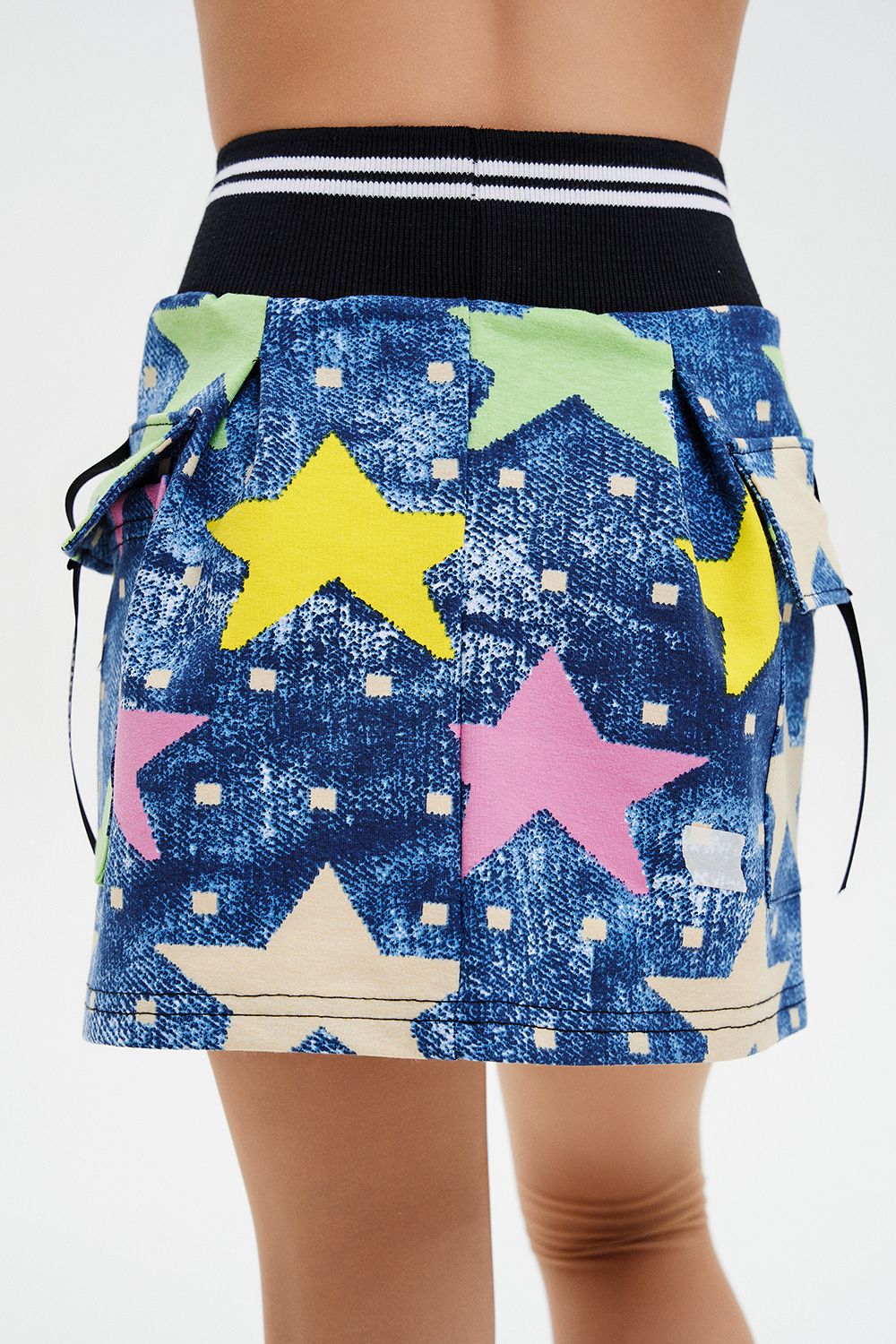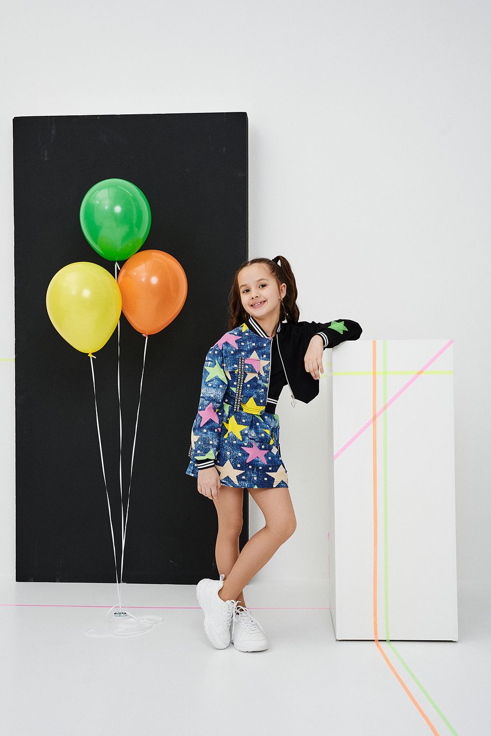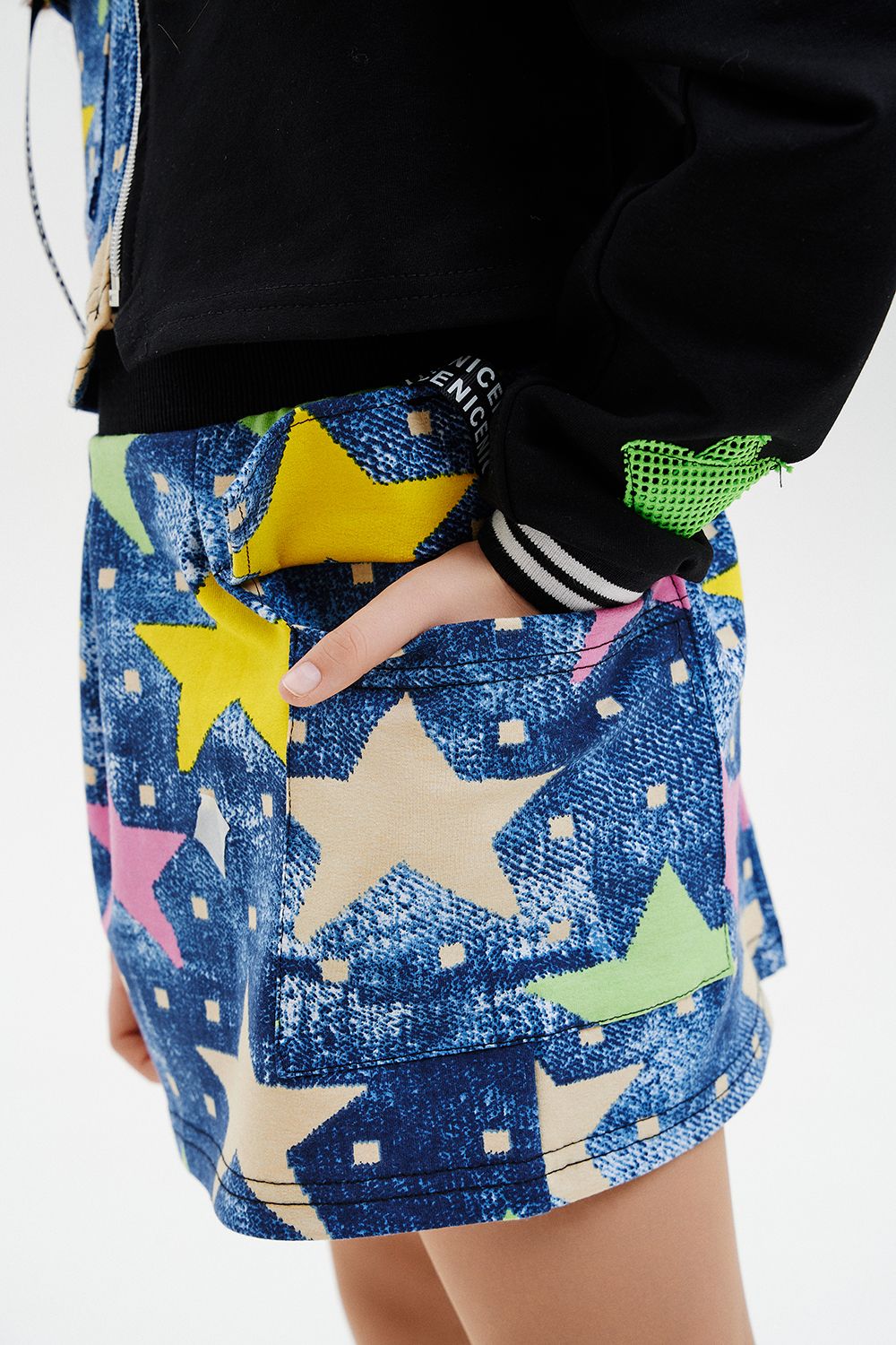 Костюм детский для девочек, состоит из укороченного бомбера с застежкой на молнию и накладным нагрудным кармашком с клапаном. Горловина и низ рукавов обработаны эластичной рибаной. Рукав бомбера оформлен ярким декором в форме звезды. Юбка свободного силуэта с широкой эластичной резинкой на поясе, с накладными боковыми карманами оформленными декоративными яркими звездами.
