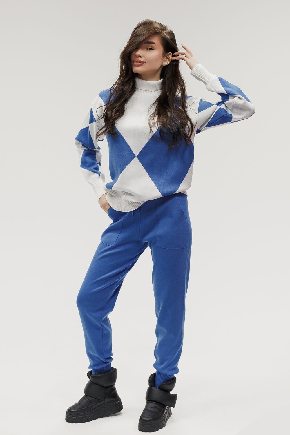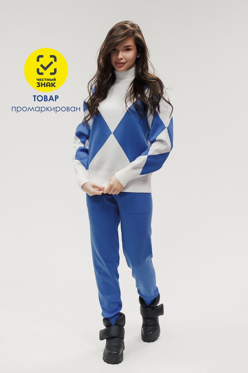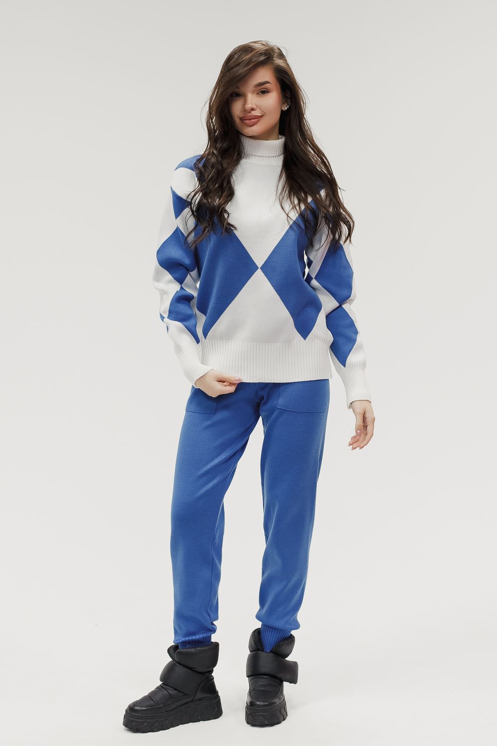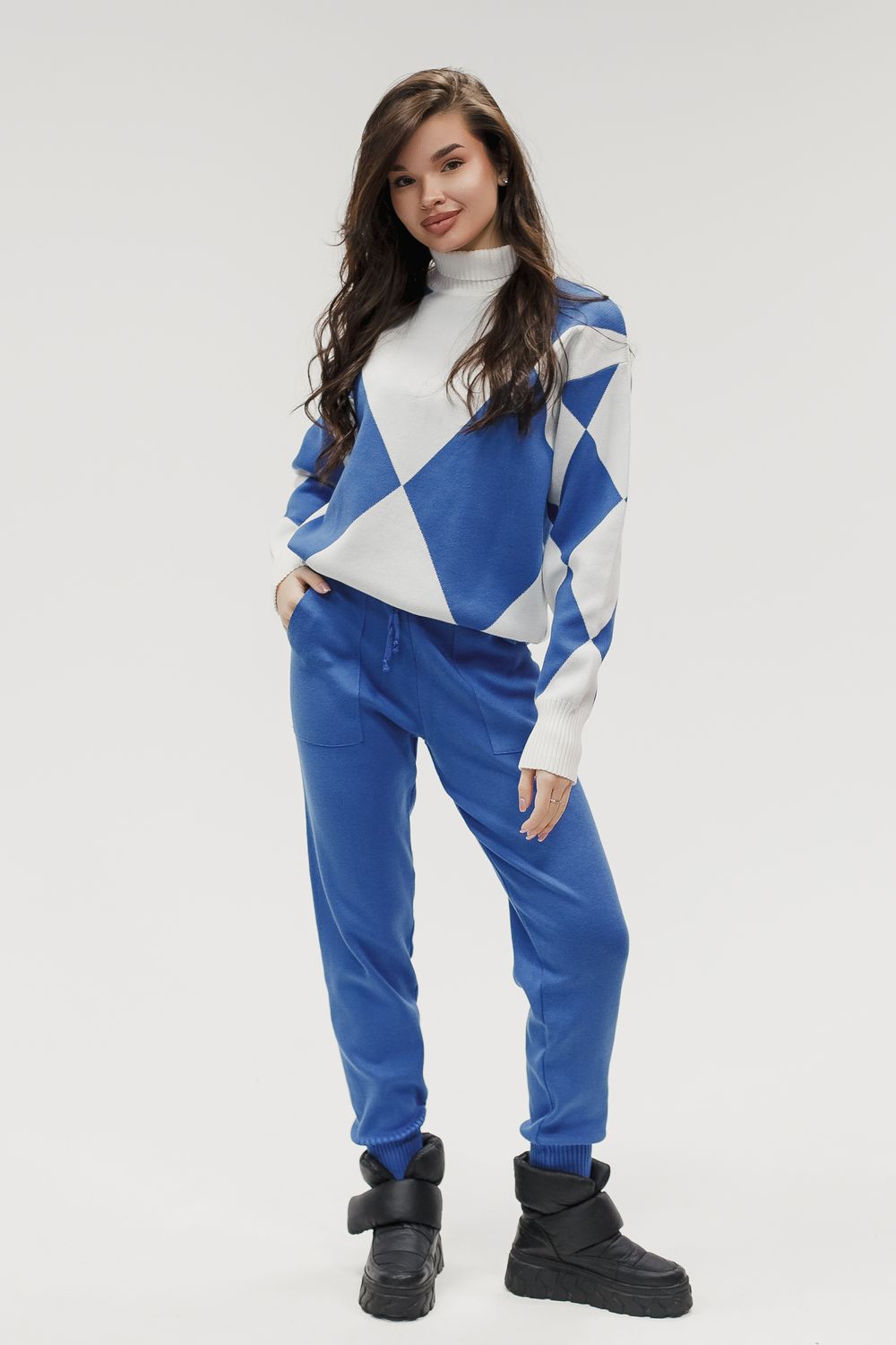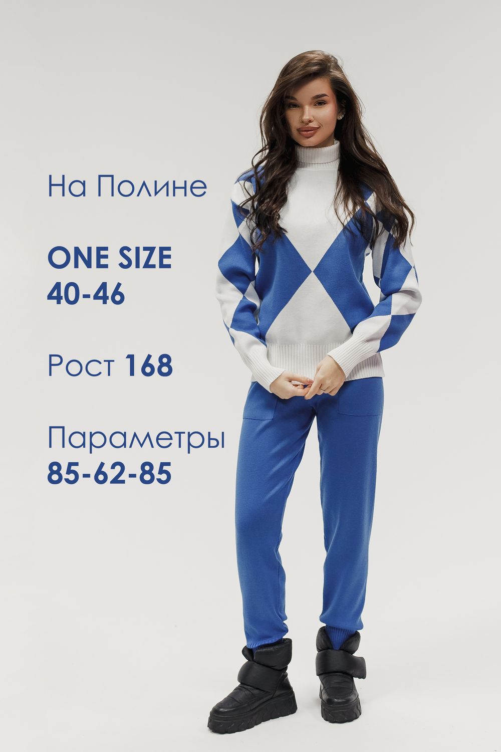 Этот тёплый женский вязаный костюм — гармоничный комплект из свитера и брюк, выполненный из плотной, мягкой и эластичной пряжи (состав: 30% хлопок, 40% вискоза, 30% полиэстер), который надёжно сохраняет тепло и при этом приятно прилегает к телу. Свитер свободногос аккуратной воротниковой стойкой средней высоты визуально стройнит и обеспечивает дополнительную защиту от холода, манжеты и нижняя кромка обработаны резинкой для лучшей посадки и сохранения формы. Плечи оформлены со скосом или лёгким «полупритёком» для комфортной посадки на фигуры разных типов; брюки средней посадки с эластичным поясом и внутренней мягкой тесьмой или шнурком обеспечивают индивидуальную регулировку, прямой или слегка зауженный книзу силуэт свободно сидит по бедру и книзу, благодаря эластичности материала изделие «тянется» и адаптируется под параметры от 40 до 46 размера и комфортно смотрится на росте до 160 см, при этом посадка и длина оптимизированы под невысокий рост — брюки не требуют сильной подшивки, а длина пуловера рассчитана так, чтобы сочетаться с верхней одеждой; в дизайне предусмотрены функциональные детали: скрытые боковые или накладные карманы в брюках, аккуратные декоративные швы или узорная вязка на передней части пуловера, что добавляет текстуре и визуального интереса, при этом декоративность не мешает повседневному использованию; палитра — нейтральные базовые оттенки (беж, серый, графит, тёмно-синий) и несколько насыщенных цветовых акцентов (бордо, изумруд, горчичный), которые легко сочетаются с верхней одеждой и аксессуарами; материал и плотная вязка делают костюм универсальным для осенне-зимнего периода и прохладной весны — он отлично подойдёт как для прогулок и поездок, так и для уютных домашних вечеров или неофициальных встреч; уход: рекомендована деликатная стирка руками или в машине на щадящем режиме при температуре не выше 30°C, сушить в расправленном виде на горизонтальной поверхности, не отбеливать, при необходимости возможна бережная химчистка; благодаря продуманной посадке и использованию качественной пряжи комплект сохраняет форму и внешний вид даже при регулярной носке, подчёркивает женственность без лишней вычурности и станет практичным элементом гардероба тех, кто ценит комфорт, тепло и стиль.