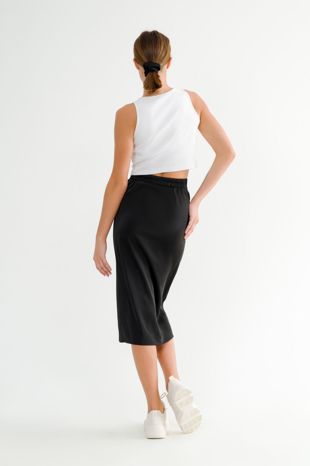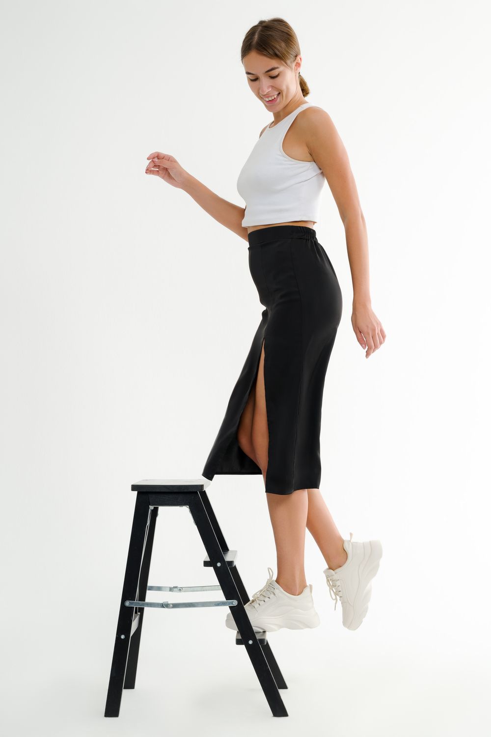 Красивую обтягивающую черную юбку с разрезом можно носить с кроссовками, с туфлями-лодочками, с босоножками на каблуке или платформе, с сапогами или ботфортами. Так же юбка отлично подойдет в качестве школьной формы для девушки подростка или для беременных женщин на ранних сроках.