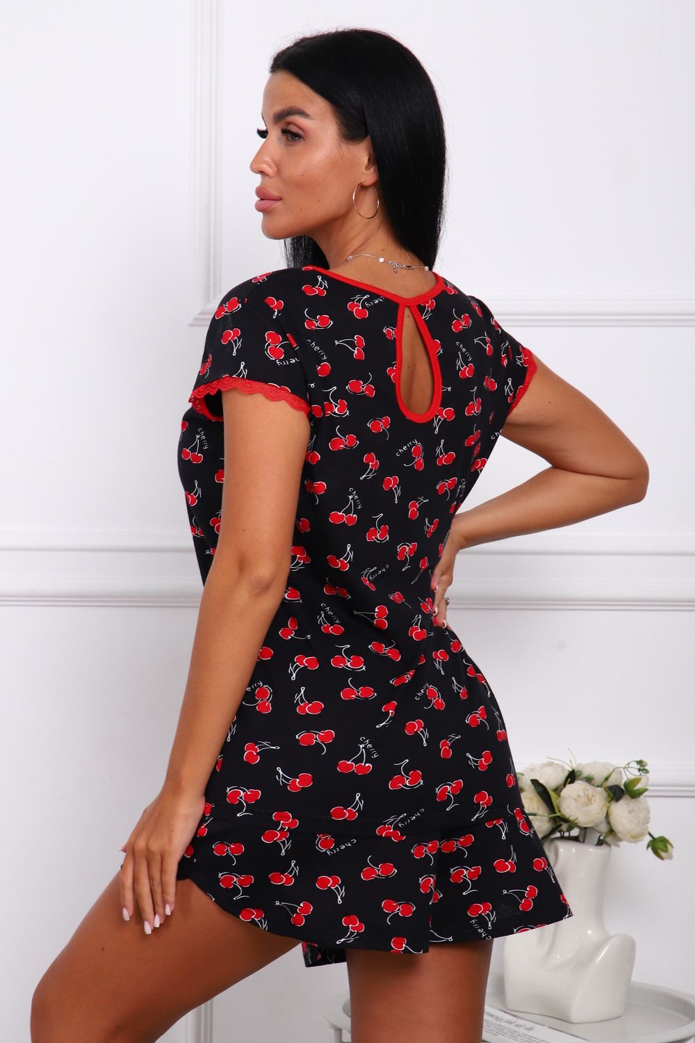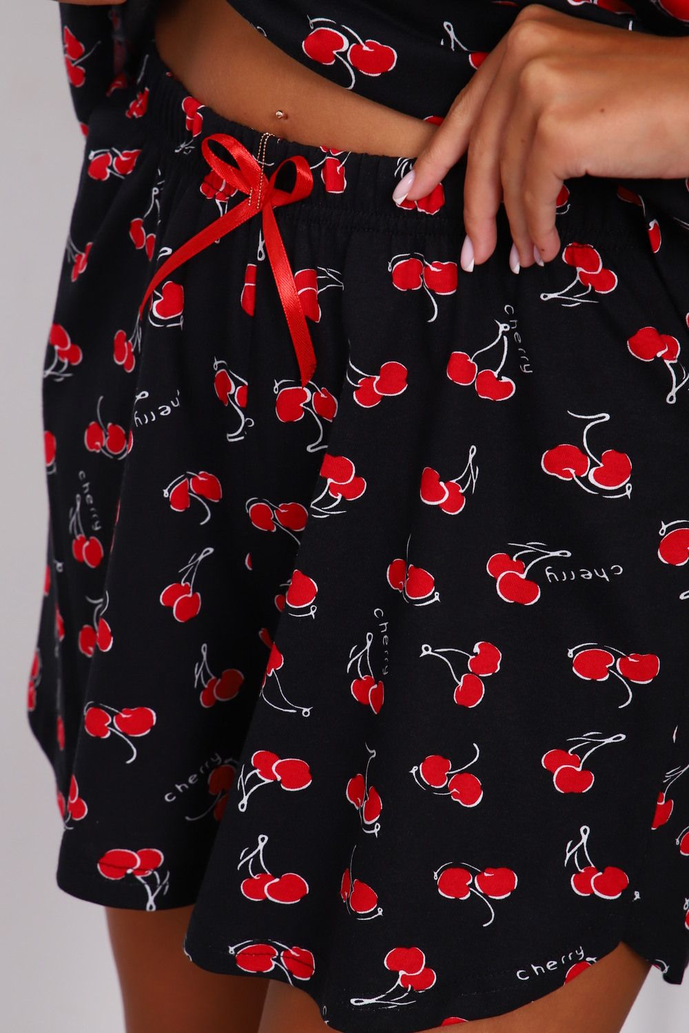 Пижама женская выполнена из набивного трикотажного полотна кулирка. Пижама состоит из футболки и шорт.