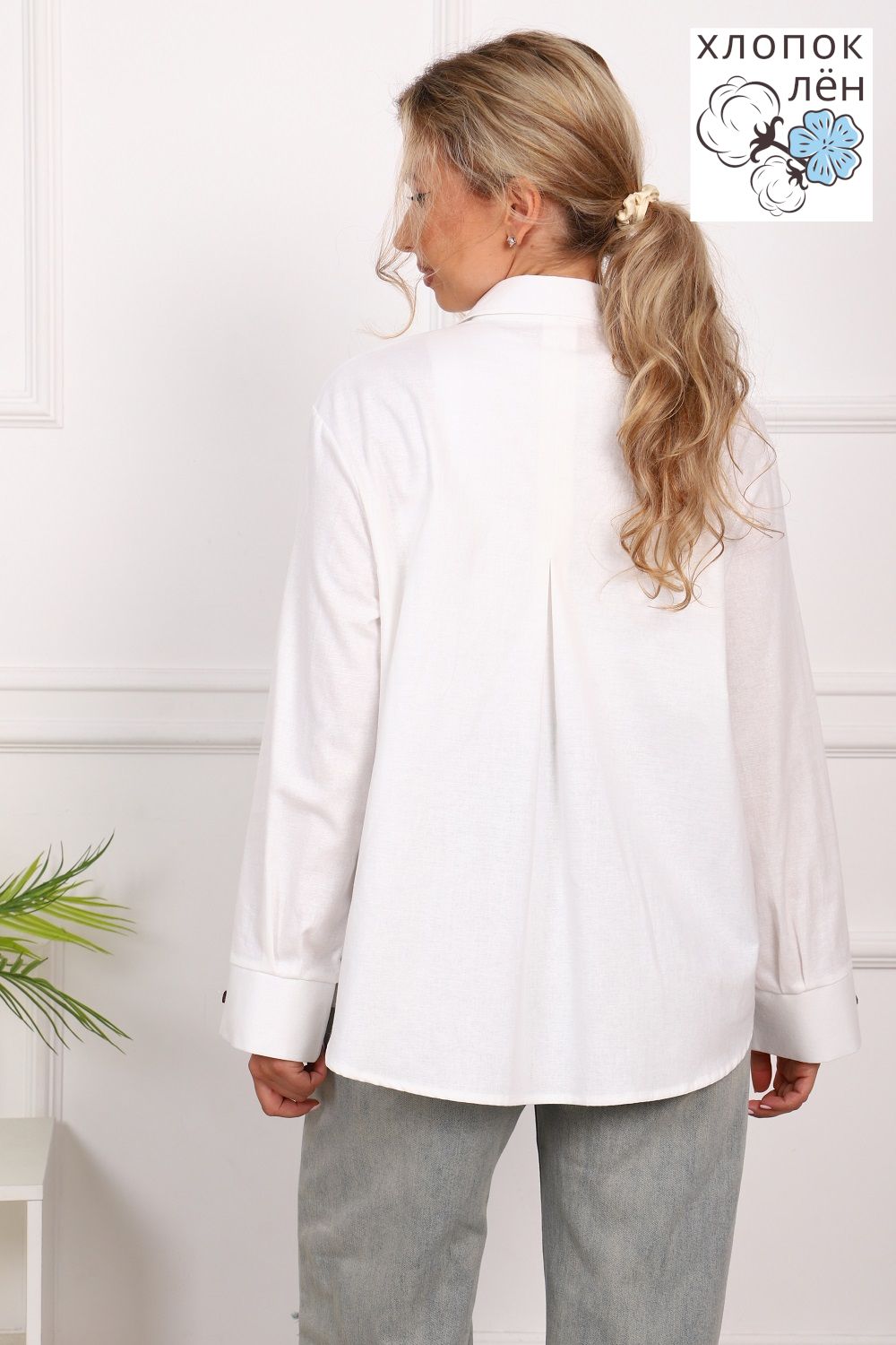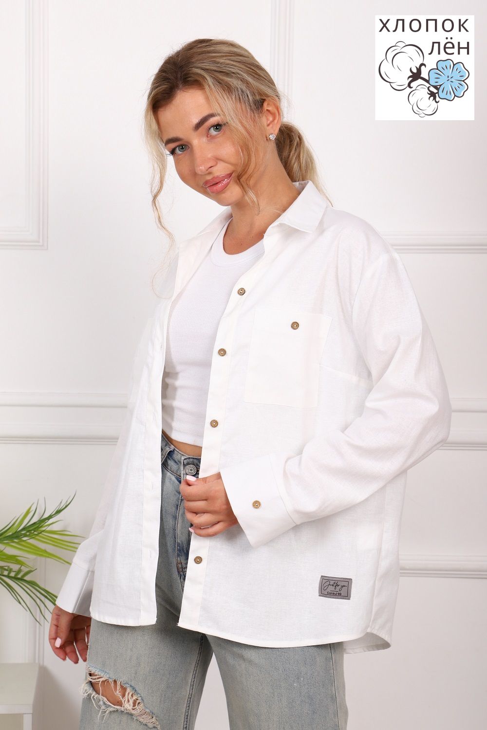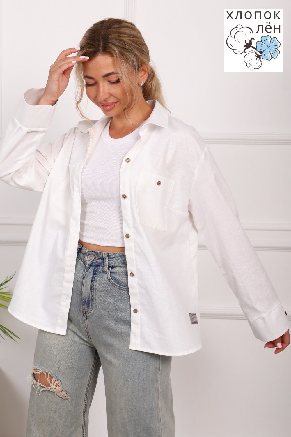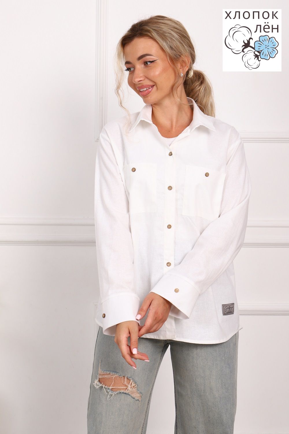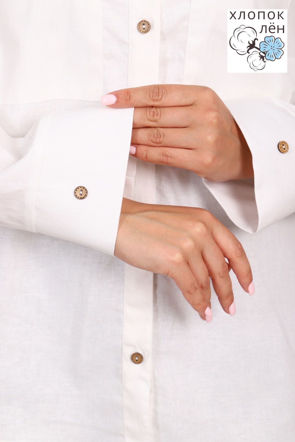 Рубашка женская офисная, свободного силуэта, длинный рукав. Из 100% натуральной ткани (хлопок 70% и лён 30%). Рубашка очень комфортная: рукава не сковывают движения; удобная длина, прикрывающая зону бедер; два нагрудных кармана, дышащая ткань. Трендовый силуэт и акцентные кокосовые пуговицы создают стиль этой рубашки. Сочетается и с денимом и с классической одеждой.