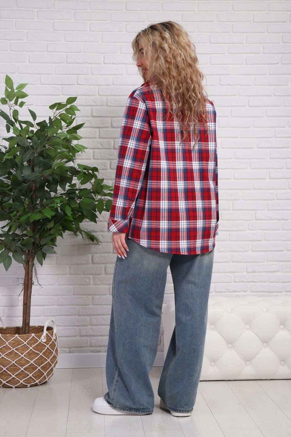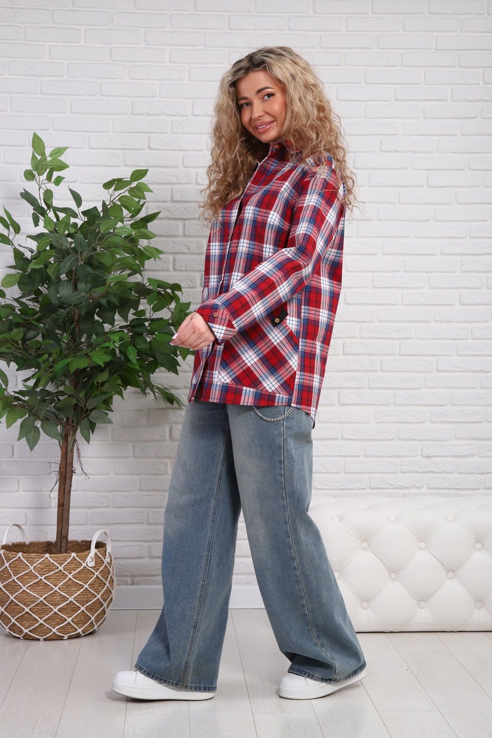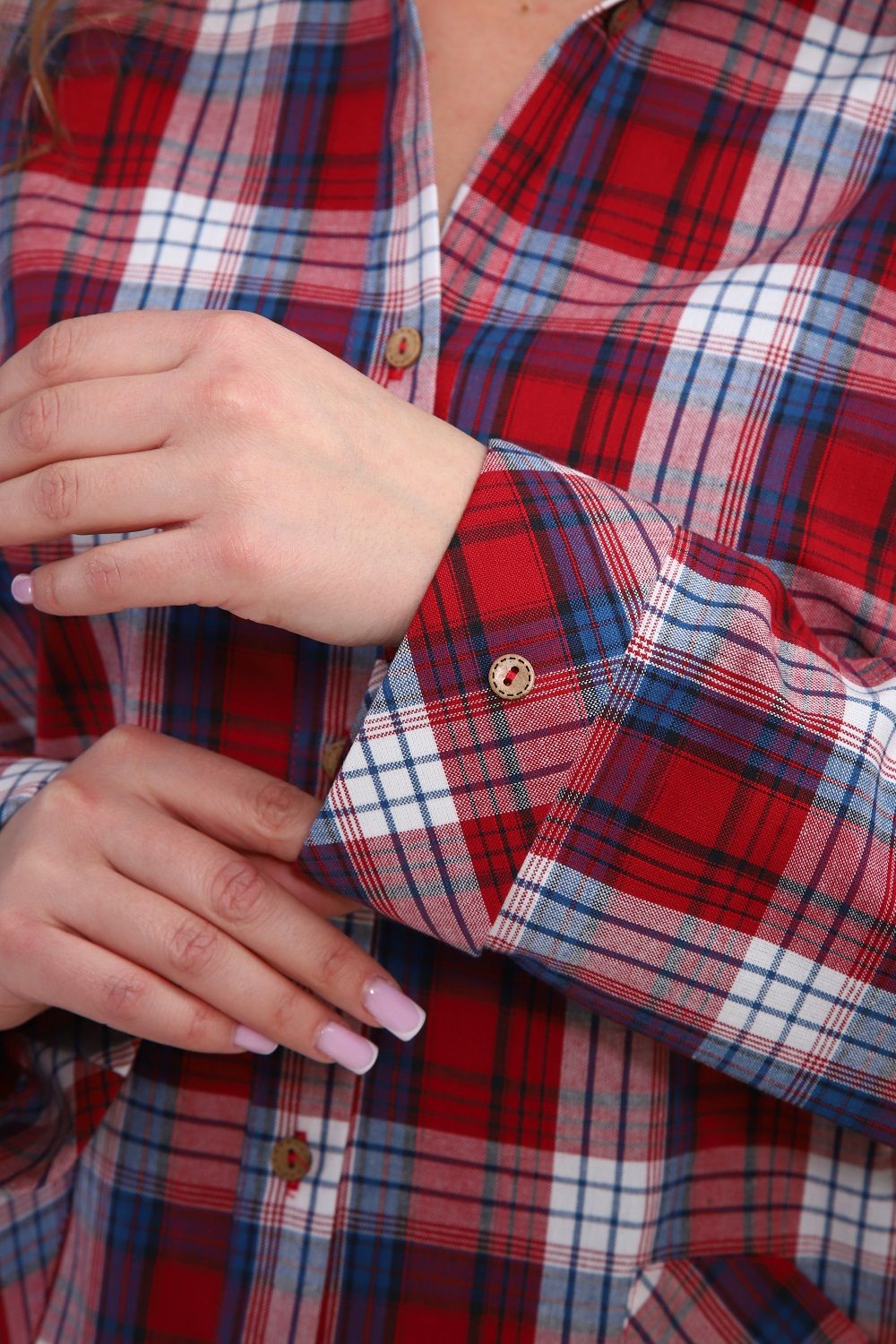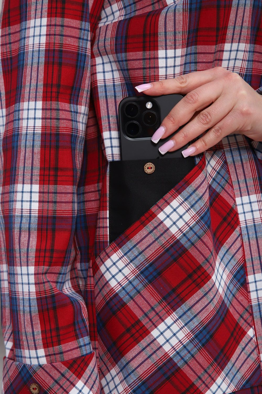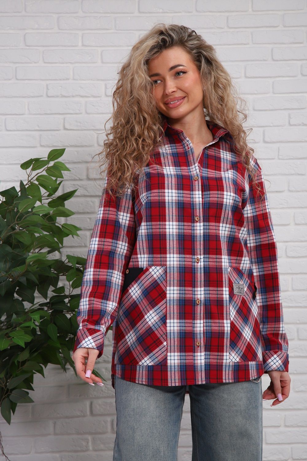 Женская рубашка с очень удобными карманами-кенгуру и специальным акцентным карманом для смартфона (пластиковых карт, ручек, очков и т.п.), один из карманов-кенгуру можно застегивать петелькой на пуговицу. Рукава с манжетом, который подгибается - благодаря этому длина рукава регулируется в пределах 5 см (можно сделать чуть короче, чуть длинне). Крой рубашки очень комфортный в ношении, не сковывает движений. Прямой силуэт стройнит. Ткань шотландка (относительно плотный материал, похожий на лён/полулен), 100% хлопок. Замечательный выбор для прогулок, для работы. Наверняка, станет Вашей любимой рубашкой.