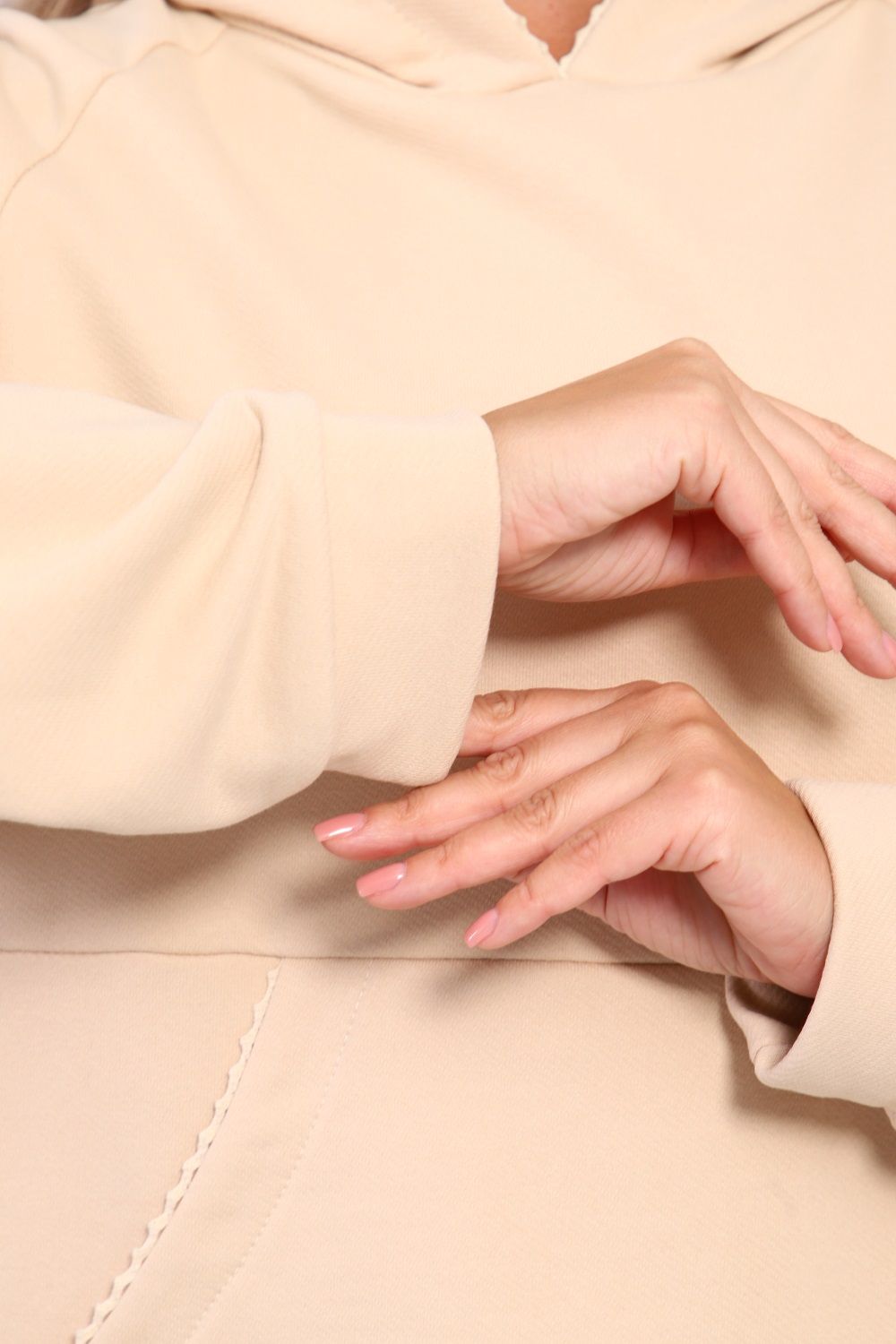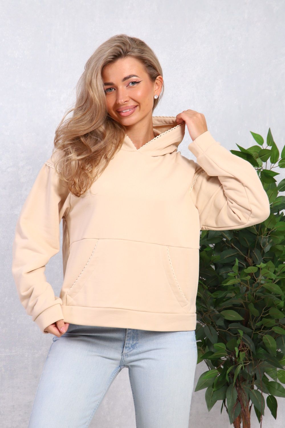 Женская толстовка с капюшоном, изюминка этой толстовки - стильный трендовый декор с винтажным мотивом - карманы, верх рукава и капюшон декорированы вязаным хлопковым кружевом. Универсальный комфортный крой обеспечивает удачную посадку на любой тип фигуры, капюшон обеспечит уют в прохладную погоду. Трикотаж премиального качества ("толстый" хлопок - петельчатый футер диагональ с 88% хлопка).