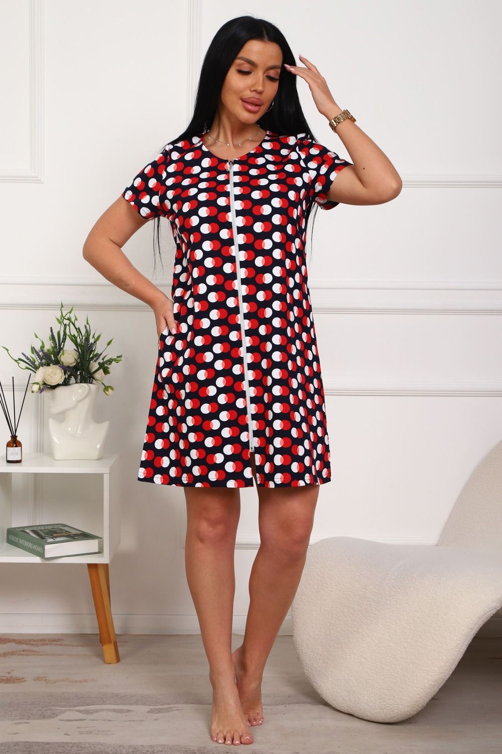 Халат молодежный из натурального, набивного, трикотажного полотна. Горловина круглая. Силуэт -расклешенный к низу. В боковых швах карманы. низ изделия прямой. рукав короткий. Застежка на тесьму молнию.