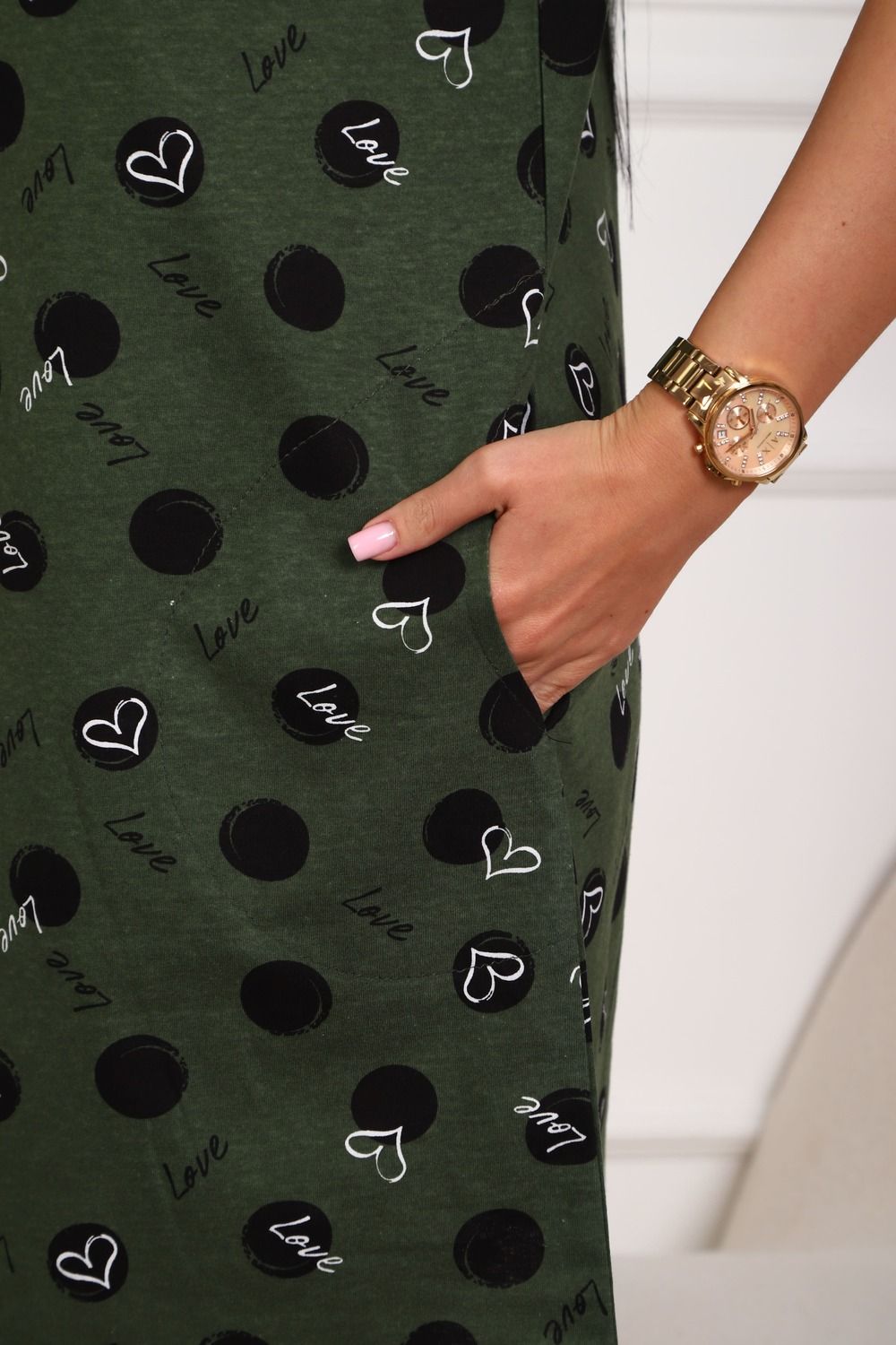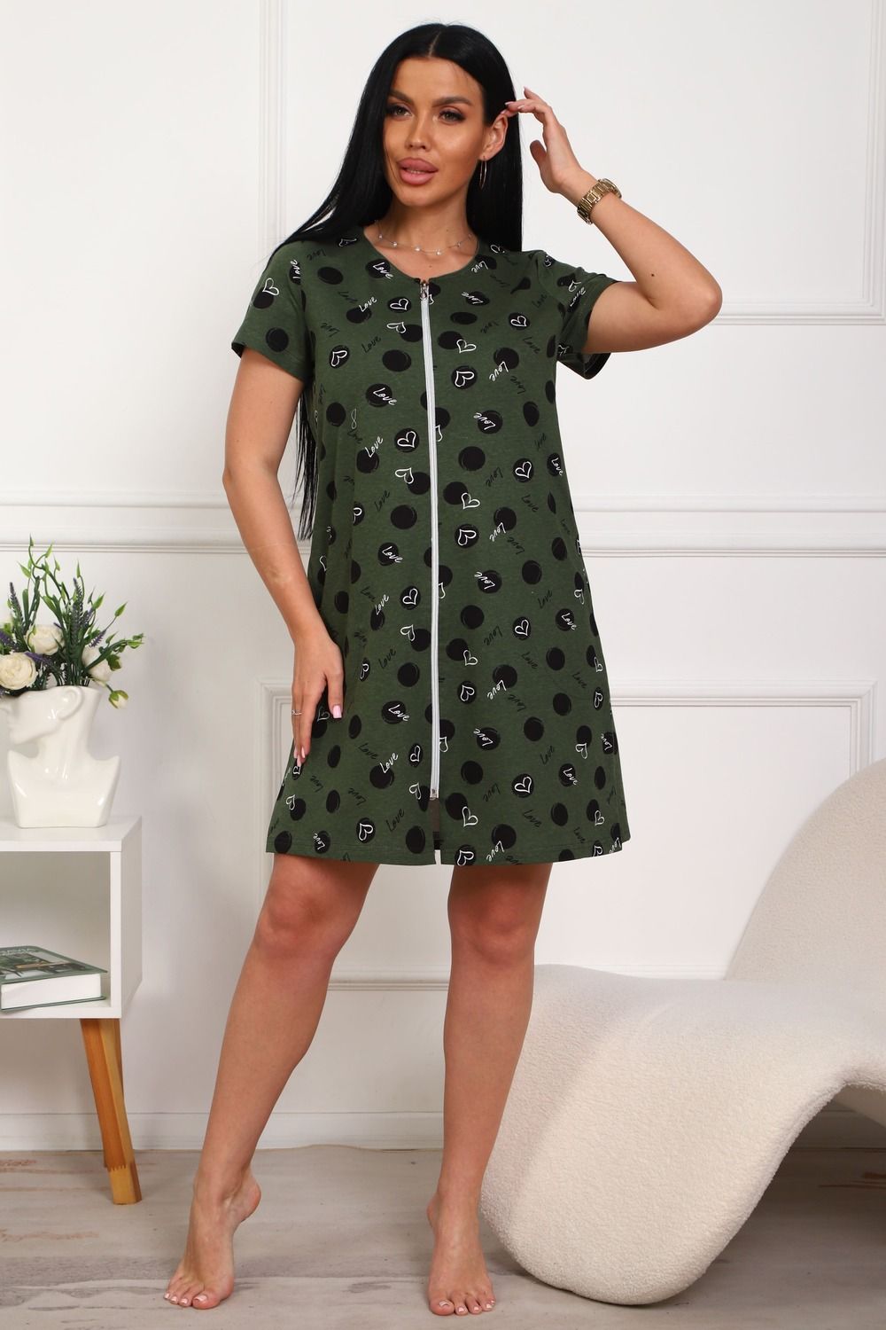 Халат молодежный из натурального, набивного, трикотажного полотна. Горловина круглая. Силуэт -расклешенный к низу. В боковых швах карманы. низ изделия прямой. рукав короткий. Застежка на тесьму молнию.