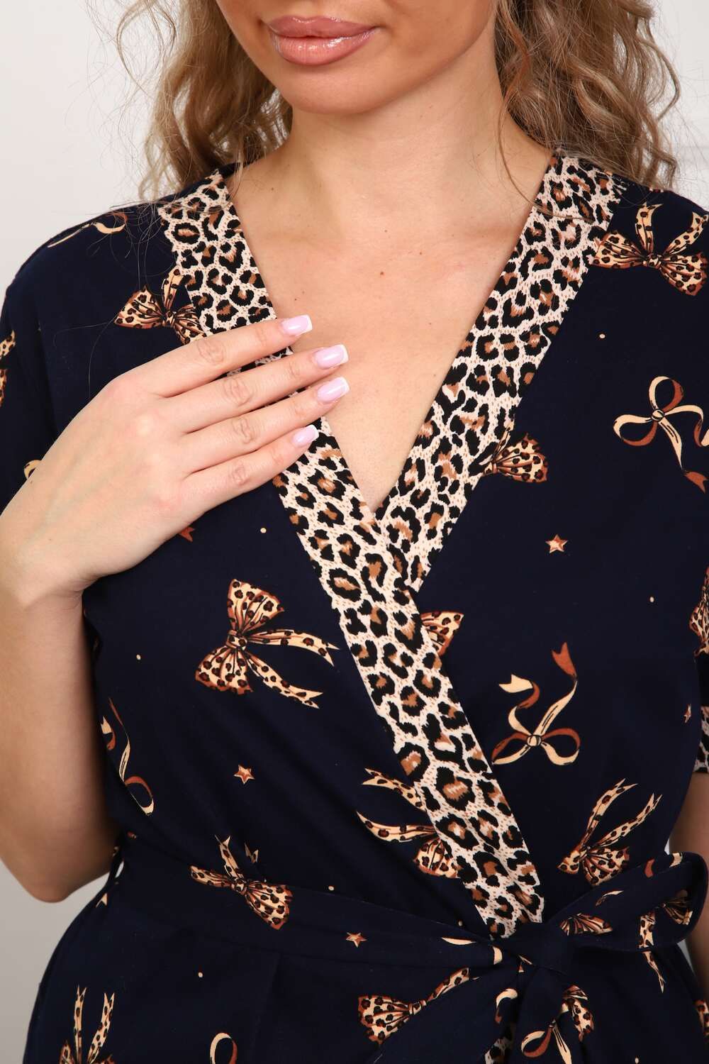 Комплект женский, из двух видов ткани, основной и компаньон, халат с сорочкой. Халат прямого силуэта, на запах. Рукав короткий. В боровых швах карманы, низ прямой. Сорочка на бретелях. Расклешённая к низу. Спинка гладкая. Перед с подрезом под грудью. Лиф с защипами по линии груди, и двумя декоративными пуговицами. Низ изделия прямой