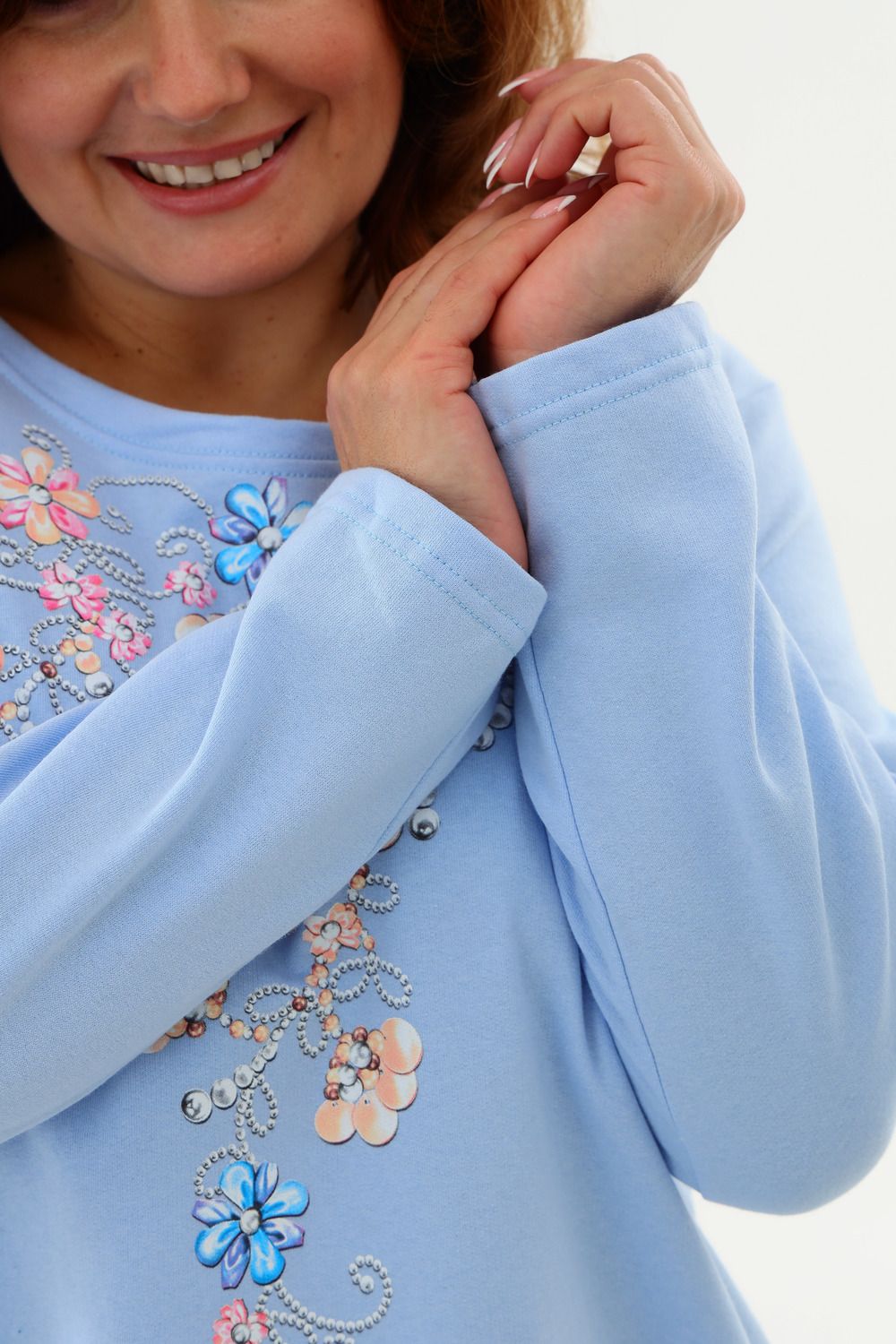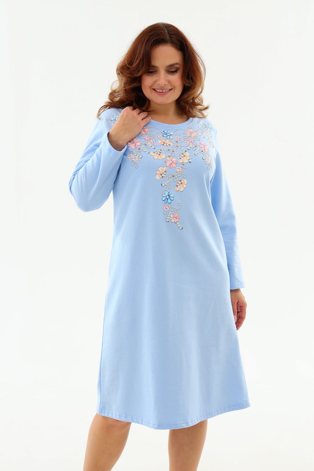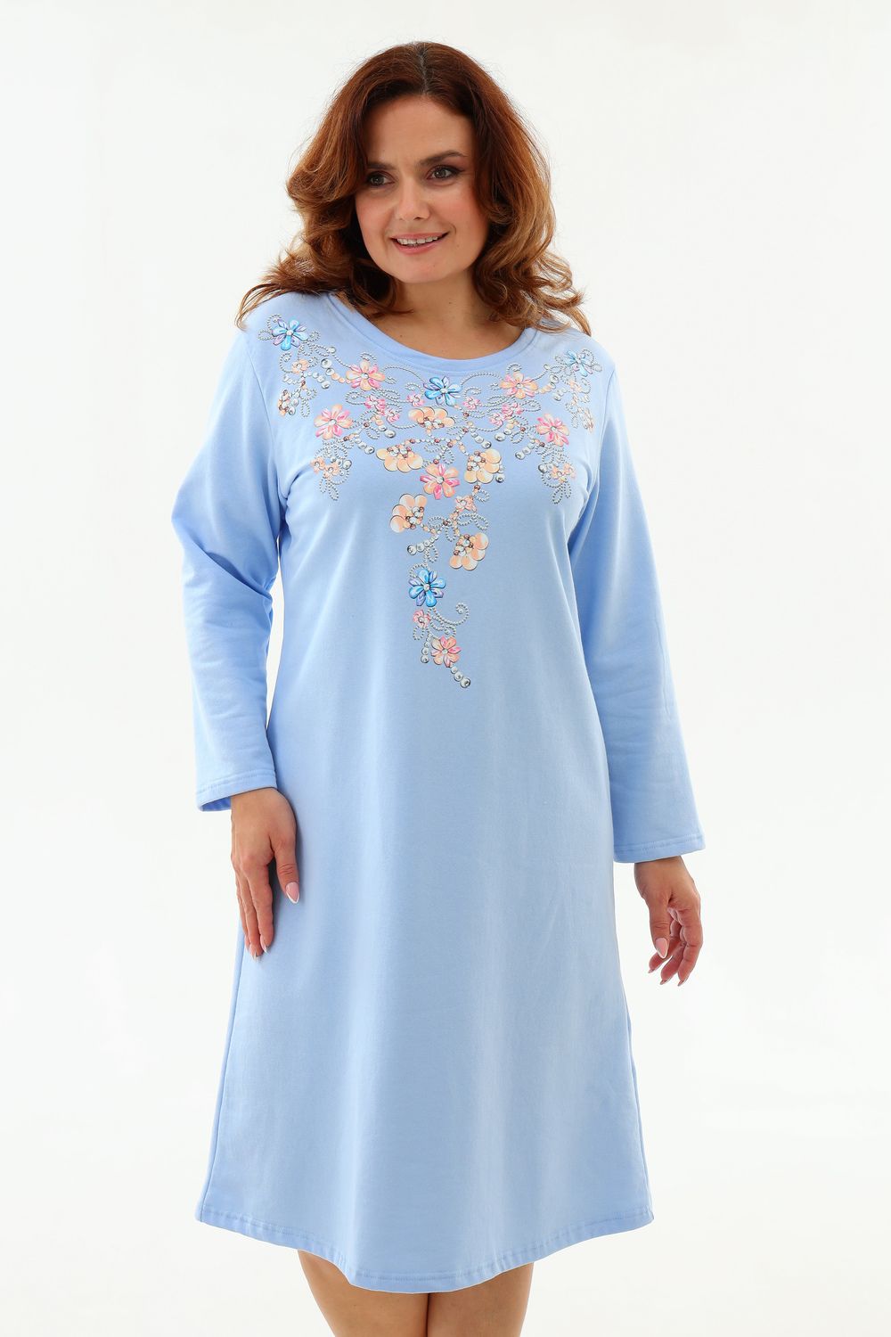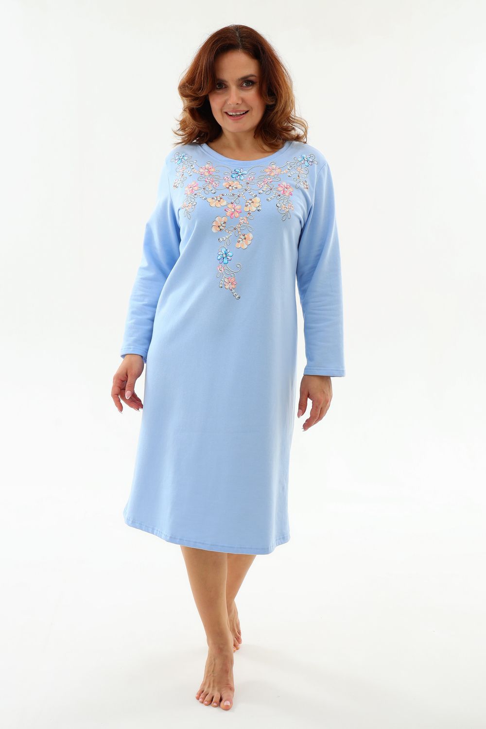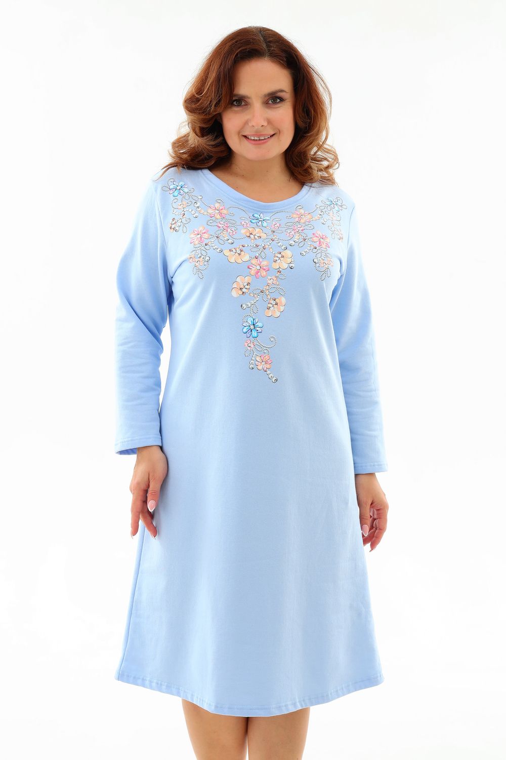Тёплая уютная сорочка из футера 2-х нитки с начёсом. Горловина обработана обтачкой и отстрочена плоским швом. Очень нежный принт в виде орнамента из цветов и жемчуга. Изнанка очень приятная к телу, так как в составе 100% хлопок. Носите с удовольствием !