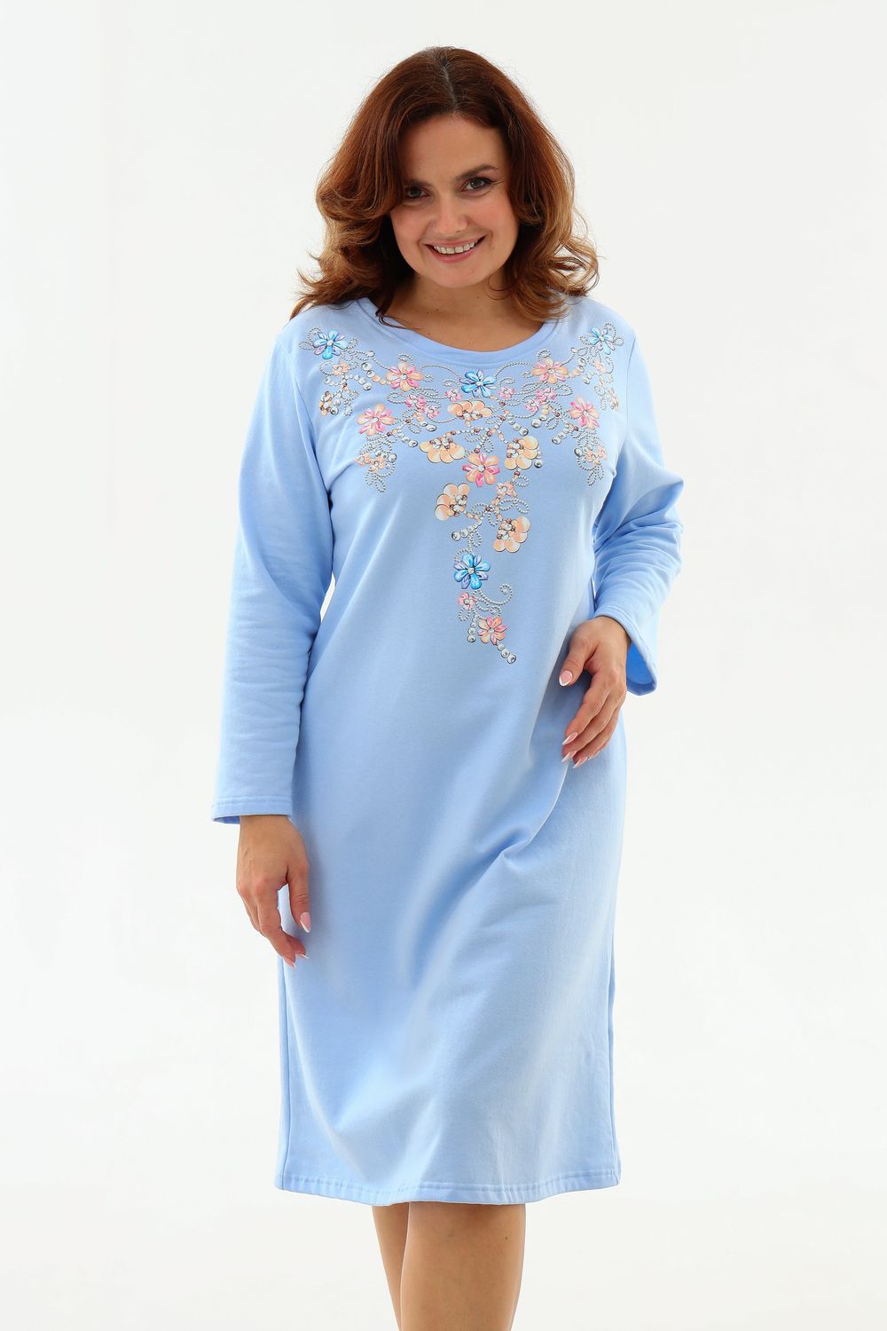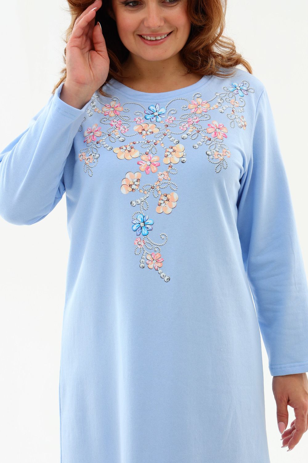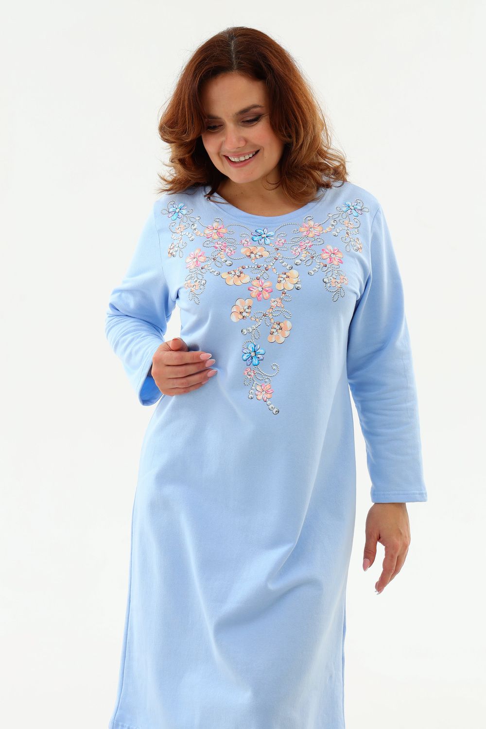 Тёплая уютная сорочка из футера 2-х нитки с начёсом. Горловина обработана обтачкой и отстрочена плоским швом. Очень нежный принт в виде орнамента из цветов и жемчуга. Изнанка очень приятная к телу, так как в составе 100% хлопок. Носите с удовольствием !