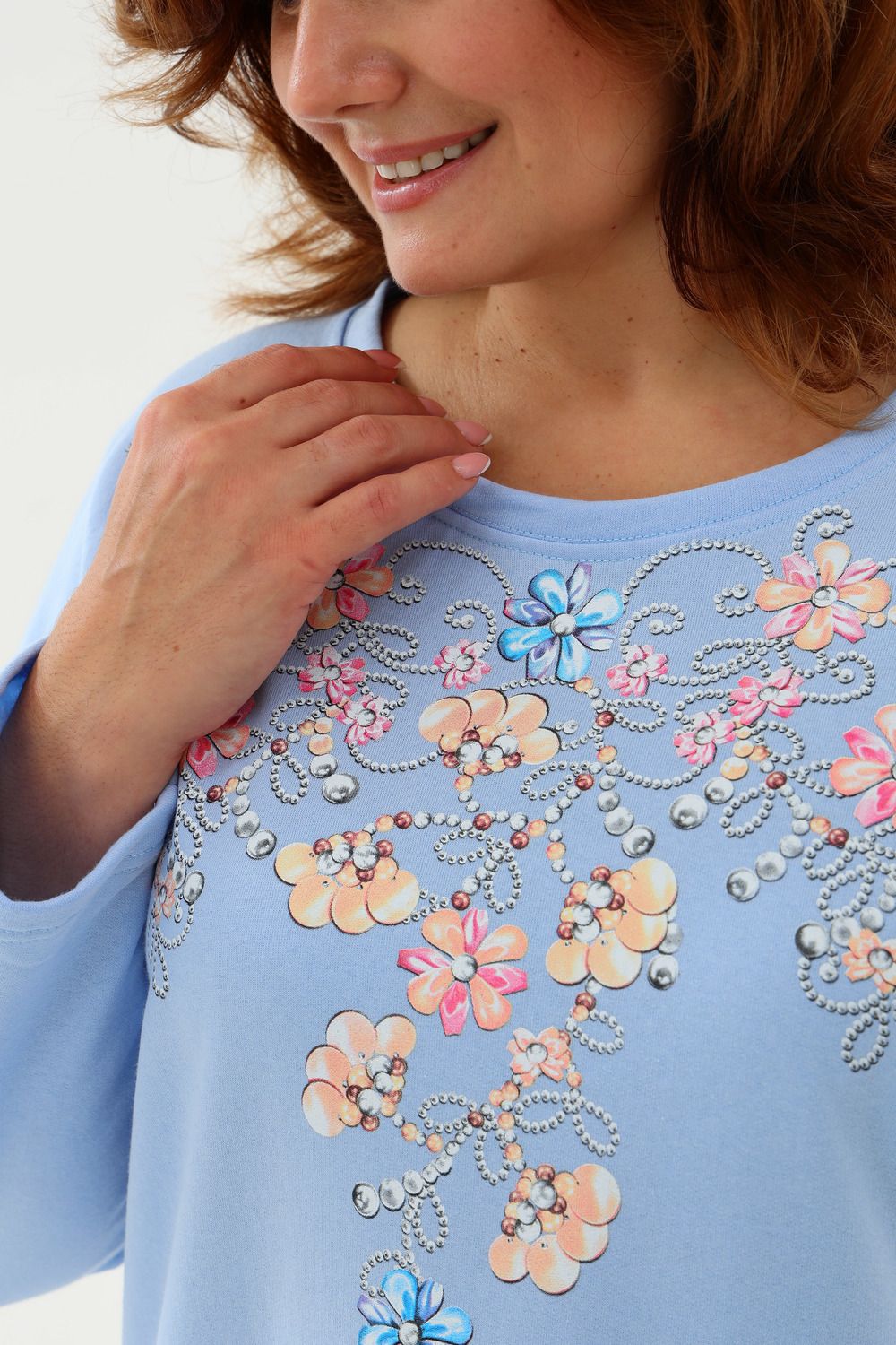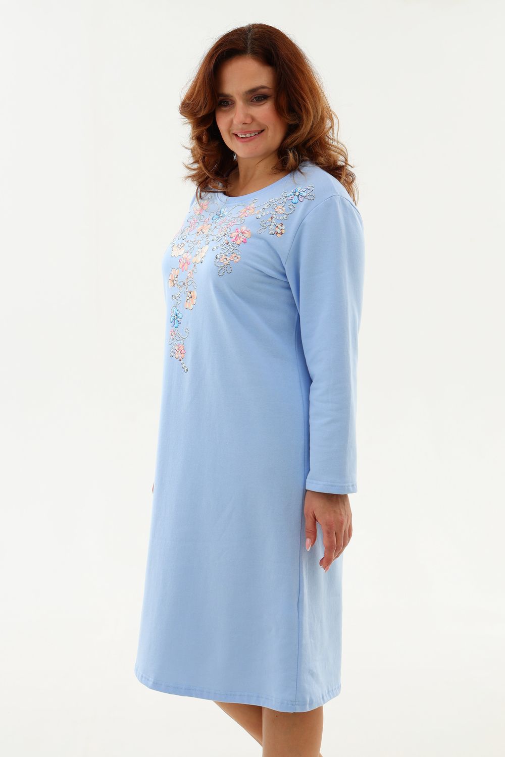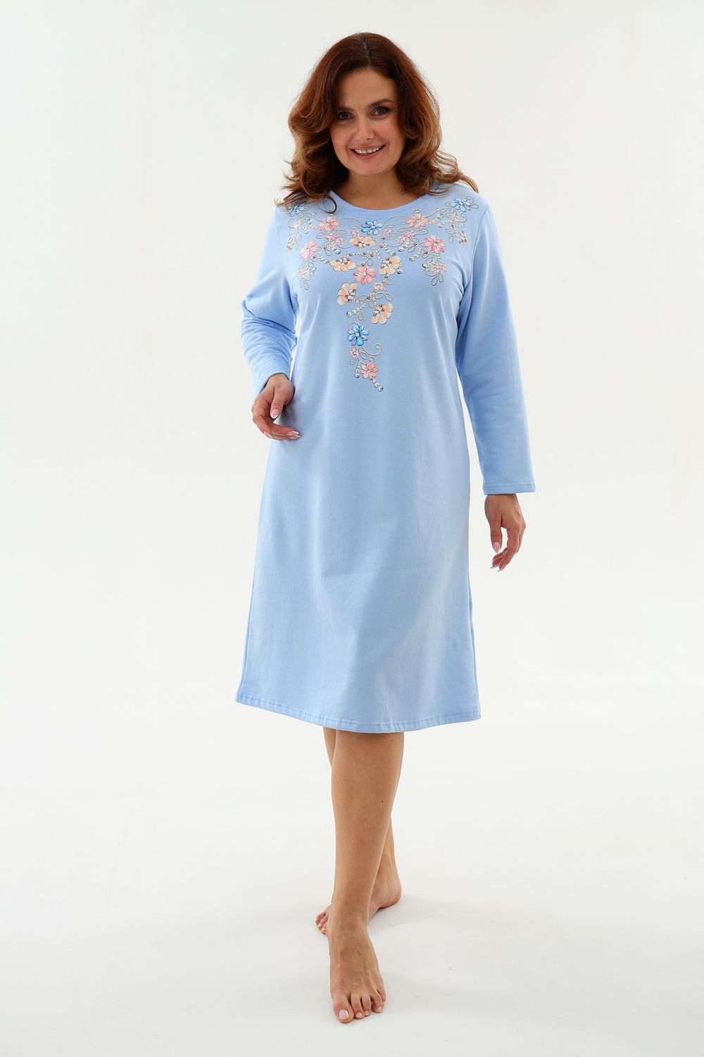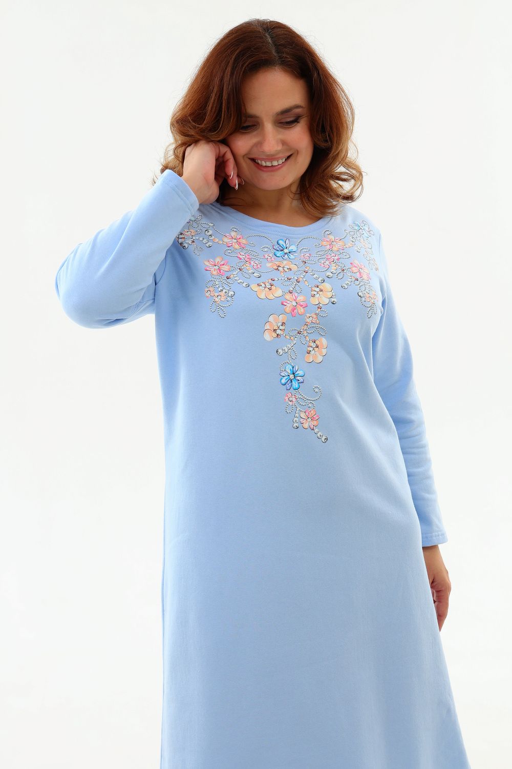 Тёплая уютная сорочка из футера 2-х нитки с начёсом. Горловина обработана обтачкой и отстрочена плоским швом. Очень нежный принт в виде орнамента из цветов и жемчуга. Изнанка очень приятная к телу, так как в составе 100% хлопок. Носите с удовольствием !